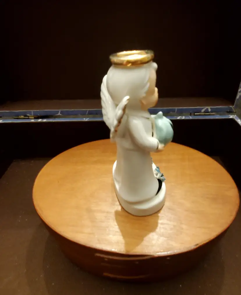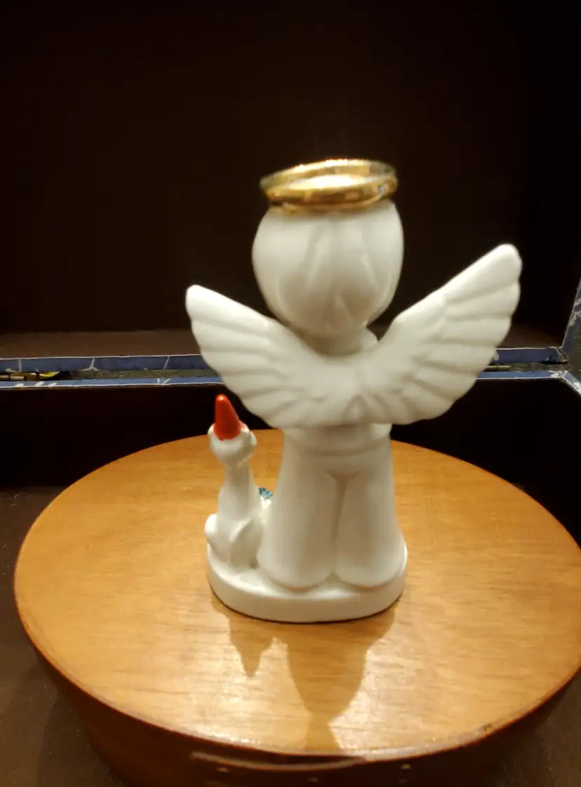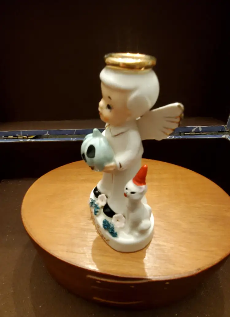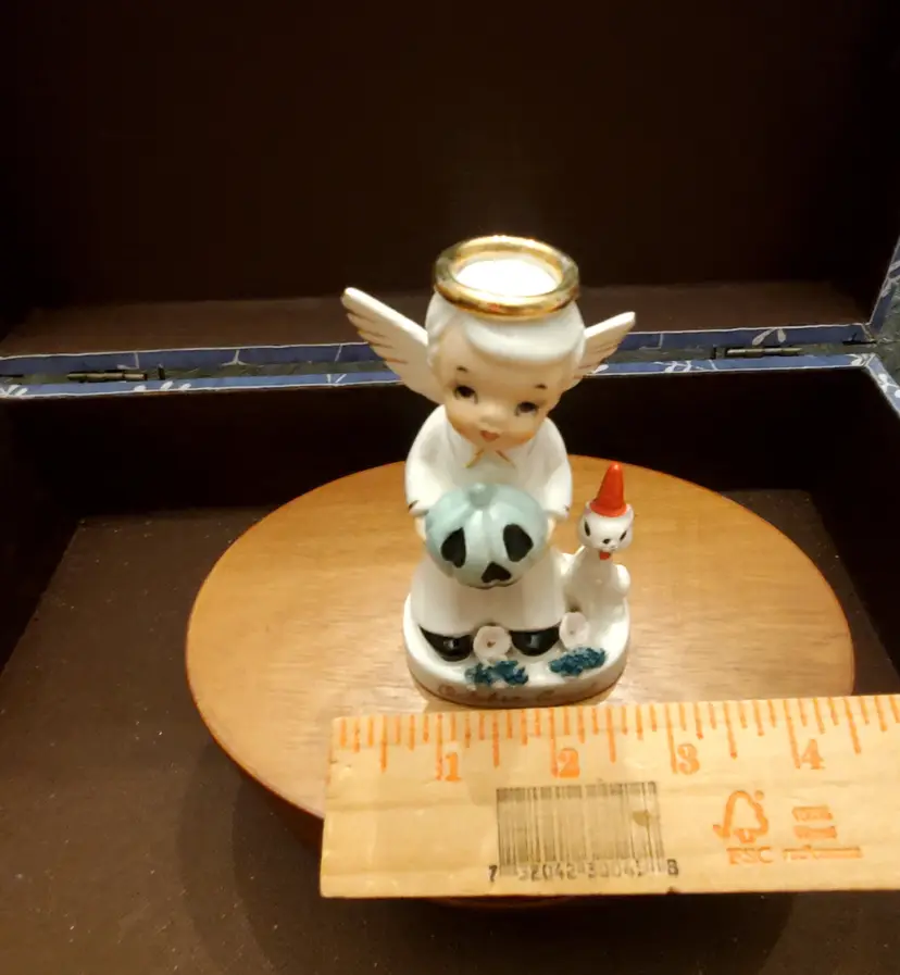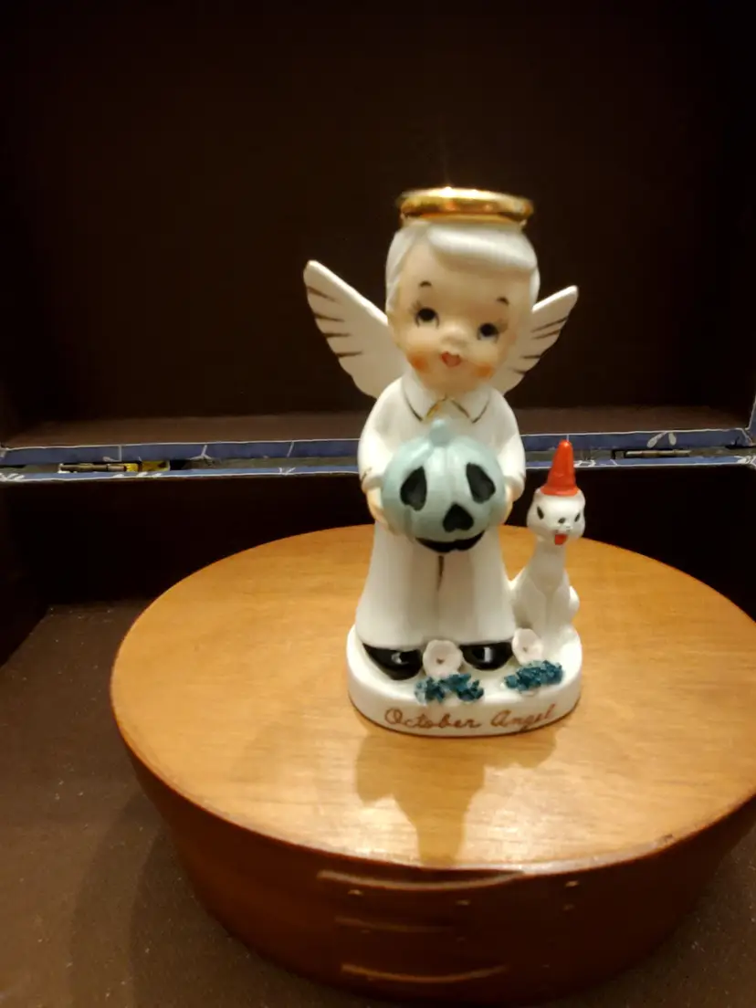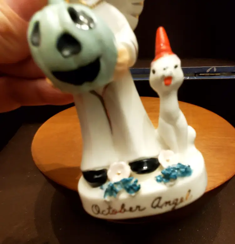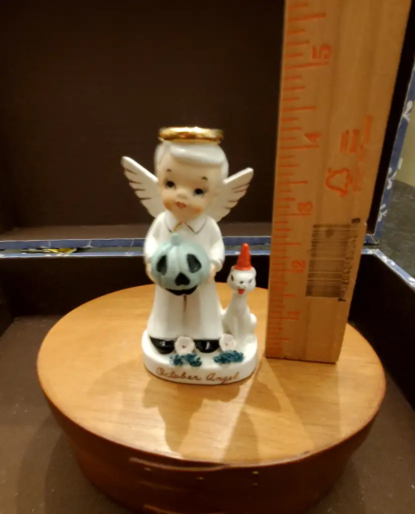 This is an adorable vintage ceramic figurine. Features an angel boy with a jack o lantern and a kitty cat. Approximate measurements in photos. No damage.