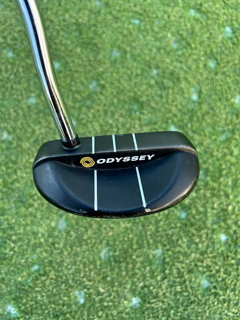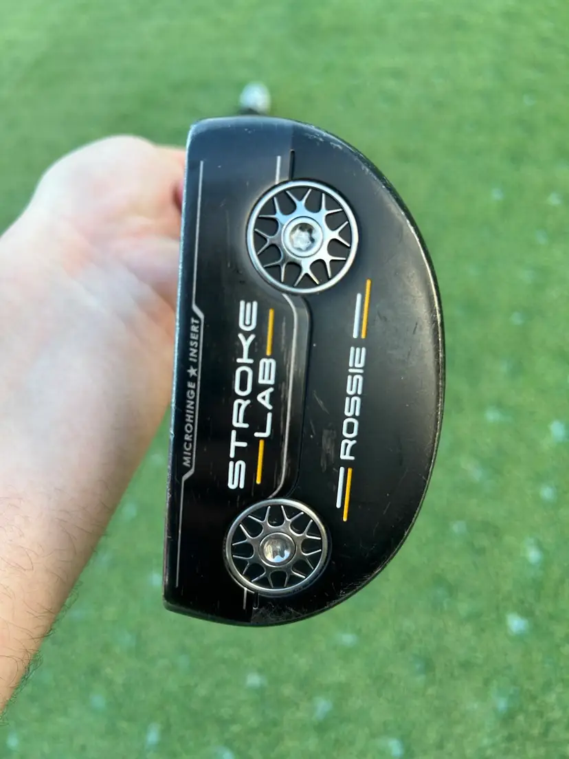 The product is a used right-handed Odyssey Stroke Lab Rossie 35" putter with a graphite and steel shaft. This unisex golf club is specifically designed for putting and is part of the Stroke Lab series, known for its innovative technology and performance. With a length of 35 inches, this high-quality putter is a reliable choice for golfers looking to improve their game around the green. This is a used club. See pictures for details