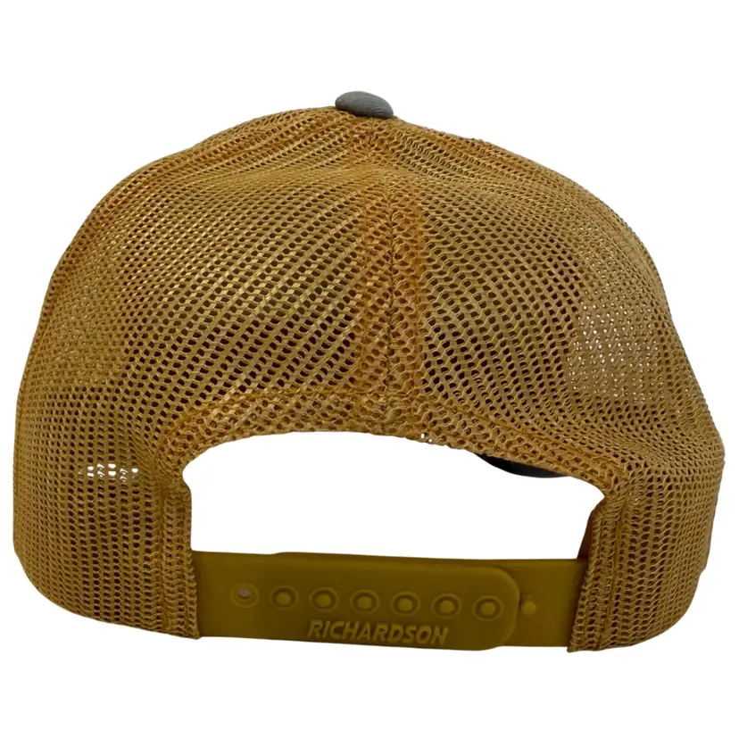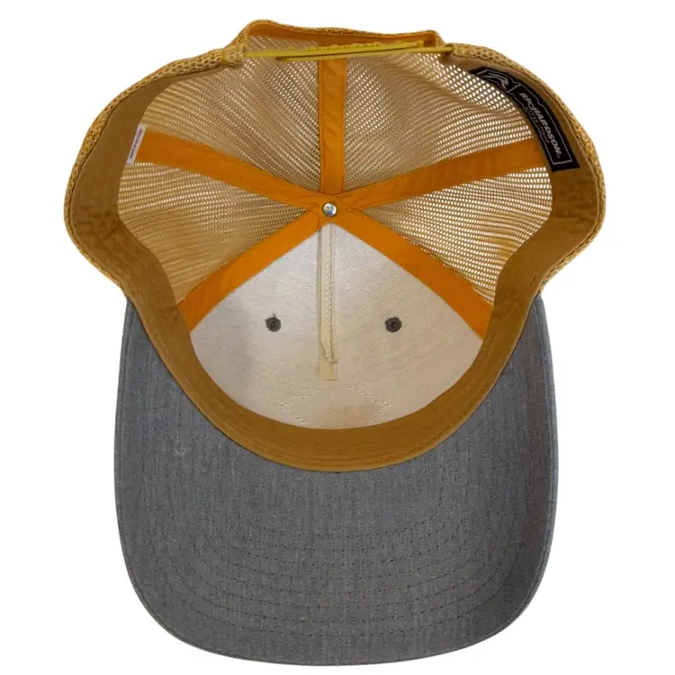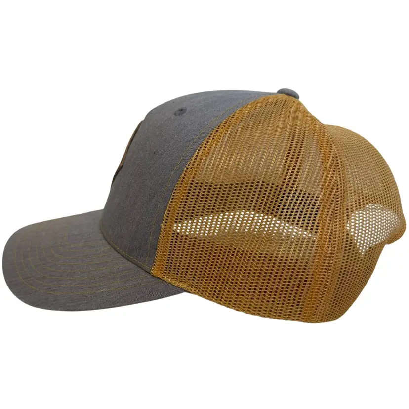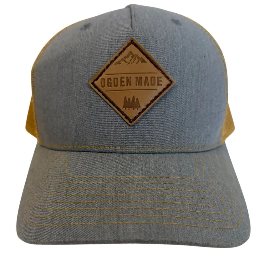 The Ogden Made Leather Patch Mountain & Trees Logo Outdoors Trucker Style Snapback hat by Richardson is a stylish and versatile accessory for both men and women. Featuring a solid gray and gold color scheme with a mesh back for breathability, this hat is perfect for outdoor activities, travel, or casual wear. The adjustable snapback ensures a comfortable fit, while the canvas fabric with a polyester and cotton blend material makes it durable for any season. Show off your love for adventure and nature with this unique hat designed for exploring mountains and trees.
