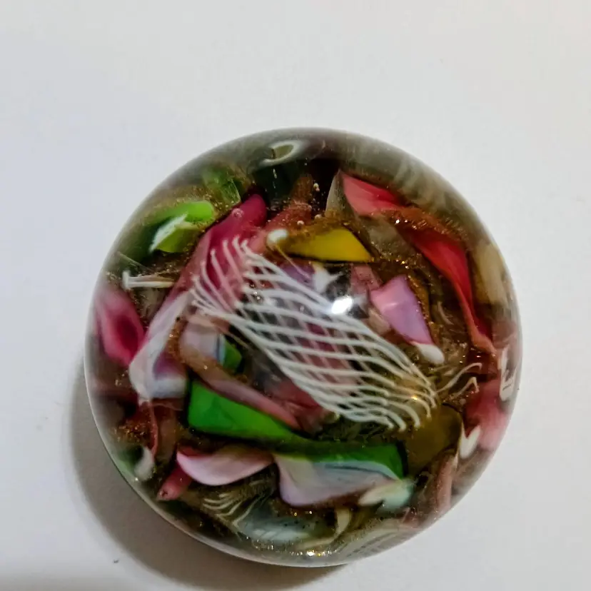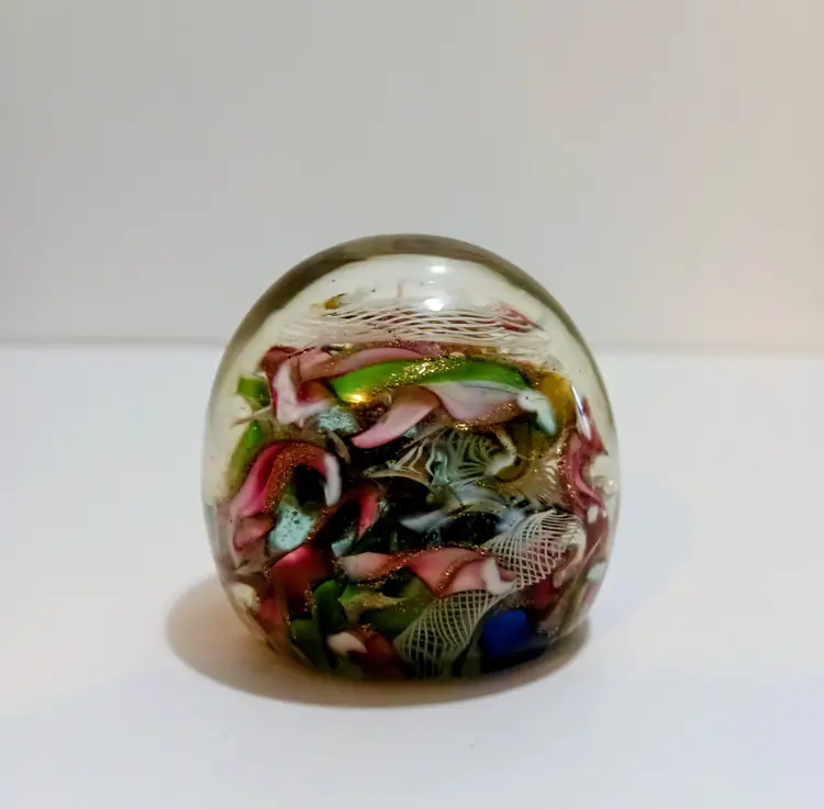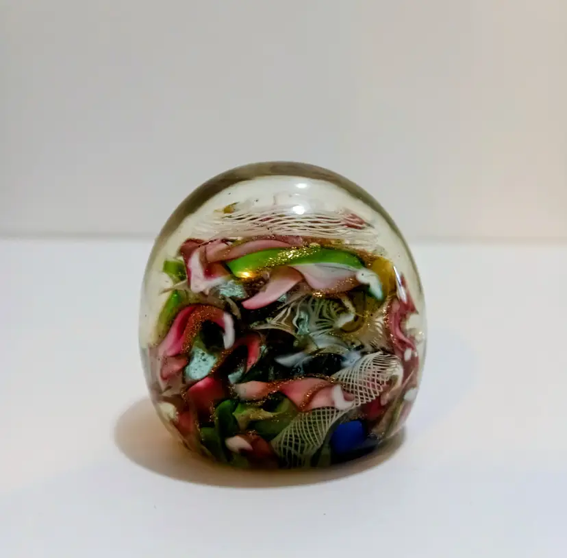 Stunning Murano Scramble Paperweight Featuring Latticino and Gold Glittering Aventurine; Highly Polished Bottom; Multi Colored Ribbons in Pinks, Greens, Blues & More! Very Nice Condition; No Chips or Cracks or Bruises; Minor Scratching on Bottom Consistent w/Age; 2" Diameter; 2" T