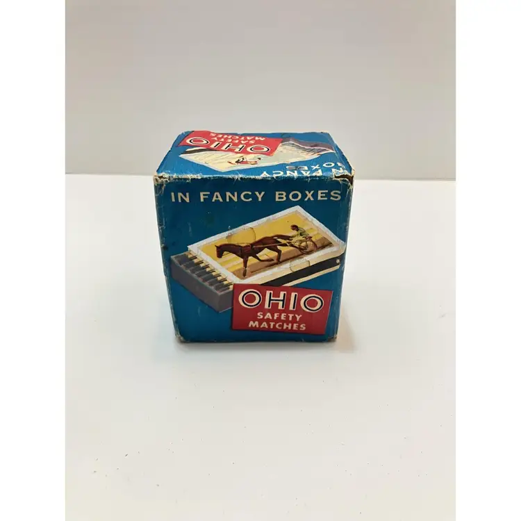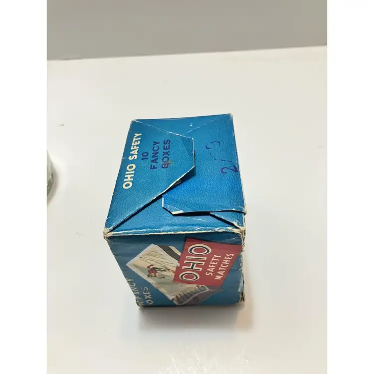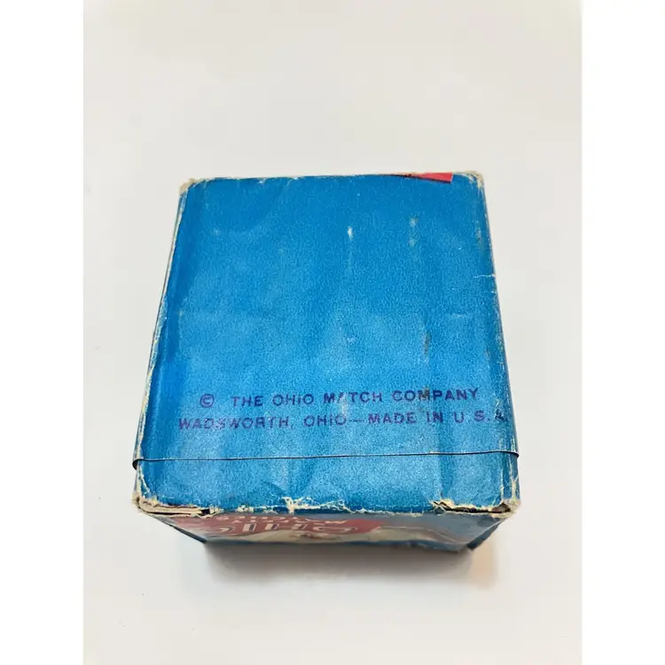 This box of matches still has the original wrapping. Pretty good condition. Pics reflect that one side is slightly pulled but still sticking to the box. Measures 3" by 2.25".