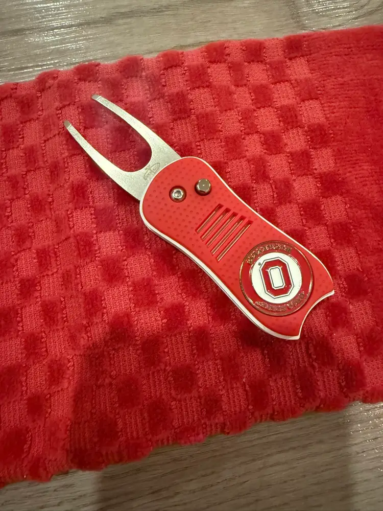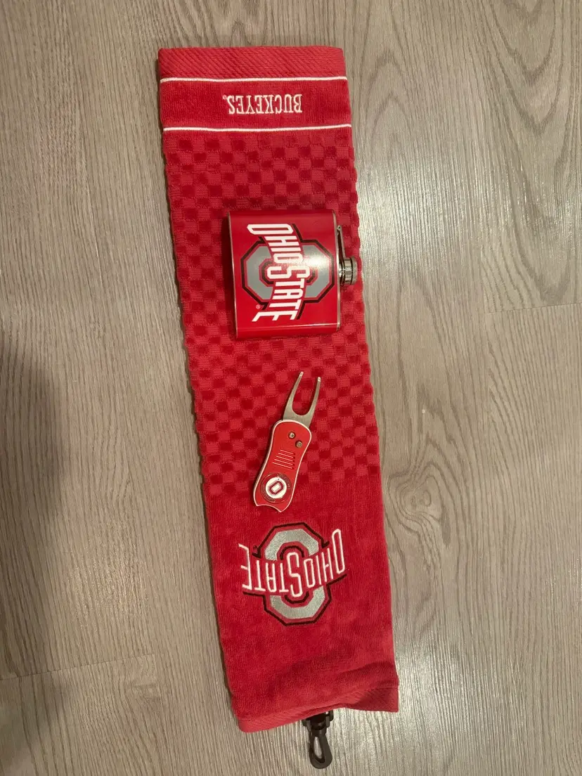 Includes brand new OSU microfiber golf towel; quality divot tool with removable magnetic ball marker, and small drinking flask. $8 shipping