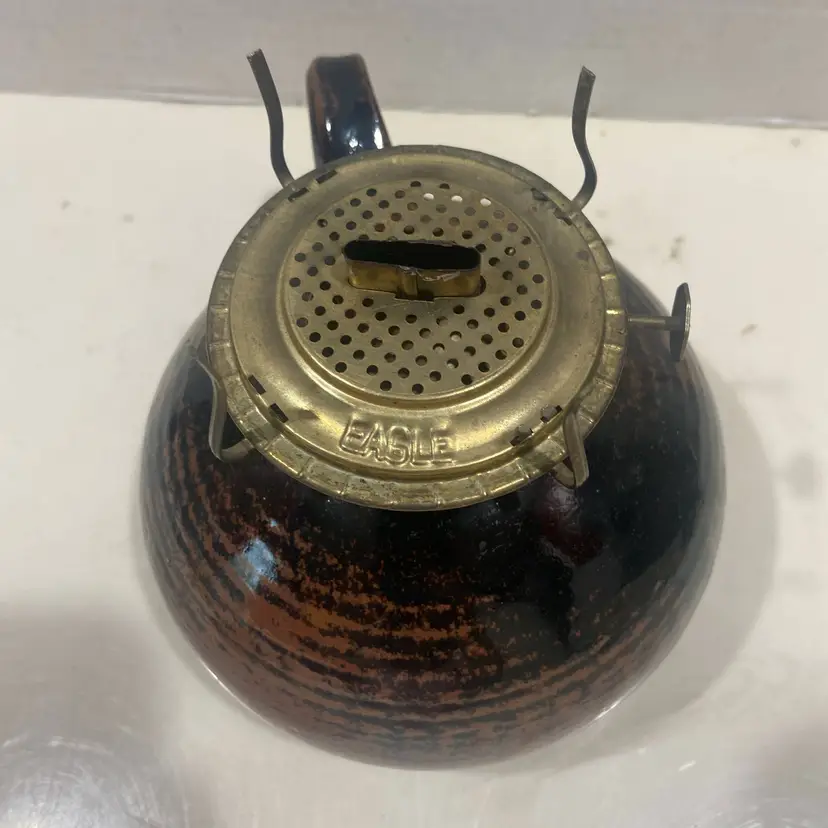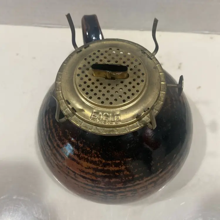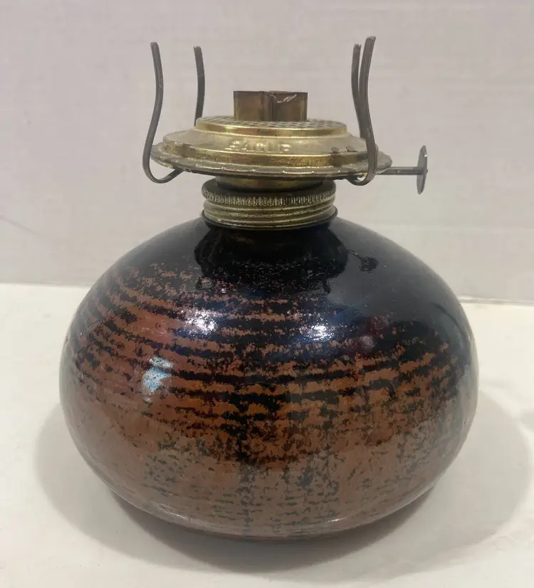 Oil Lamp Brown Stoneware bottom only w/handle eagle burner great glaze 6" round x 6"