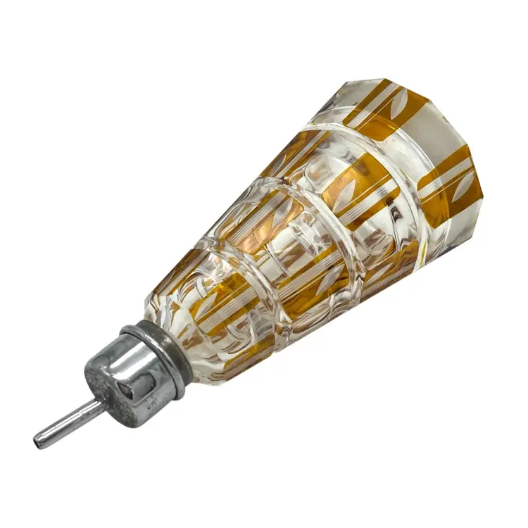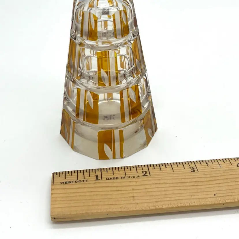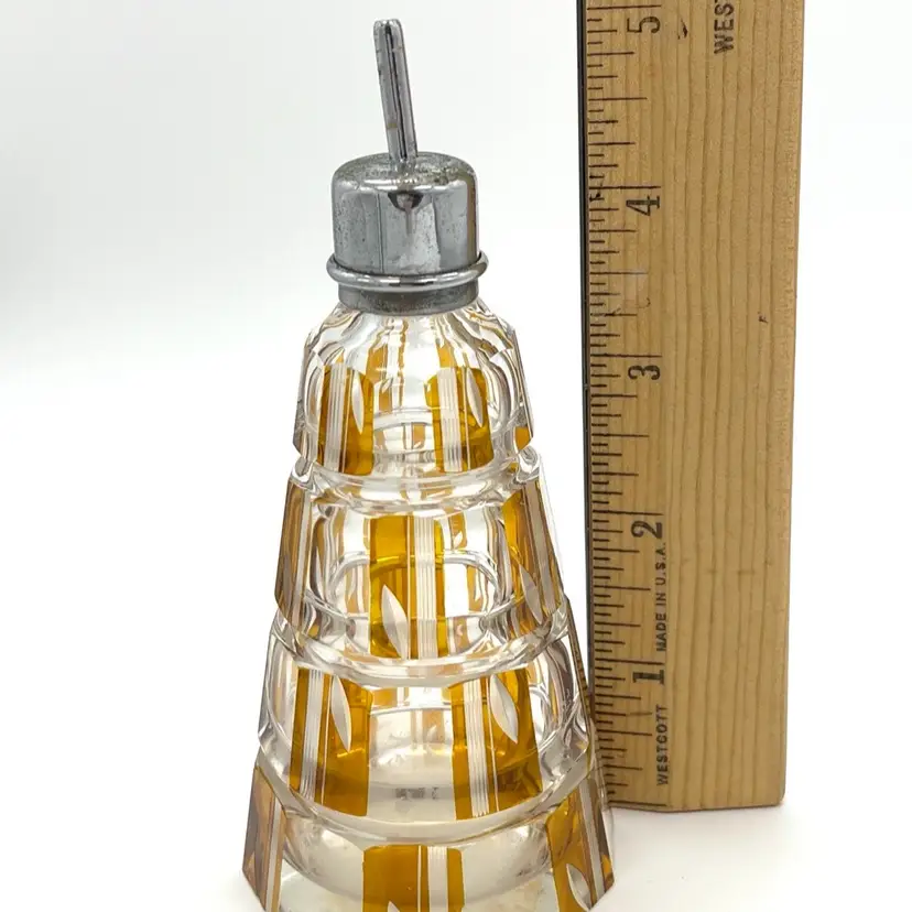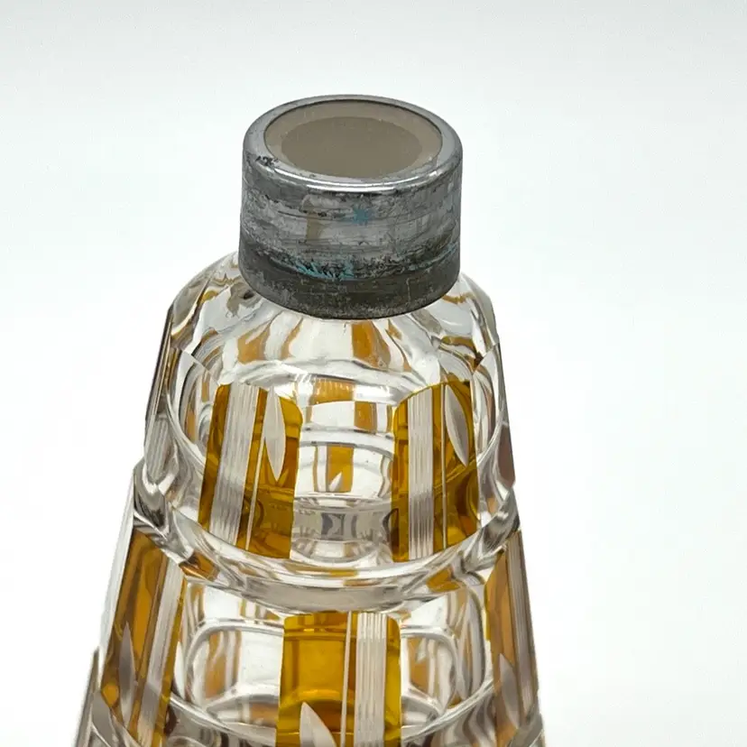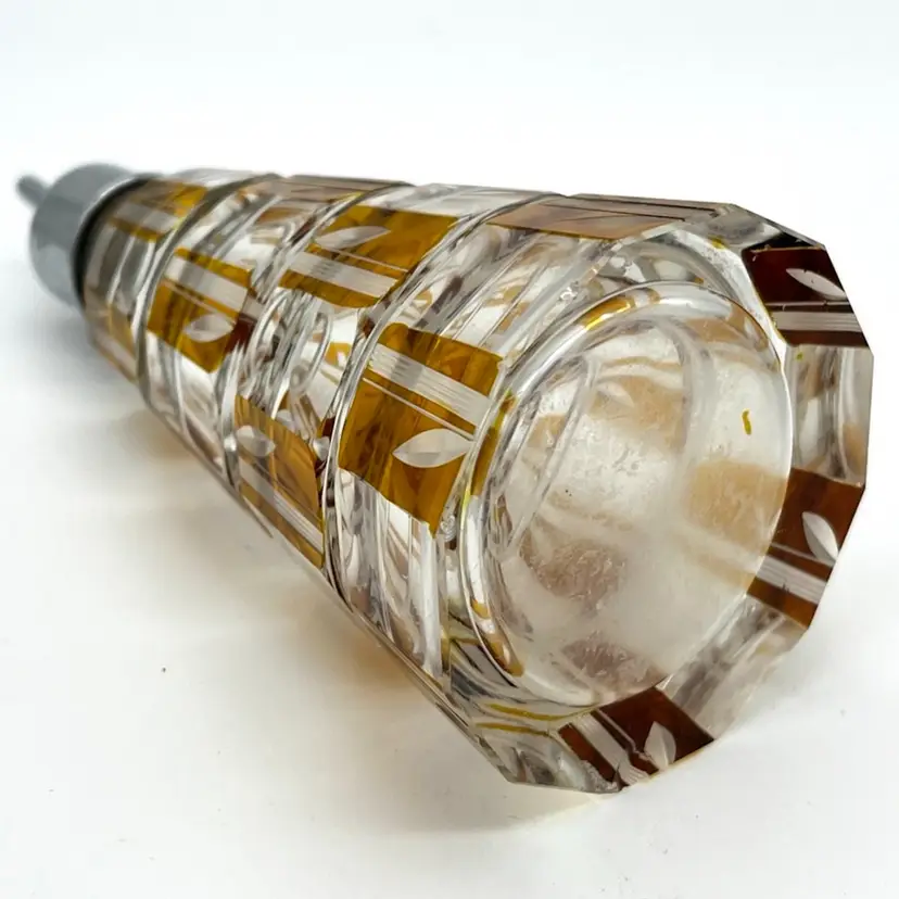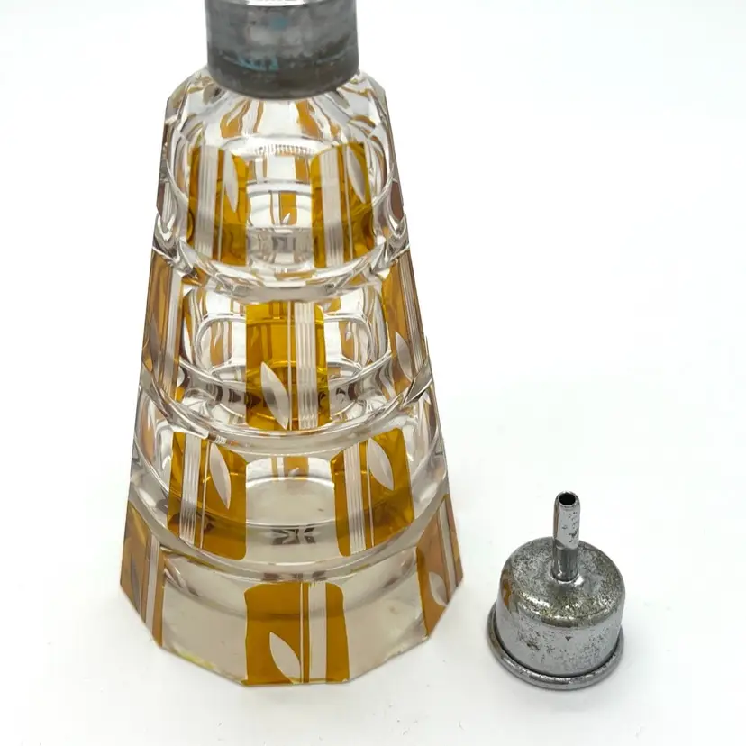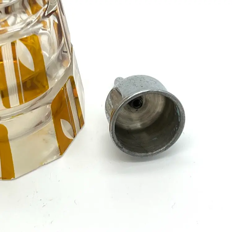 Beautiful old heavy cut-to-clear cut glass perfume bottle with amber yellow. I believe this was originally an atomizer but it's missing the atomizer part of the cap. Probably dates to the 1930s-40s. This would be beautiful in a window sill with the sunlight shining through!
