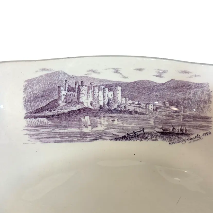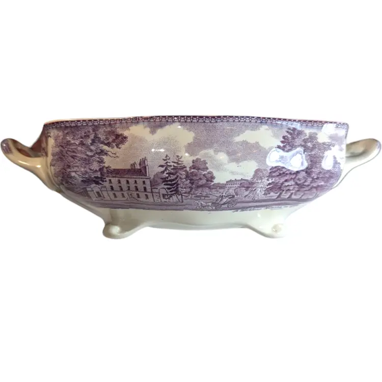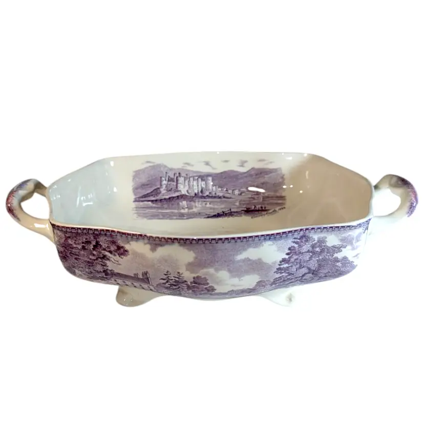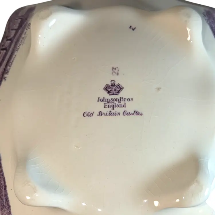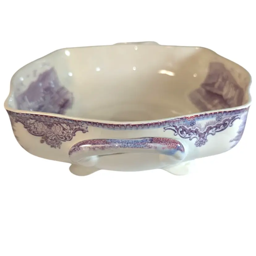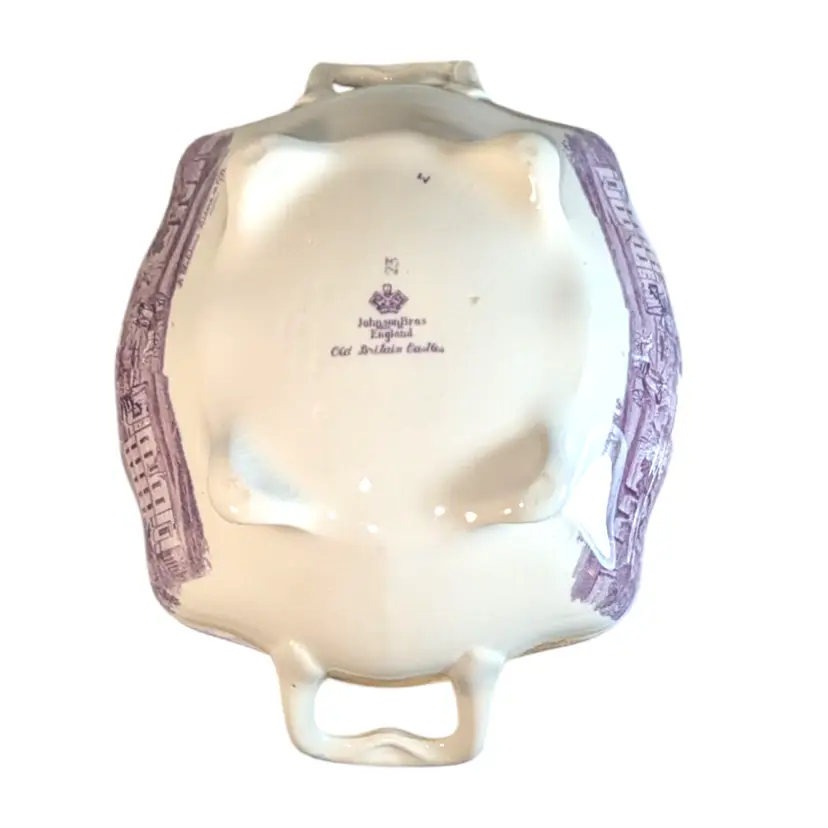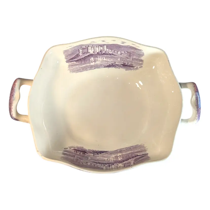 Old Britain Castles Lavender (not ribbed) Square Vegetable Bowl, no lid, 2 handles, 4 footed Pre-owned in good overall condition no chips or cracks Width: 8 1/2 in Height: 2 3/4 in Crafted In England Hand Wash Discontinued Piece