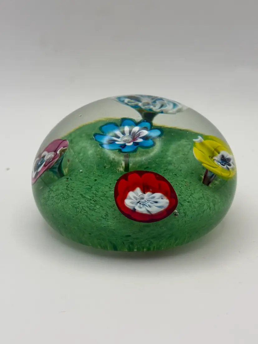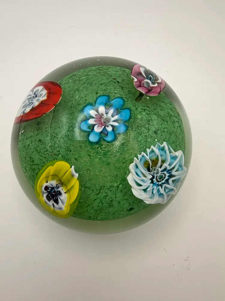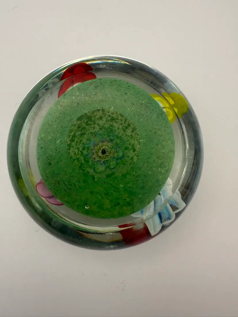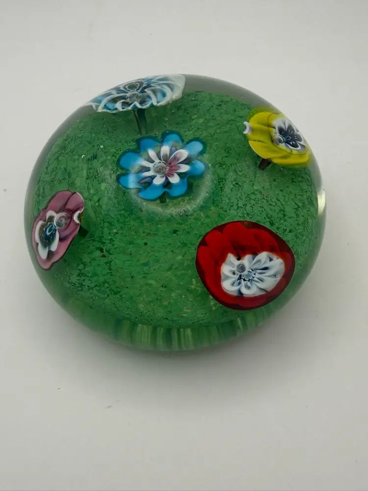 Old Murano Glass Paperweight measures about 3 1/4" diameter and 2 1/8" tall. 5 floral murines with air bubble center extend up from green base. 3-1/4 “in diameter by 2-1/8” No chips or cracks
