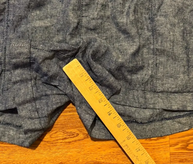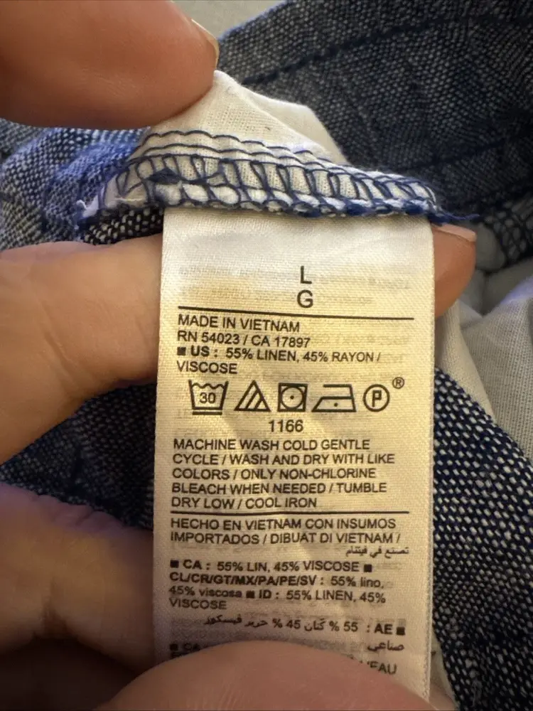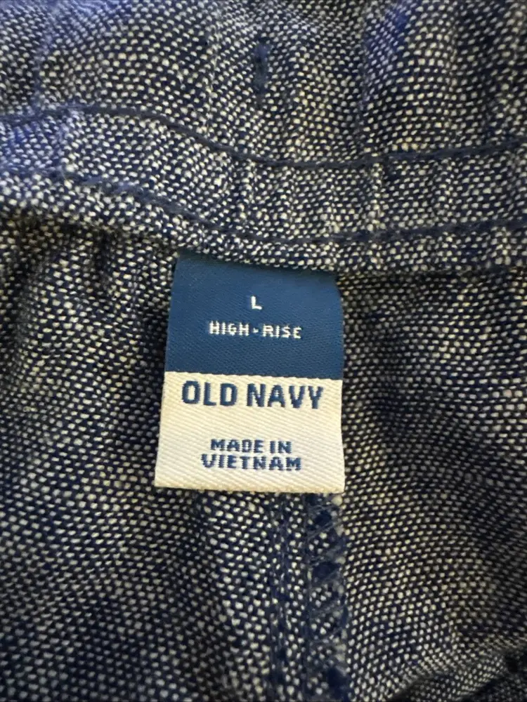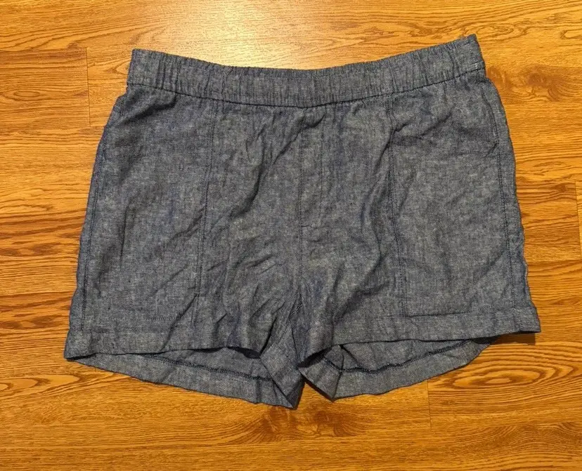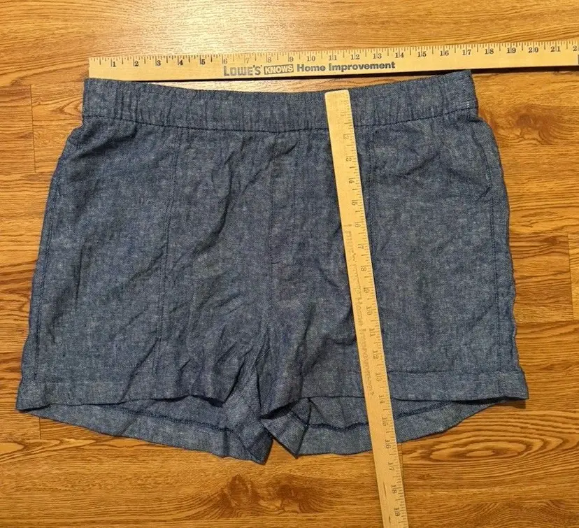 Get ready for summer with these Old Navy Chambray Linen Blend High Rise Shorts in size L. The blue color and solid pattern make them a versatile addition to your wardrobe. The pull-on closure and flat front design provide a comfortable and casual look, perfect for outdoor activities like walking or going to the beach.
