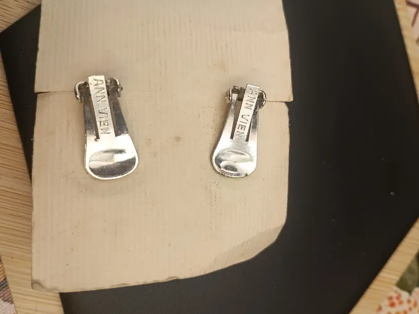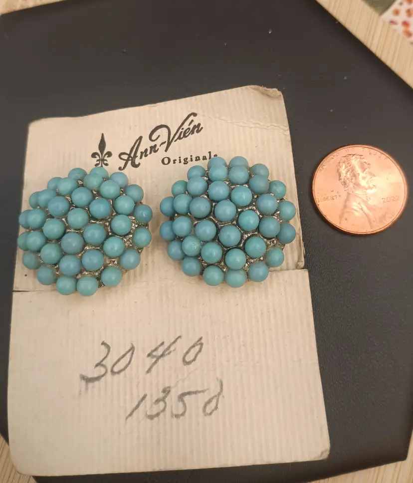 Hi. You will receive one pair of old stock earrings made by Ann Vien. She was a costume jewelry designer in Atlanta during the 1940/50s. These earrings are on the original paper with stock number. They are made of turquoise glass and stainless steel clip on backings. They are approximately 1 inch or 25mms. They are in great vintage condition.