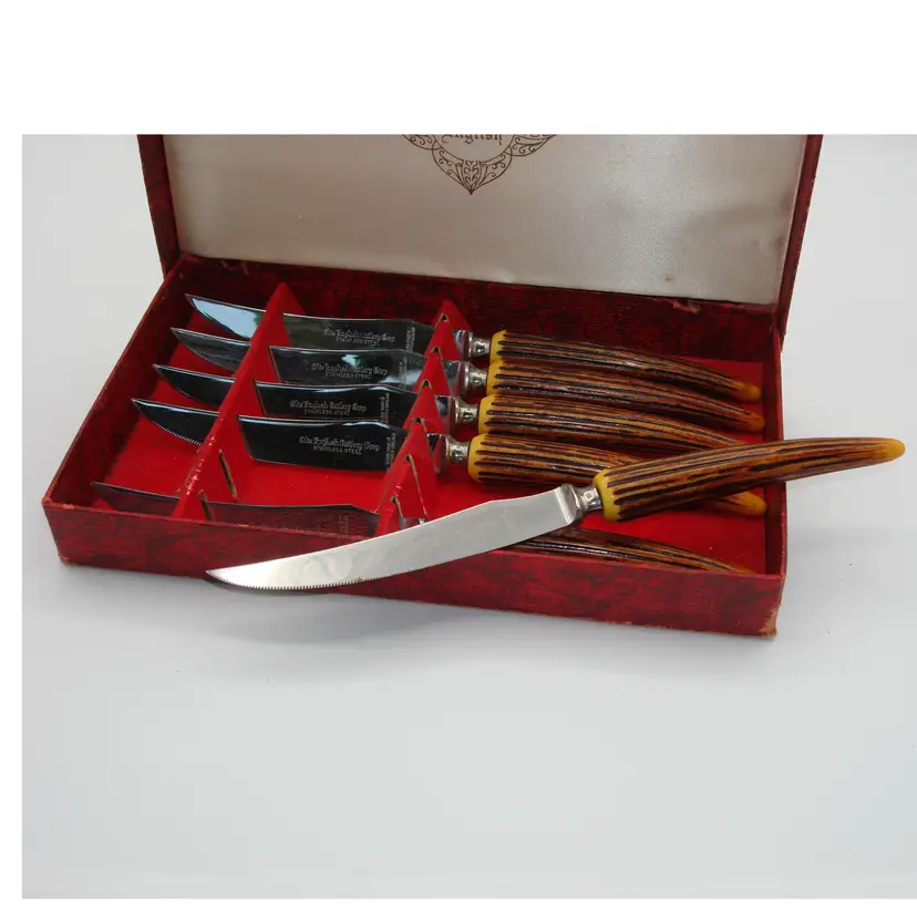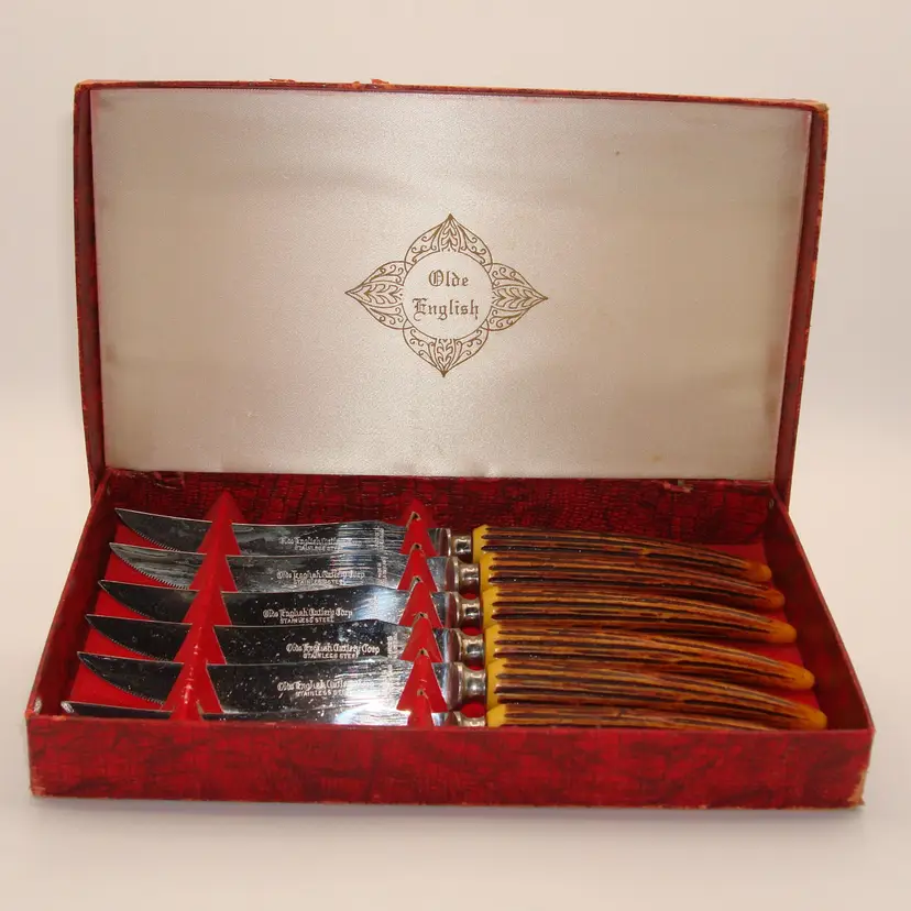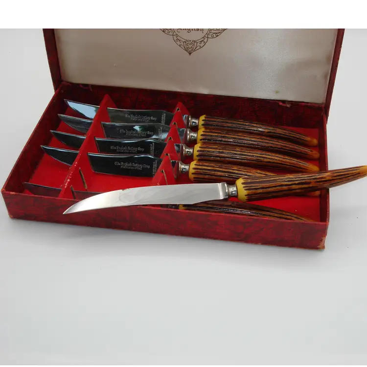 This is a set of 6 steak knives from the Olde English Cutlery Corp. Stainless steel blades were made in England. Origin of handles (plastic faux deer antler) is not specified.