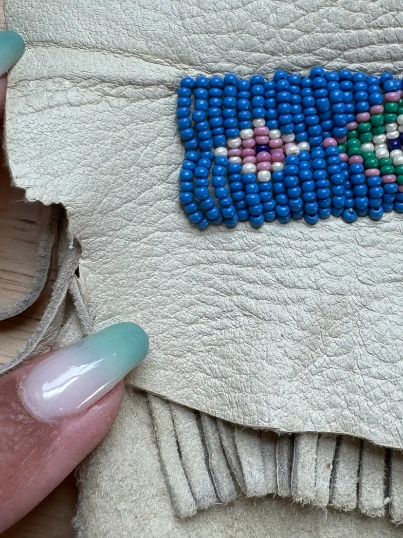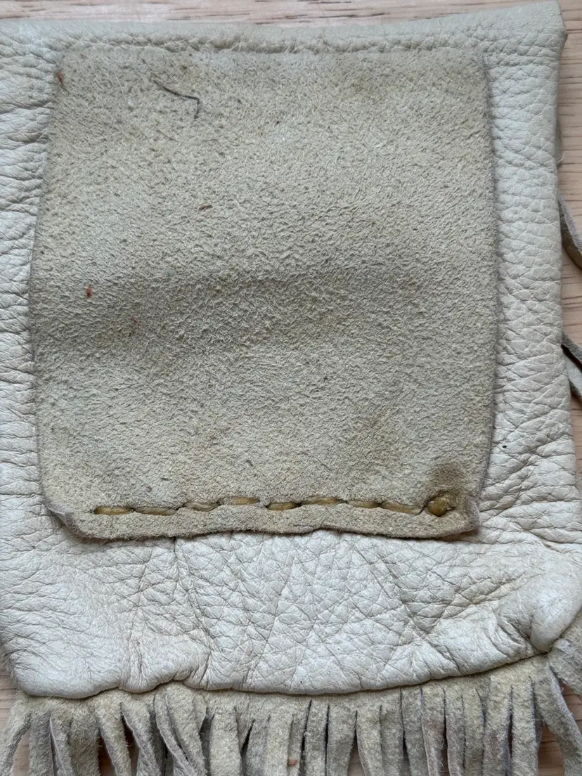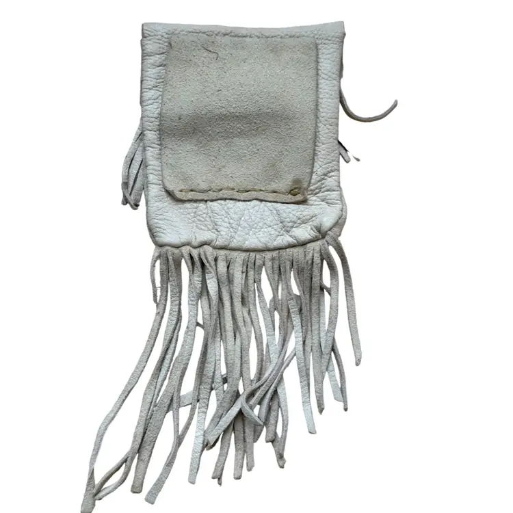 Older Medicine Bag White Leather With Seed Bead. Stamped handcrafted by David Dalten. Has a little damage. See photos. Bag without fringe is approximately 6 x 8”.