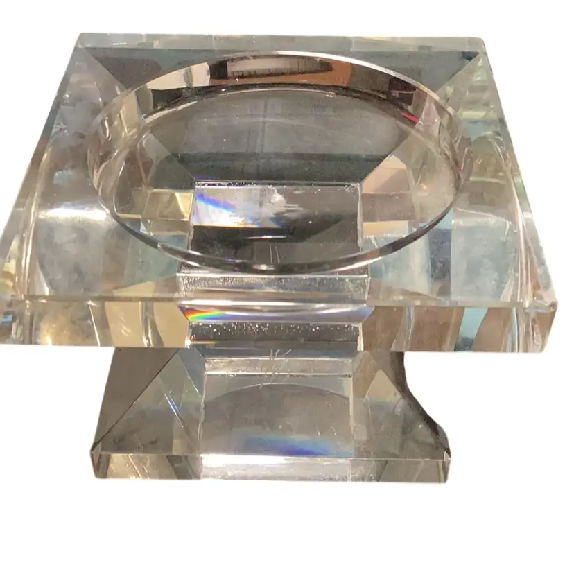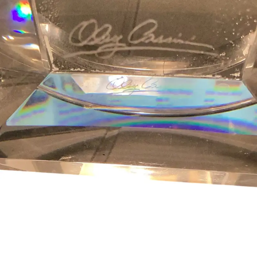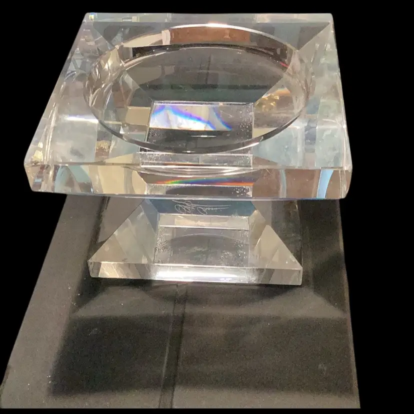 Oleg Cassini signed Crystal pedestal pillar candle display base. This item is signed. No chips or cracks. It’s a beautiful glass piece excellent condition. Stunning crafted from heavy leaded cut glass with incredible clarity and brilliance. This piece is designed to pillar candle or decorative orb, but also functions beautifully as a display stand for perfume bottles, crystals, or other collectibles