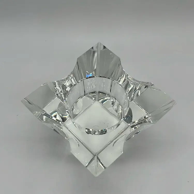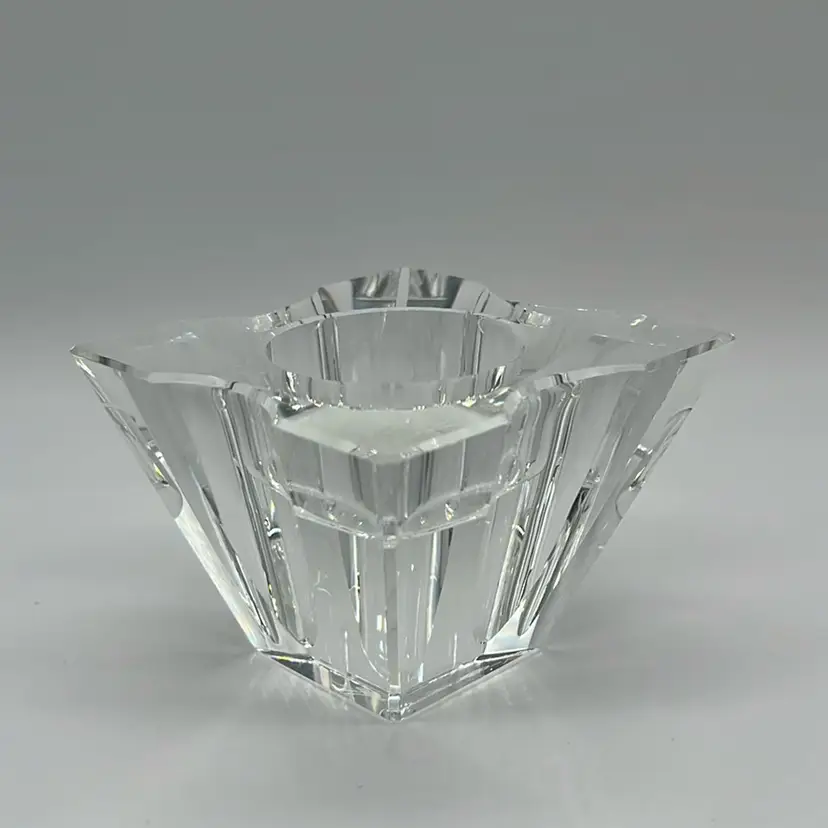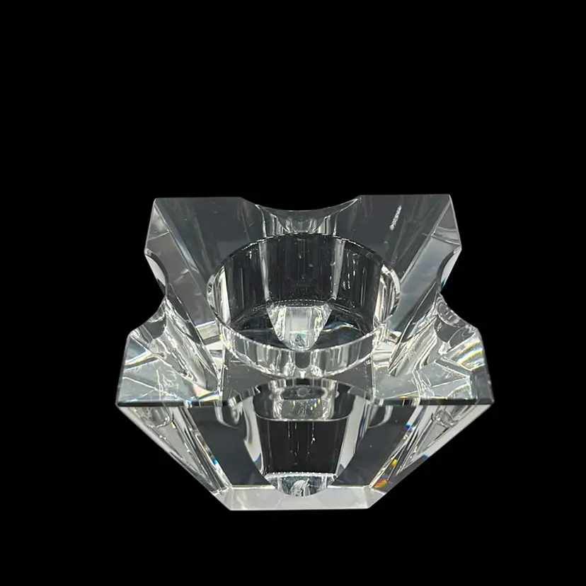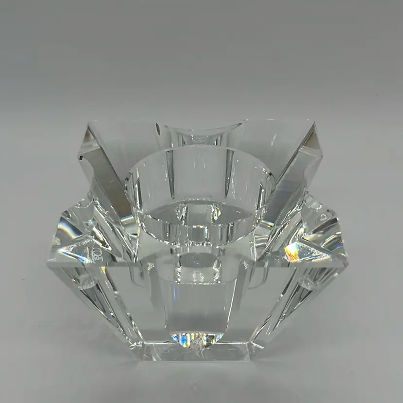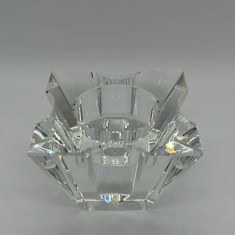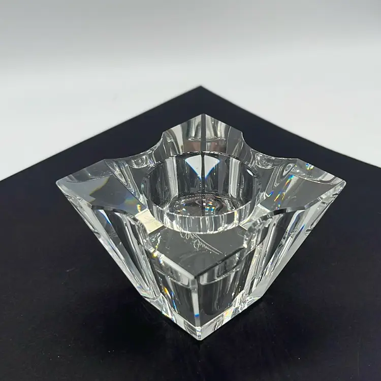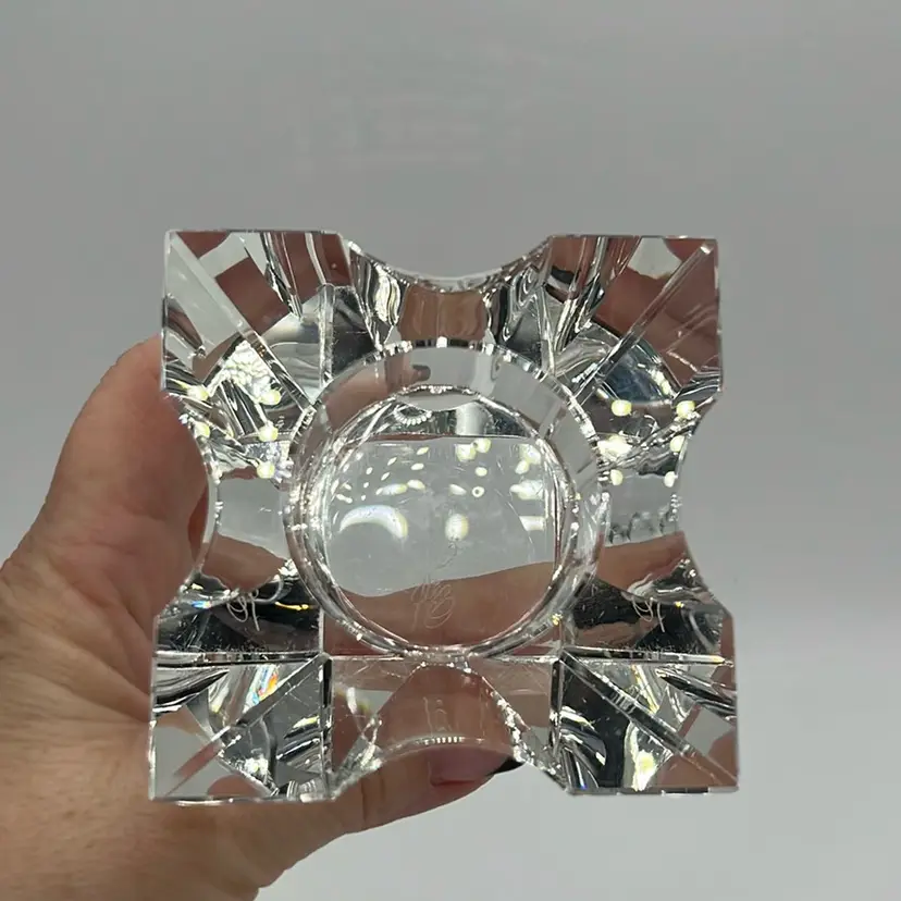 Beautiful crystal signed Oleg Cassini Candle Holder. Some minor surface scratching on bottom. No chips or cracks. Good condition! Could be used to display a paperweight!