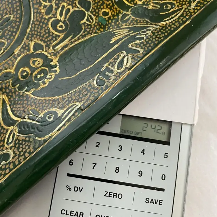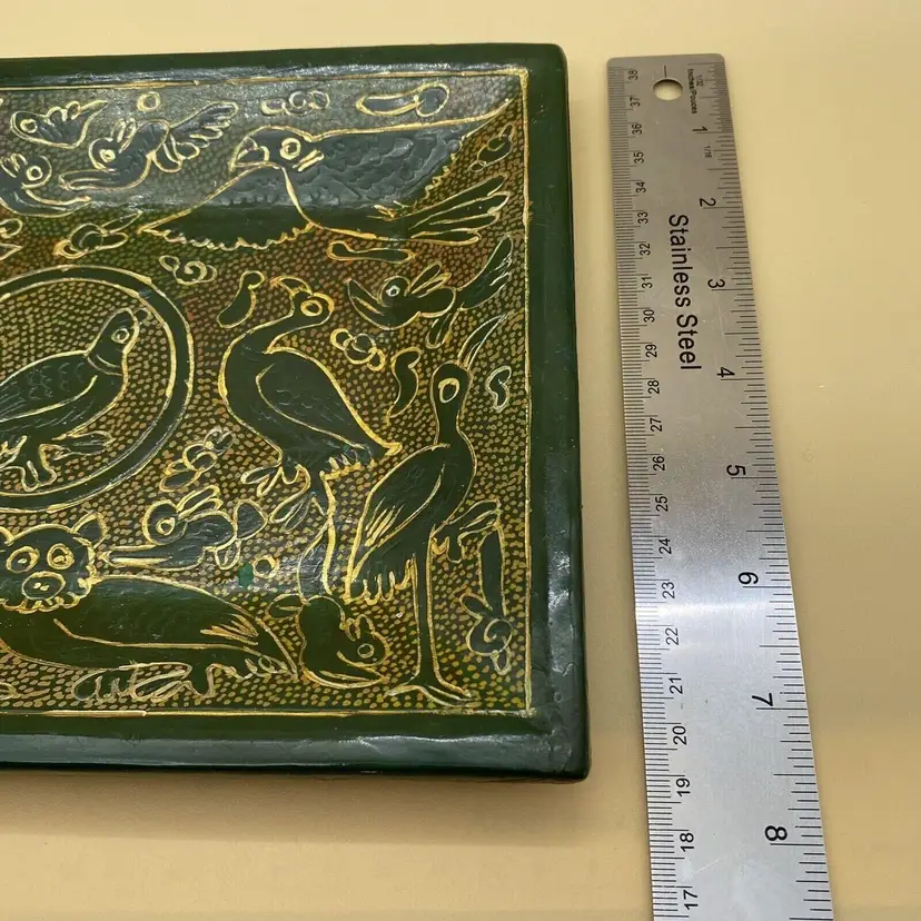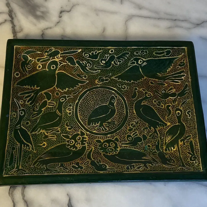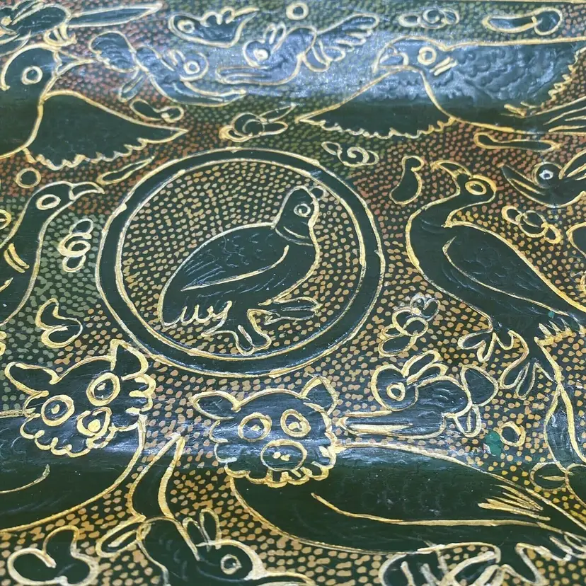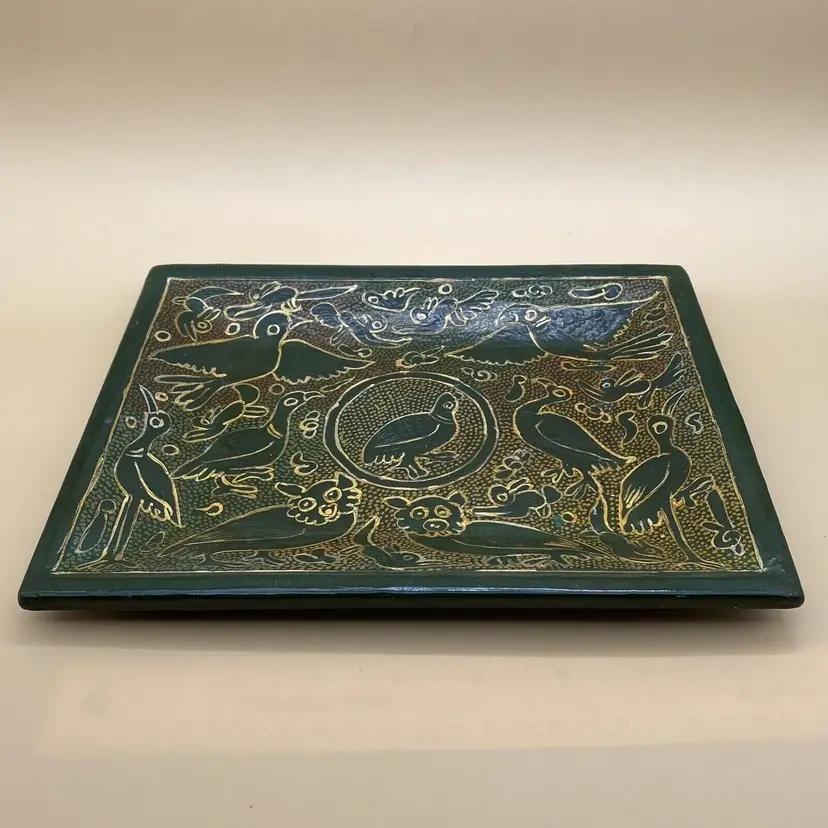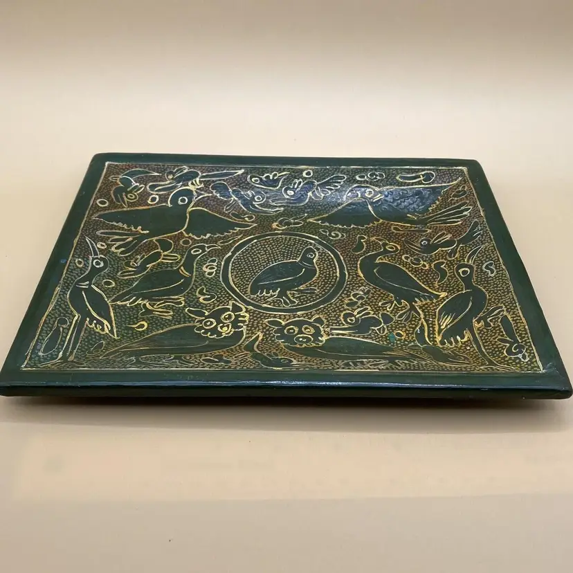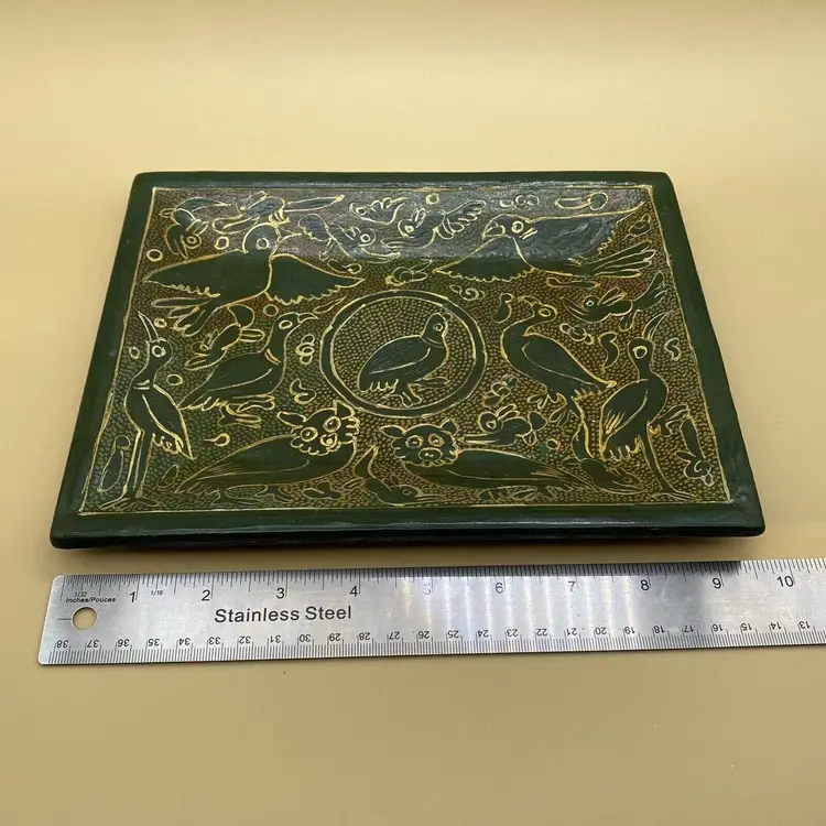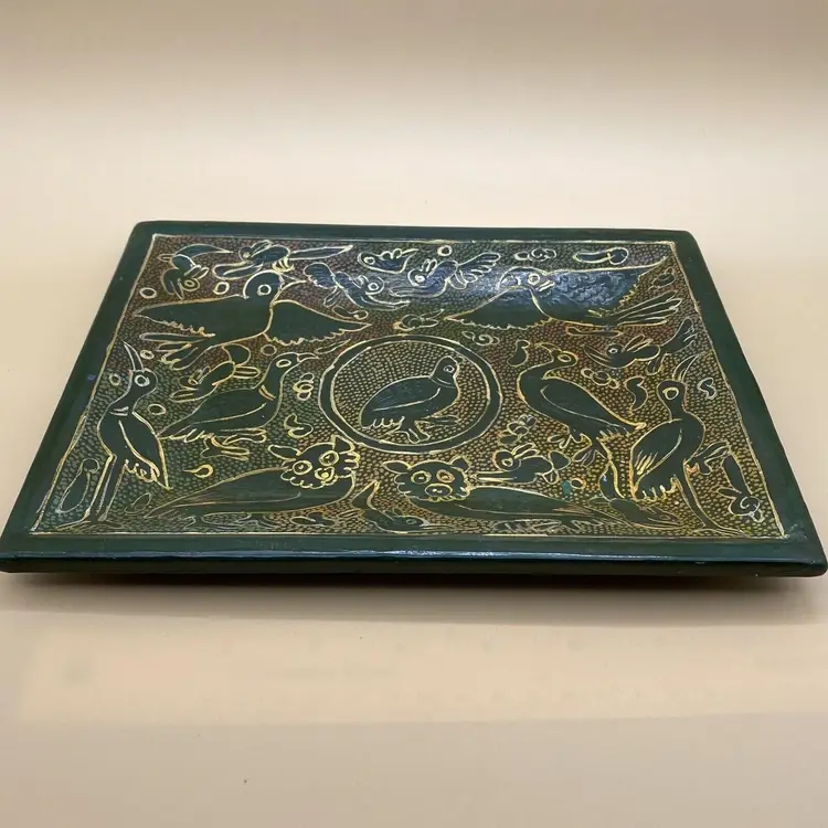This vintage Olinala Mexican serving tray is a unique piece of folk art that showcases the culture and craftsmanship of Mexico. Handmade and featuring intricate details, this tray is adorned with birds and animals and is finished with a stunning green and gold linaloe design. Although the ownership history is unknown, this tray is believed to be crafted in Mexico and is a perfect addition to any collection of Latin American or cultural artifacts. Its size and design make it both functional and decorative, making it a perfect piece for any home or as a gift for a collector.
