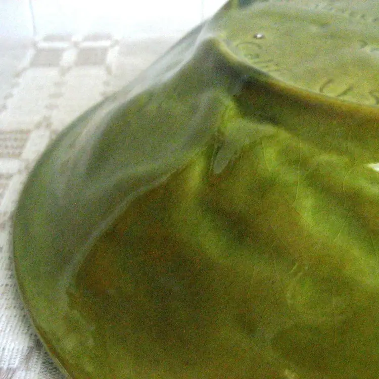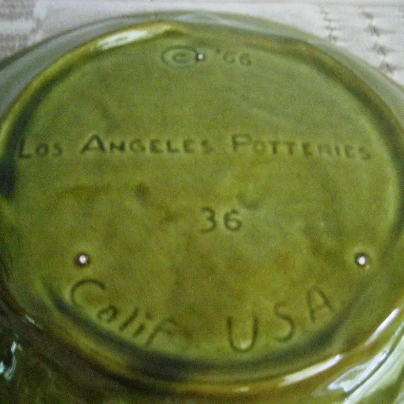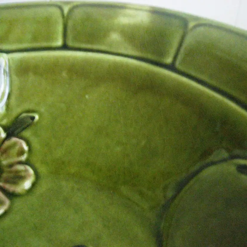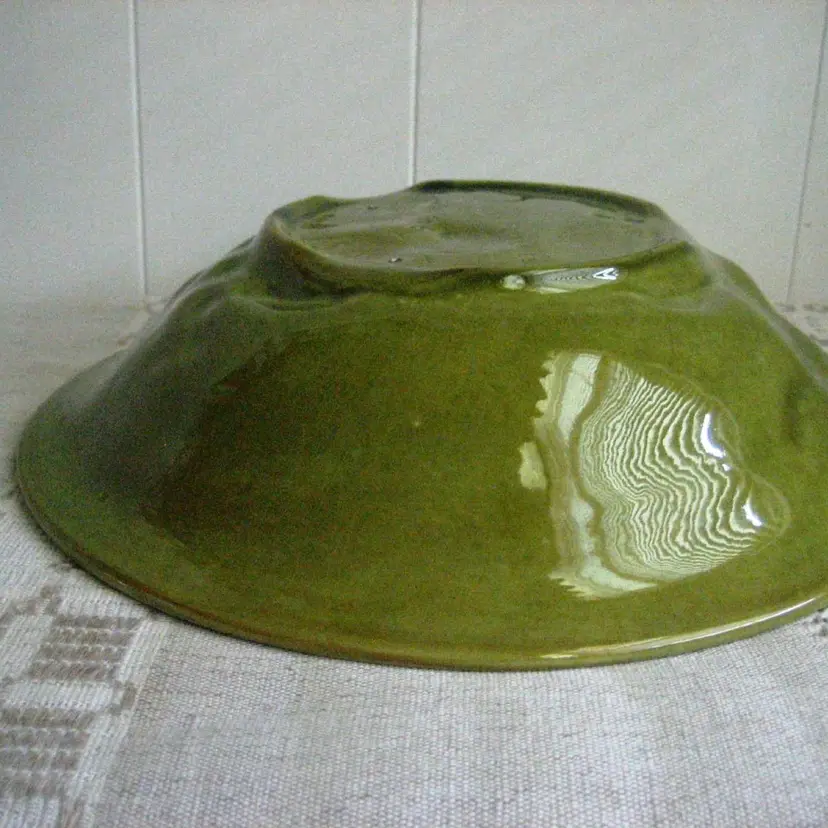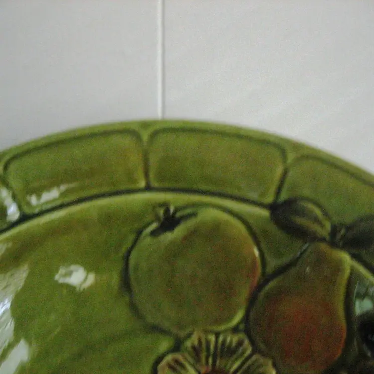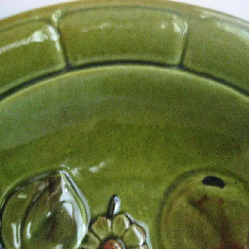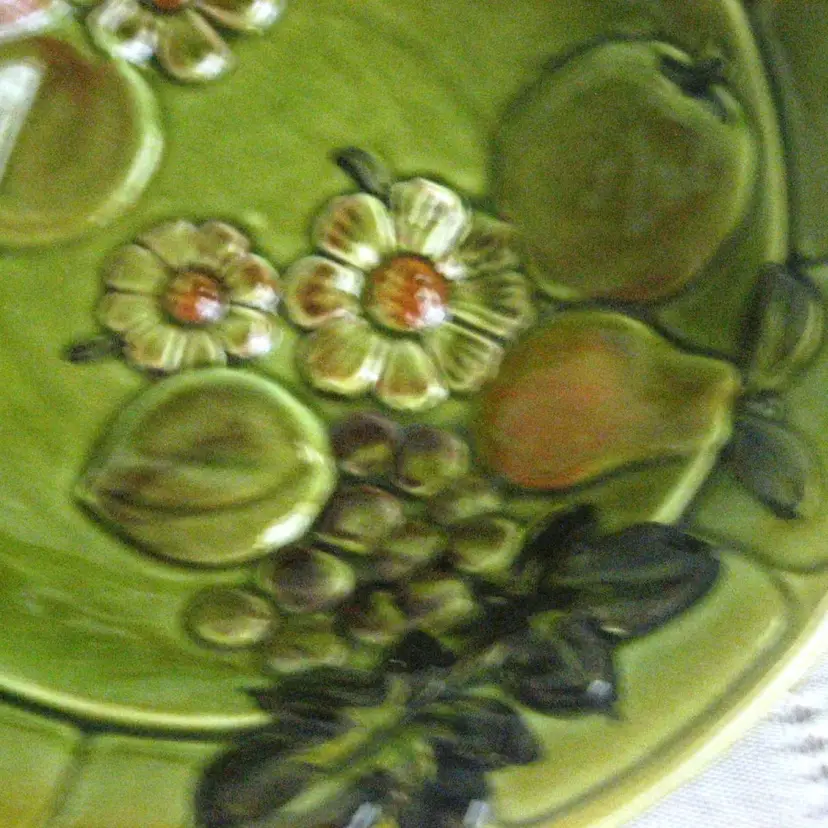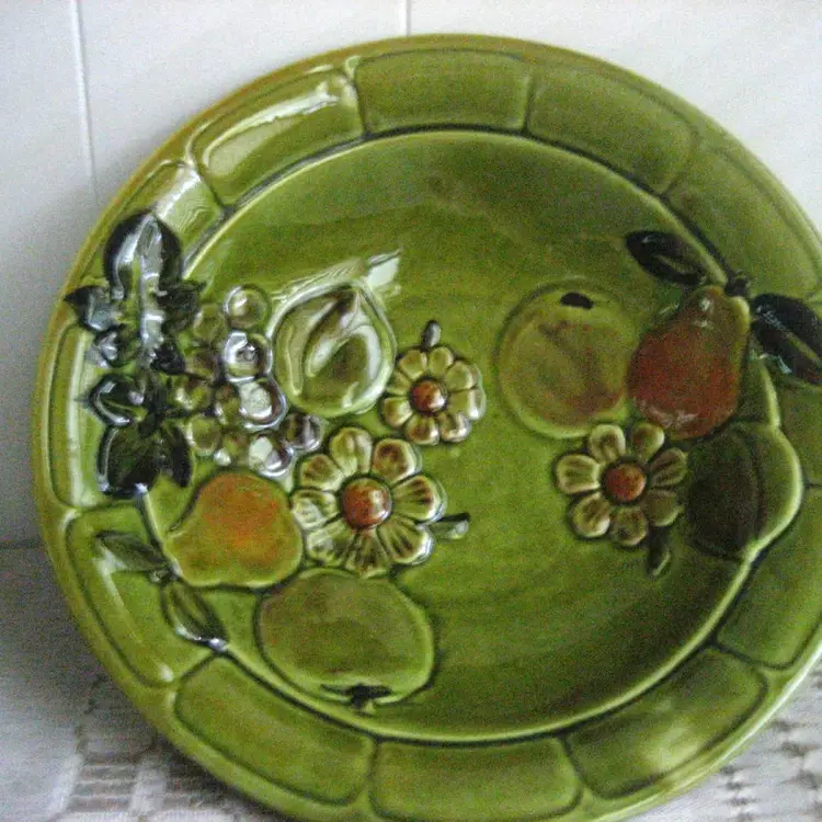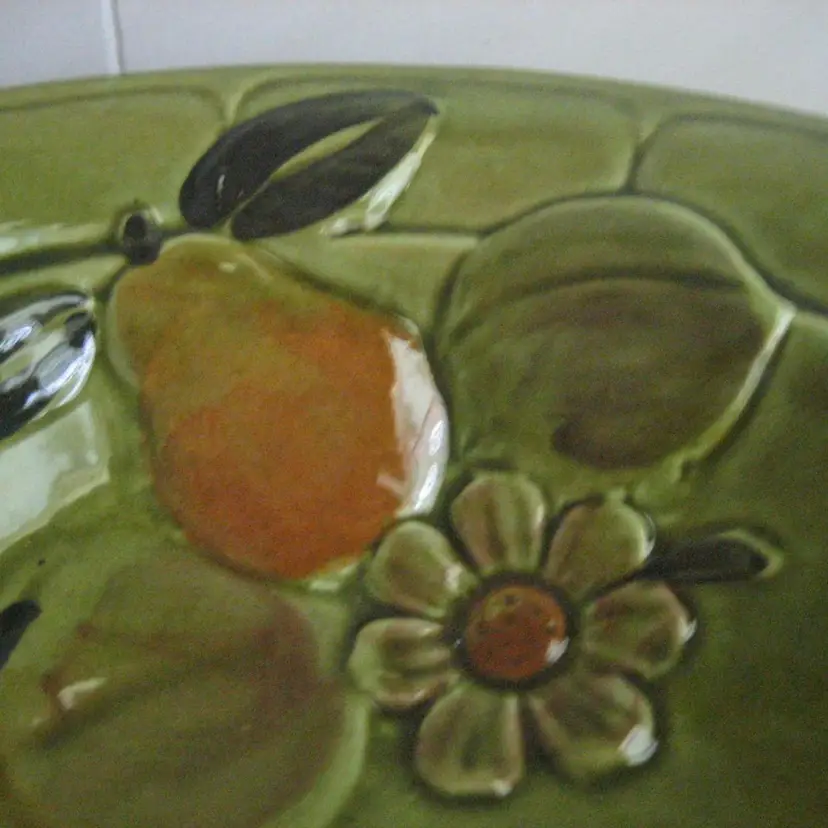 This fabulous MCM vintage serving bowl features embossed fruit with a hint of color against an olive green background. Great preowned condition with no chips or cracks but does show crazing on both sides.