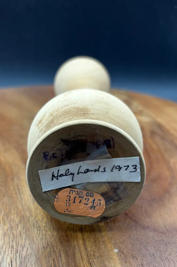Lovely example of lathed wood techniques on this little vase. It is made of olive wood and is marked "Bethlehem" on the original stamp, The original owner also left the price tag on and added the note that it came from the Holy Land in 1973. Wonderful piece. See photos for condition. and measurements.