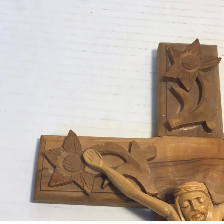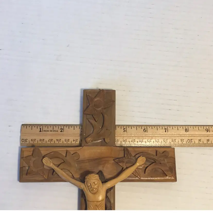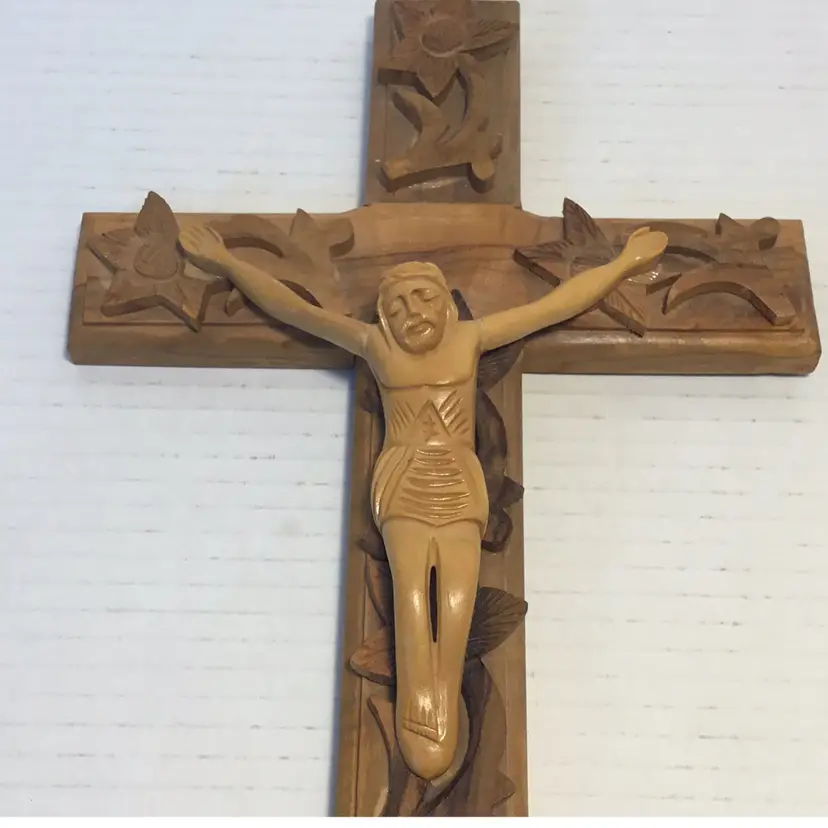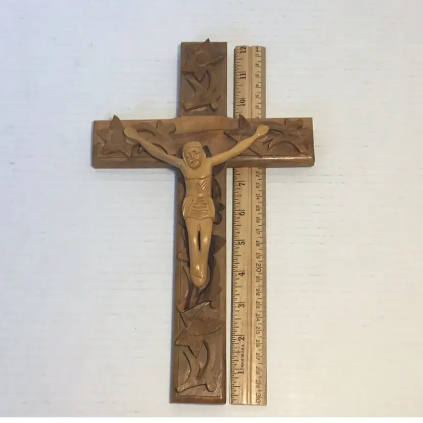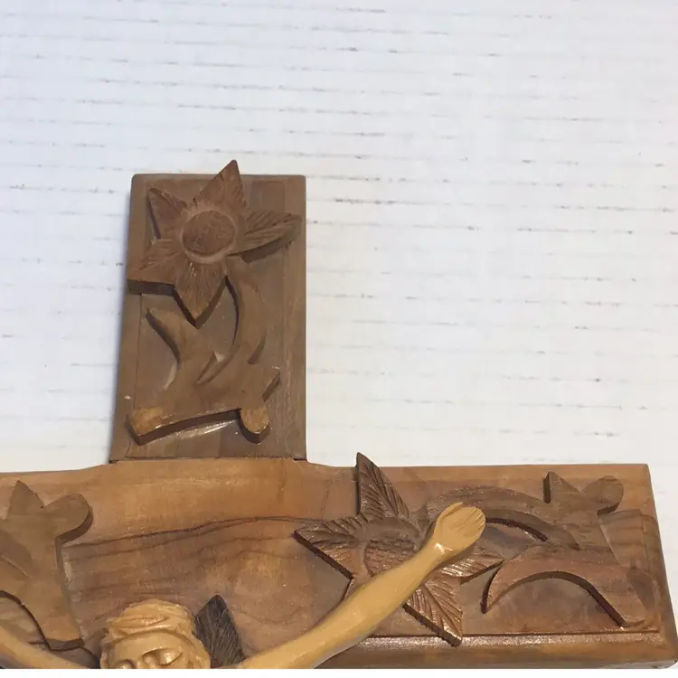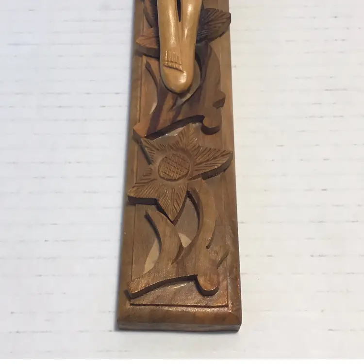 This is a beautiful hand carved Crucifix, Jesus is carved in a primitive folk art style. It features applied hand carved flowers that are beautifully done. There is hardware attached so it’s ready to mount. It is 12” high and 7” wide and in very nice condition, please see pictures. There is no makers mark.