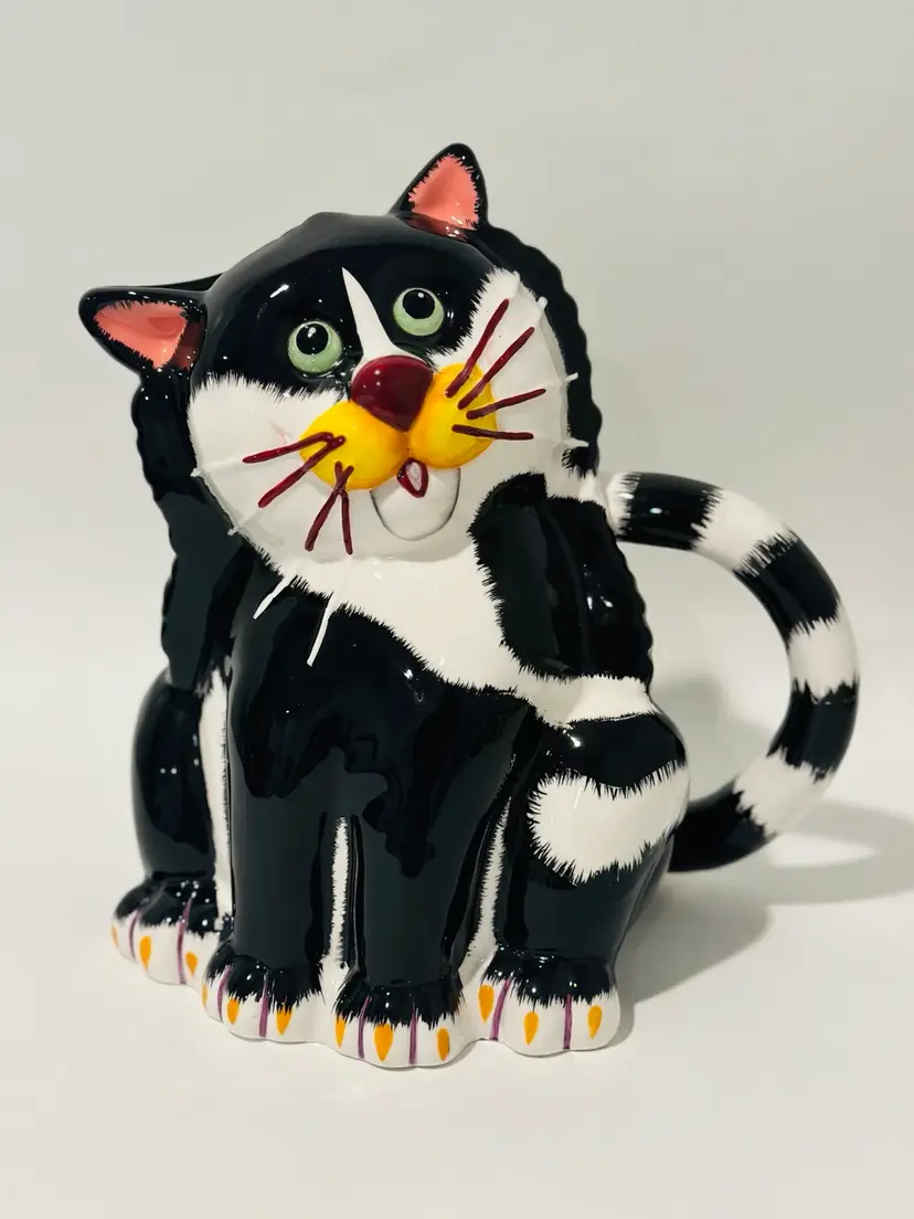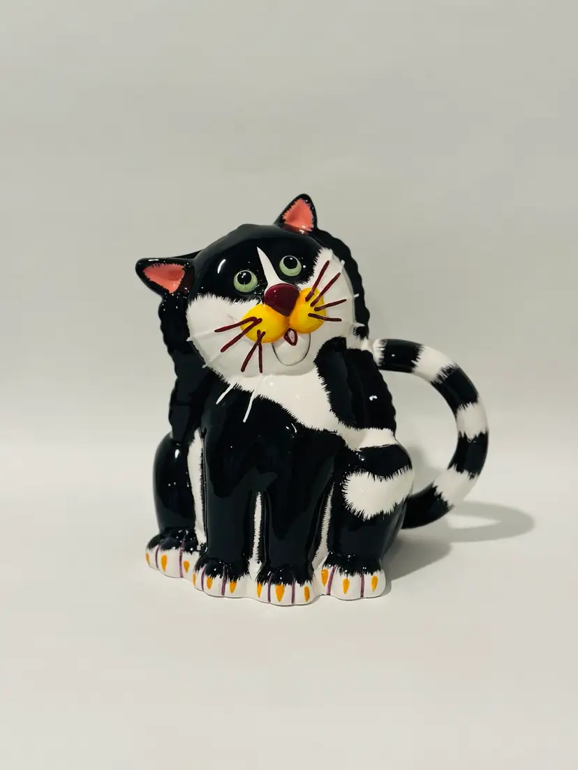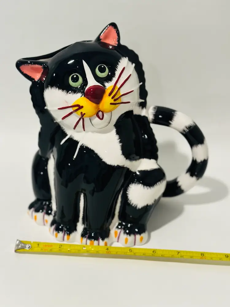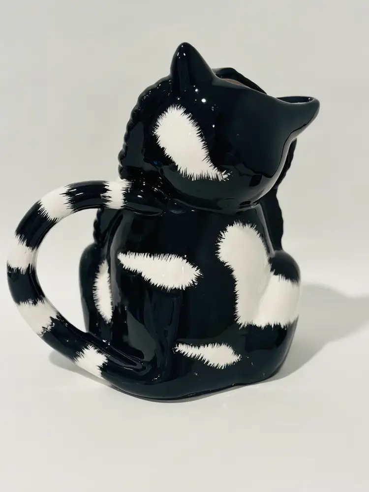 This charming and unique ceramic pitcher features an adorable black and white cat design, adding a touch of whimsy to any collection. With one spacious compartment, it's perfect for serving your favorite beverages. The glossy finish gives it a modern appeal, and its large size (8.75 inches) makes it a standout piece.
