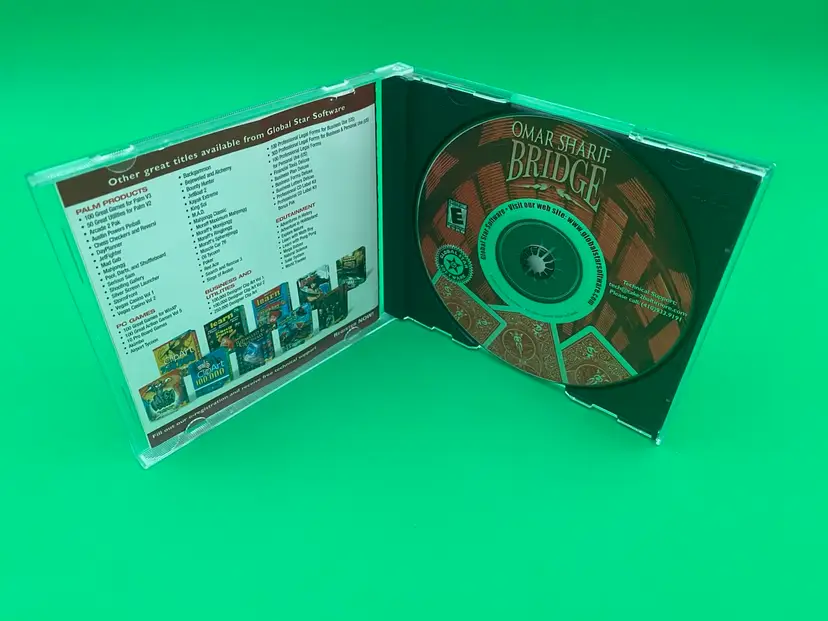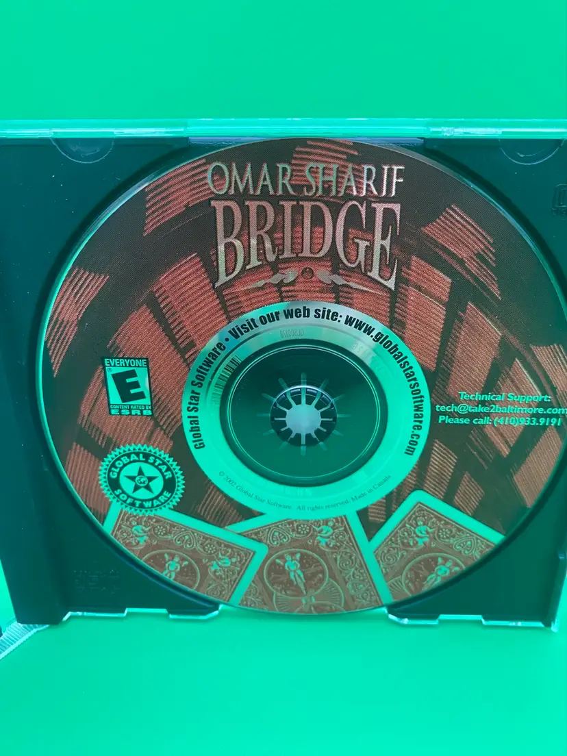 You are purchasing one Omar Sharif Bridge PC Video Game by Global Star Software from 2002. This Game is in great condition. No chips or cracks on the case. No rips or stains on the inlay. Clean disc.