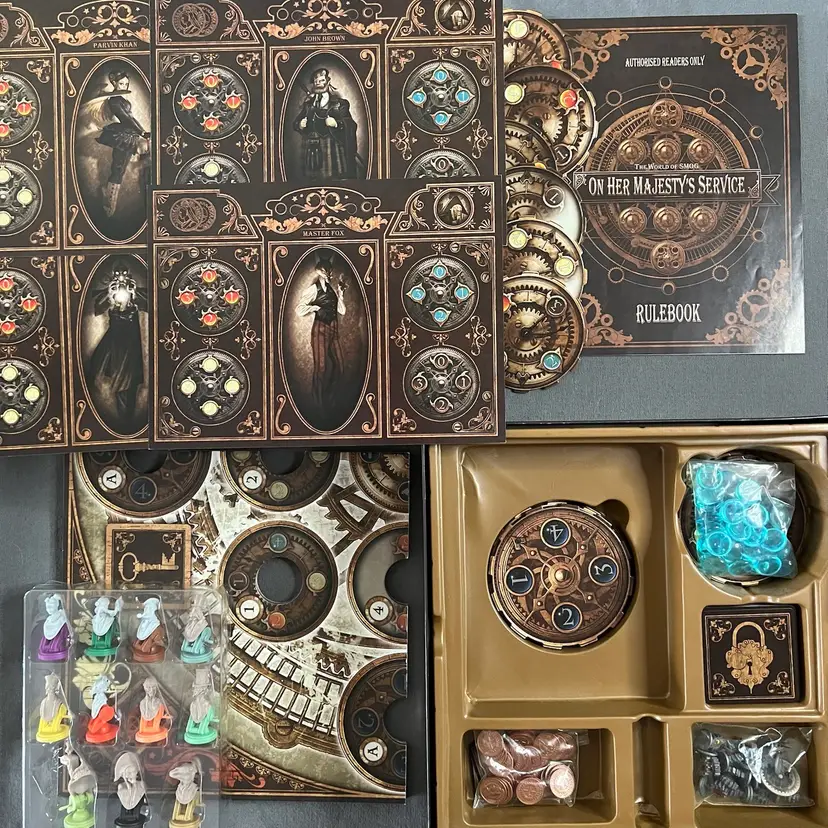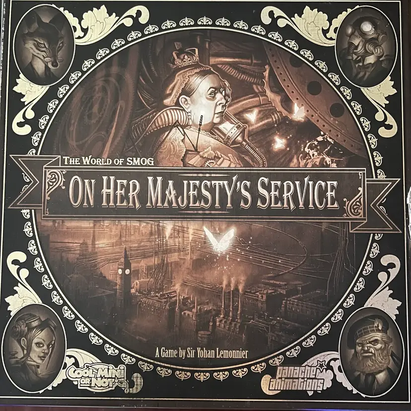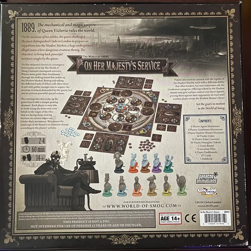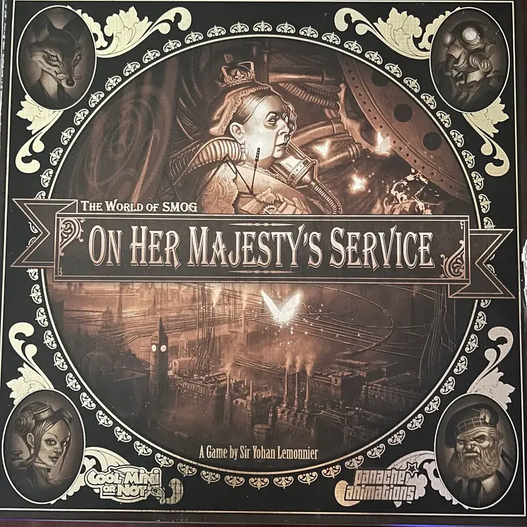 Played once, kept on a shelf by a chair. One upper left edge is worn from that chair. Otherwise, components, excellent. / / / Set in the fantastic steampunk The World of Smog created by Panache Animation, On Her Majesty's Service is a stylish board game for two to four competing players. You'll need to navigate the rotating tiles that make up the game board, trading Ethers and Artefacts in order to fulfill the quest set by Queen Victoria, all the while dealing with the Agents of the Shadow Master.