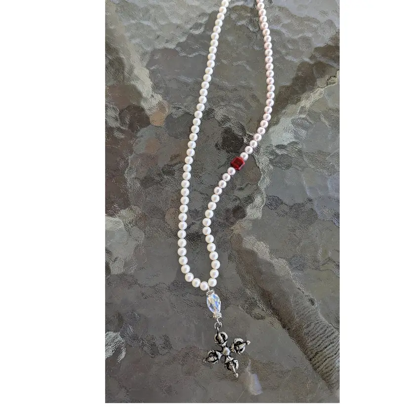 Upcycled vintage Monet pearls with a touch of vintage coral, clear crystal stone and a vintage heavy cross picked up in Greece in the late 1980's.