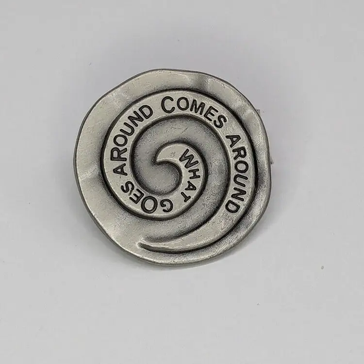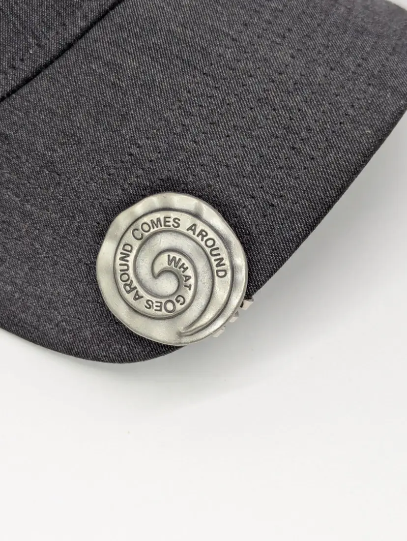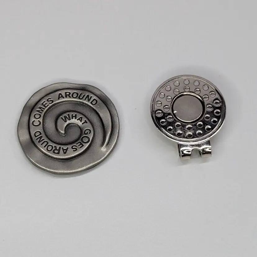One-Of-A-Kind What Goes Around Comes Around Custom Golf Ball Marker with Magnetic Hat Clip This unique golf ball marker features a magnetic hat clip and is made of durable metal. It is perfect for any golfer who wants to add a touch of personalization to their game. The silver color and sleek design make it a stylish accessory for any golf bag. The W.G.A.C.A. Custom Golf Ball Marker is a great addition to any golf accessories collection. It is a non-domestic product and is made in an unknown country or region. This unit comes as a single item and is not a custom bundle. Get ready to impress your golf buddies with this one-of-a-kind golf ball marker!