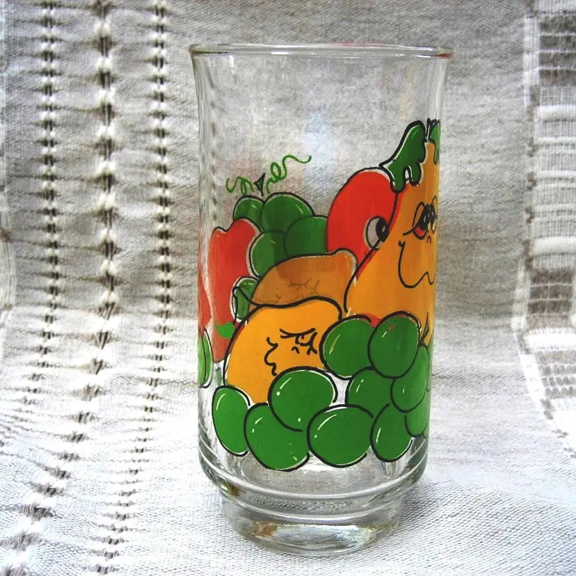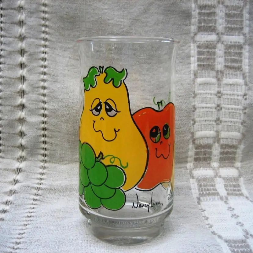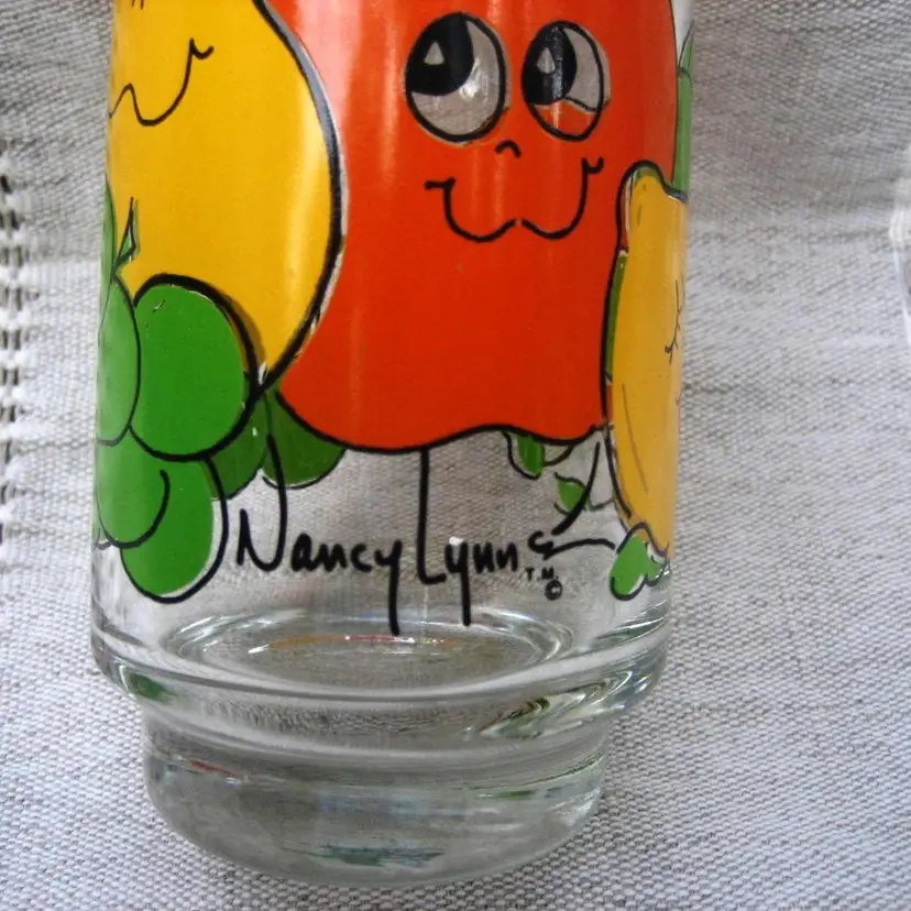 This listing is for one 16 oz drinking glass by Nancy Lynn. The glass features smiling fruit. If you need replacement glasses, these are the perfect ones. If you are starting a collection, even better!!
