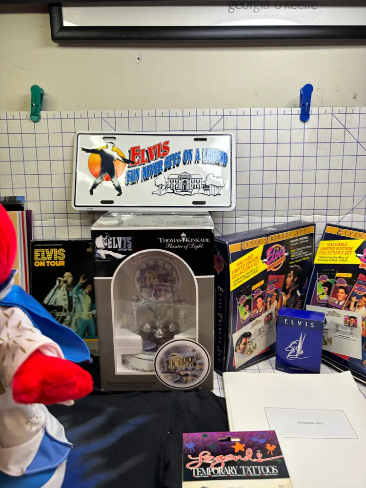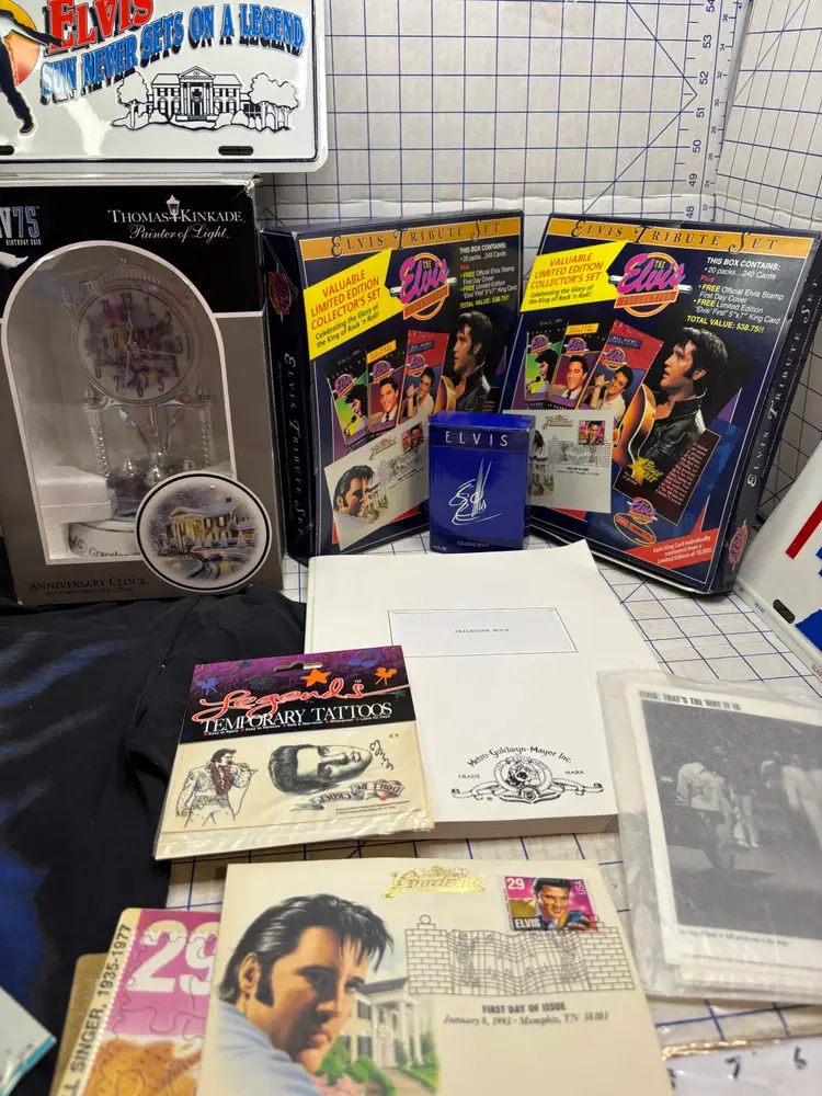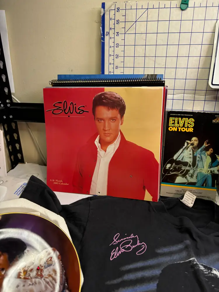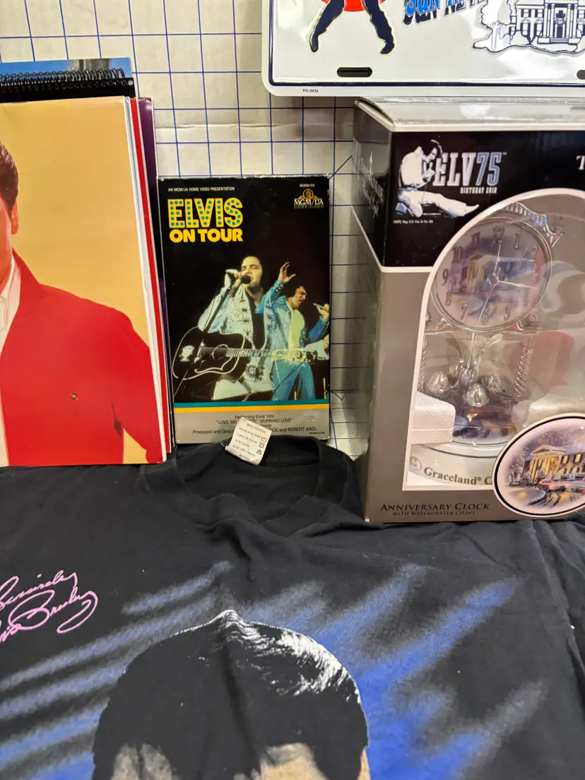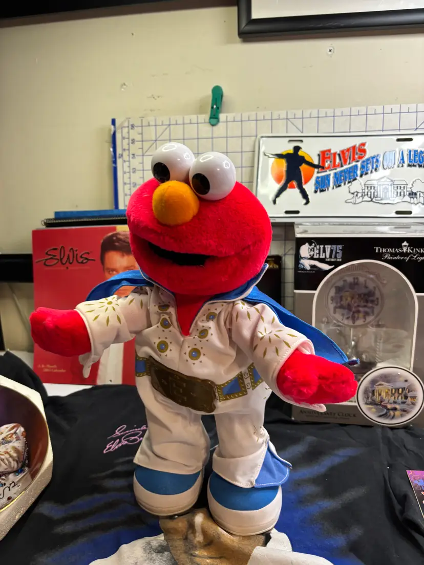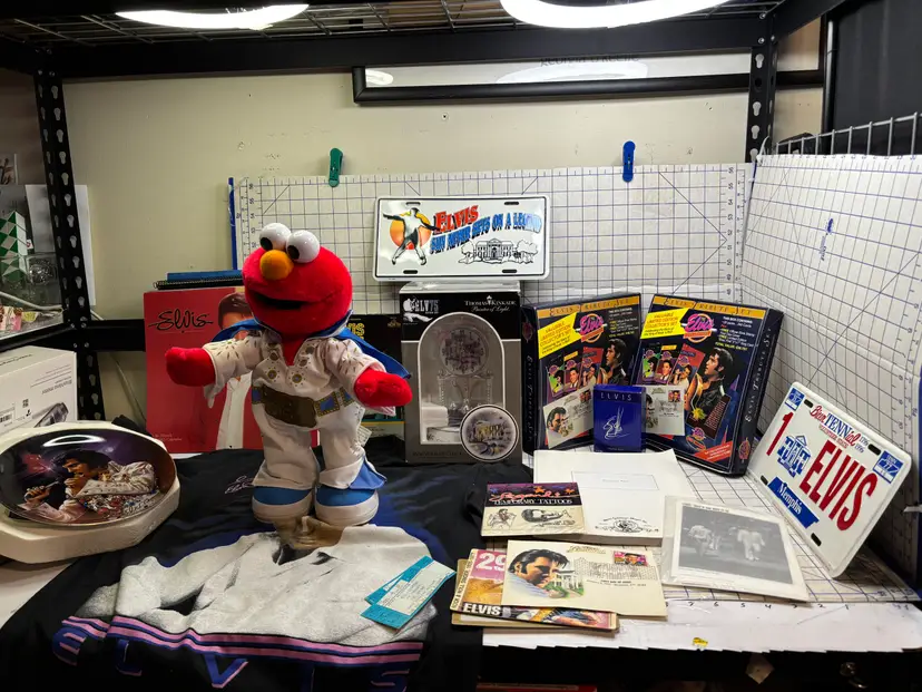 I basically priced this for the value of the clean and fully working Elvis Elmo (clean battery box too). There are 8 or 9 calendars. The card sets have been opened but it looks like they just put them back into the boxes. The shirt is a small on a Dr. Martens tag. I figure this stuff is much better antique booth stuff than it is ebay stuff.