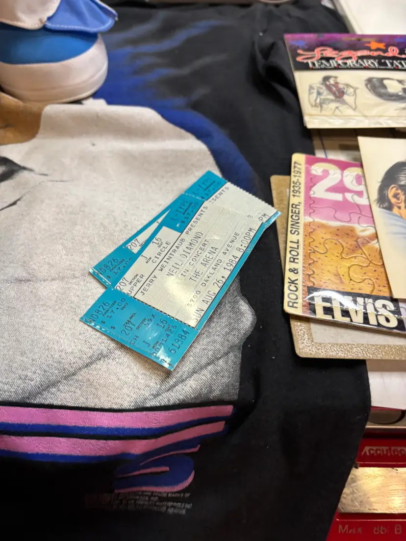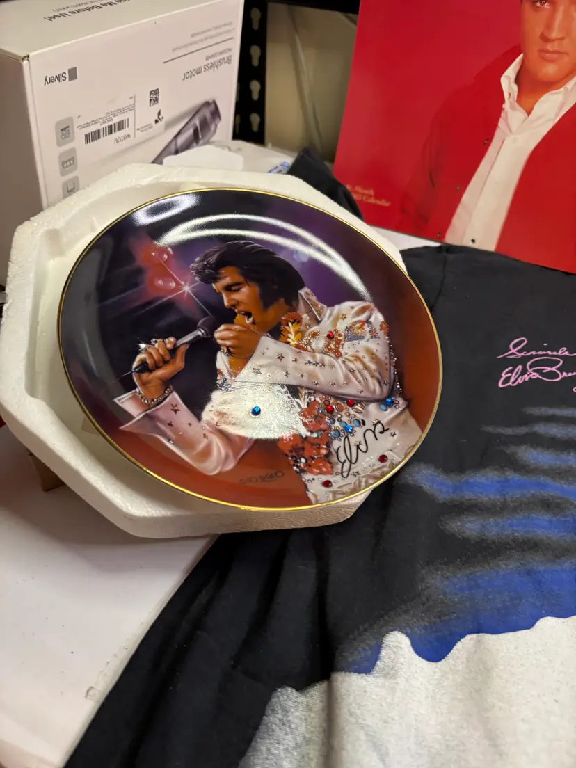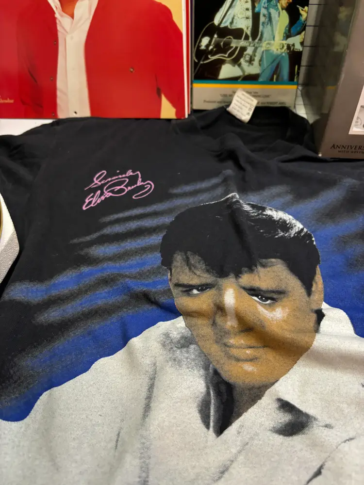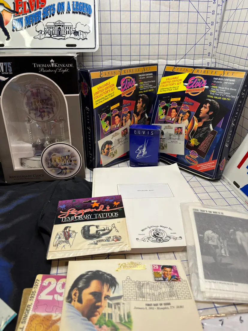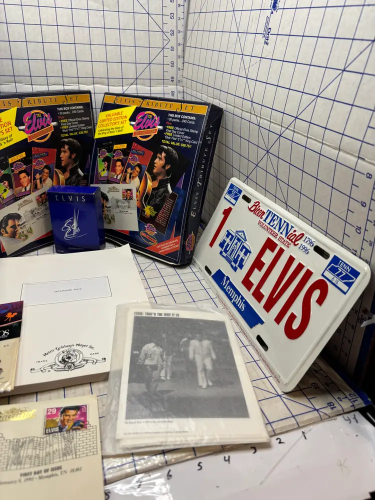 I basically priced this for the value of the clean and fully working Elvis Elmo (clean battery box too). There are 8 or 9 calendars. The card sets have been opened but it looks like they just put them back into the boxes. The shirt is a small on a Dr. Martens tag. I figure this stuff is much better antique booth stuff than it is ebay stuff.