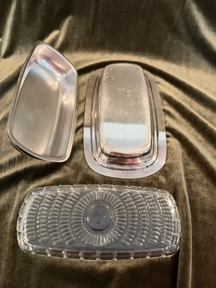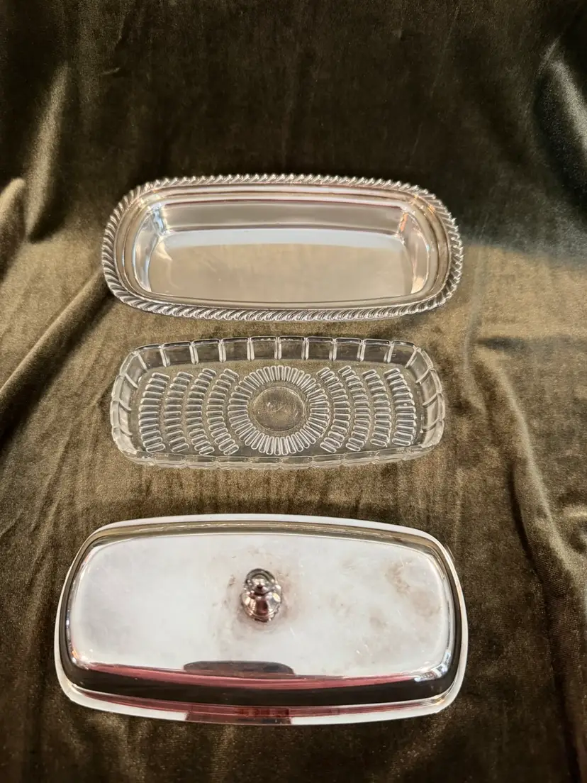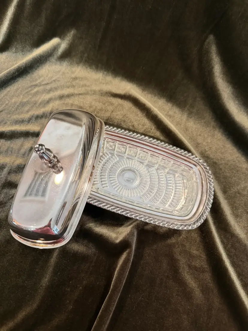 A three-piece vintage silver-plated butter dish featuring a rope-twist border and its original clear pressed glass liner with a radial sunburst pattern.