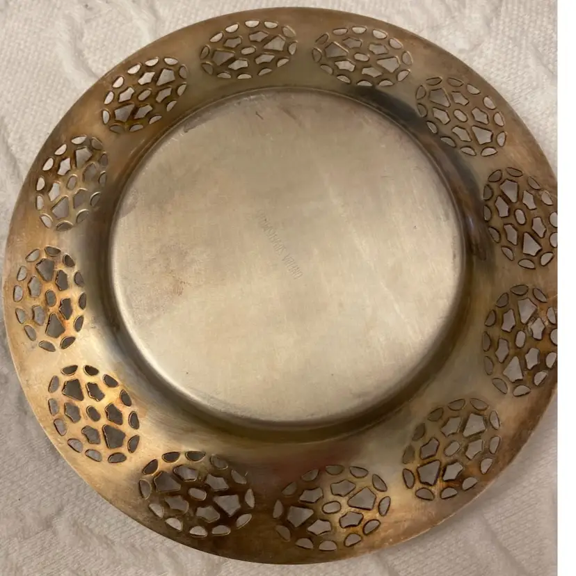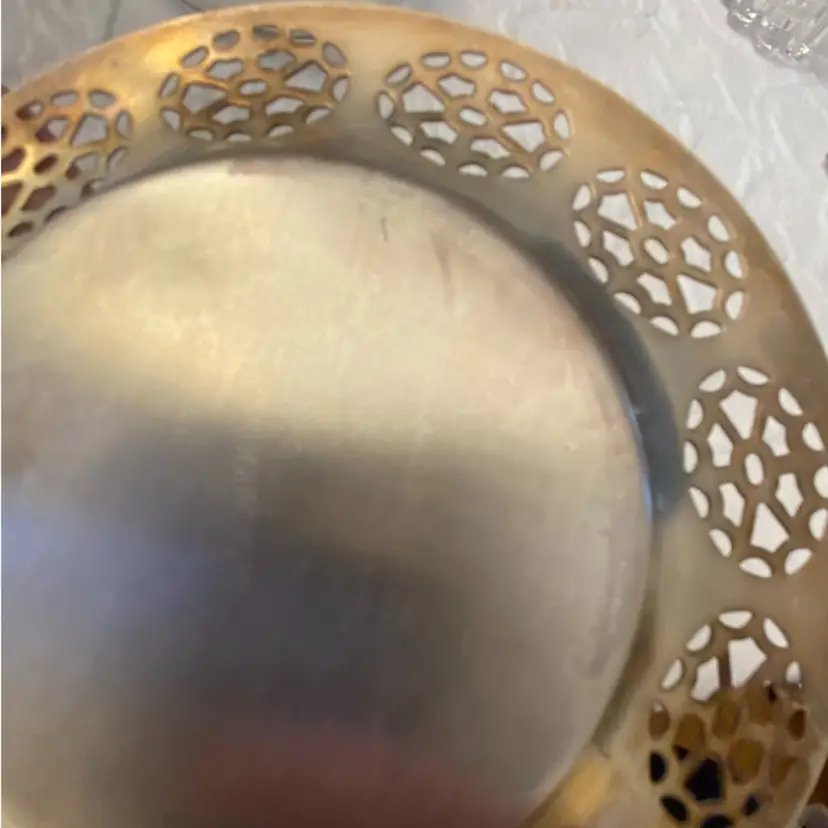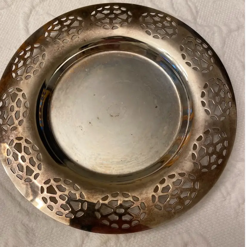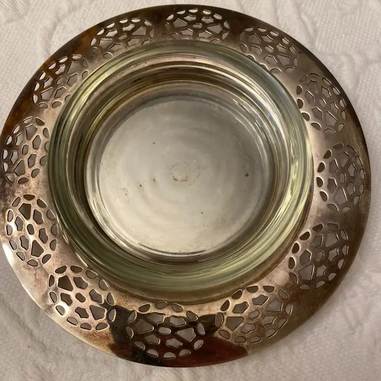 This is a gorgeous 2 piece vintage serving piece or trinket dish by ONEIDA SILVERSMITH. It has many uses, and accordingly is referred to by many names—it is called a trinket dish, a caviar server, a candy dish, a condiment dish, and a jelly dish to name a few. So many uses for this 2 piece set! This beautiful piece has an intricate pierced design around the outer edge and a glass insert. It is marked ONEIDA SILVERSMITH on the bottom, and the silver dish measures approximately 6” wide in diameter and the glass insert measures approximately 3 1/2” wide. This set is in great vintage condition with no dents in the dish or chips or cracks in the bowl and a slight patina which can be shined or left as is. What a lovely and useful addition to any home!