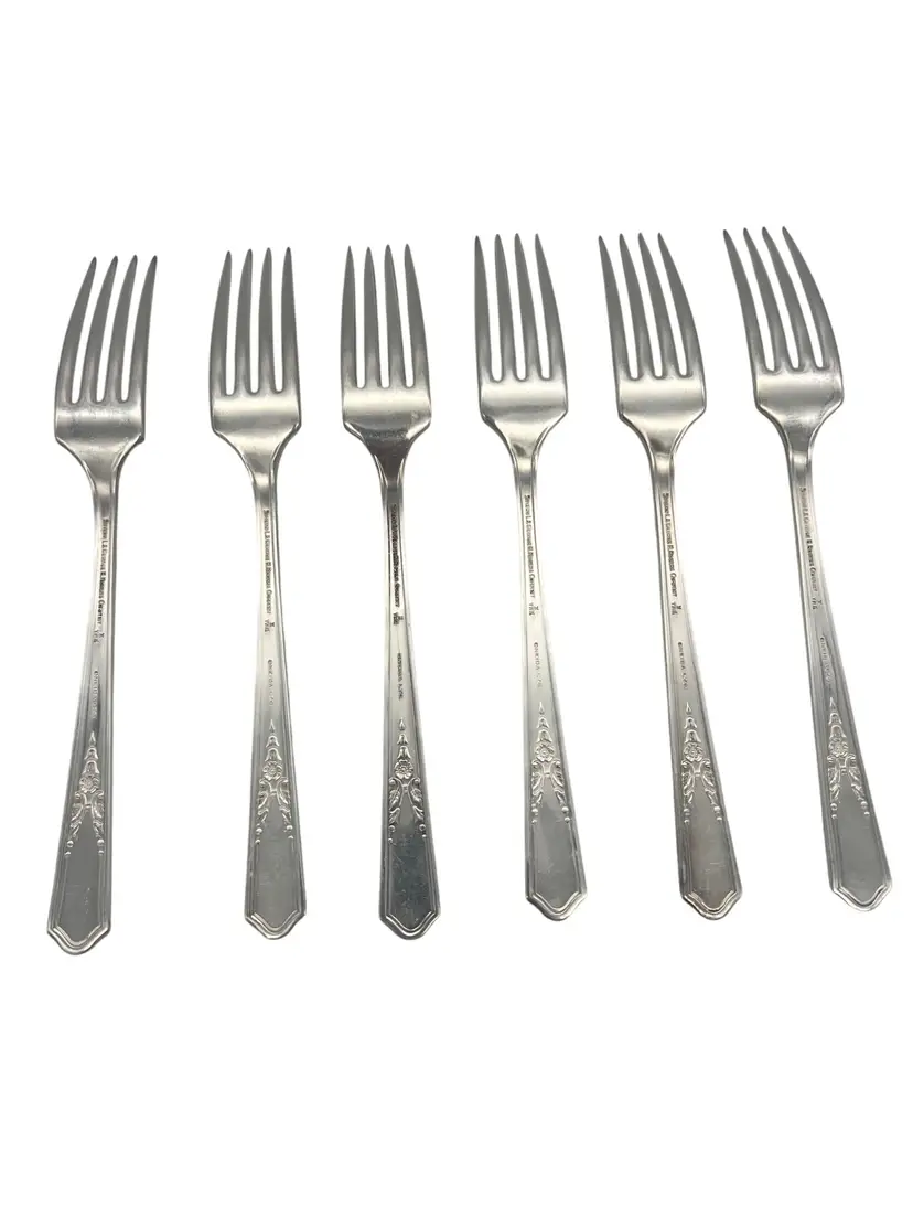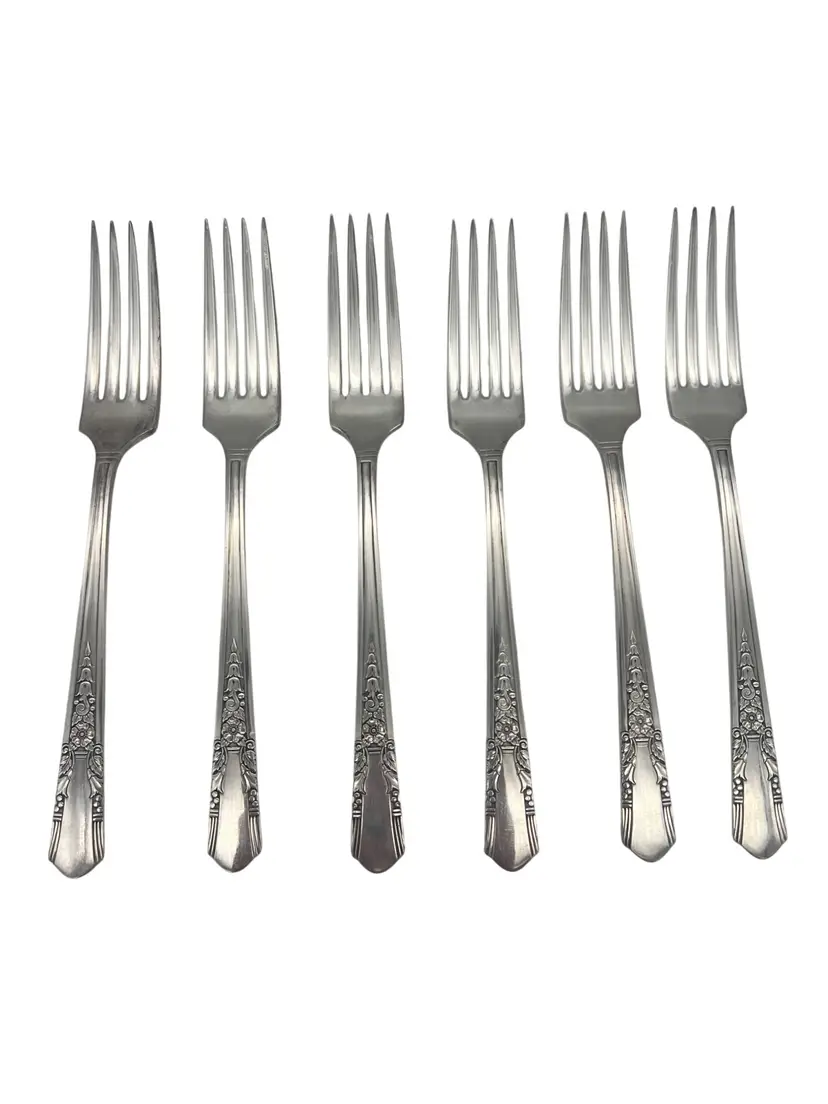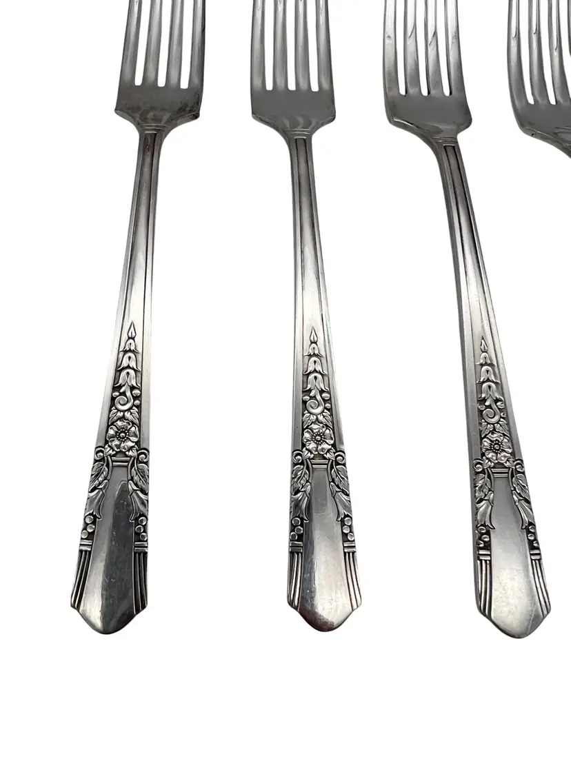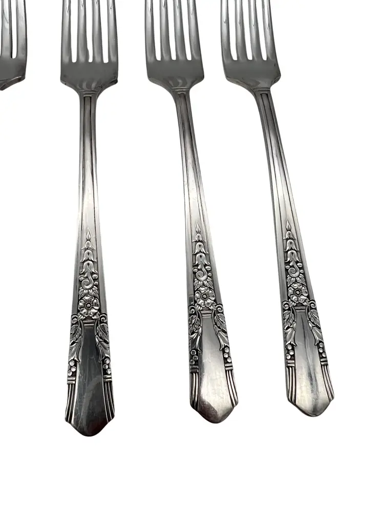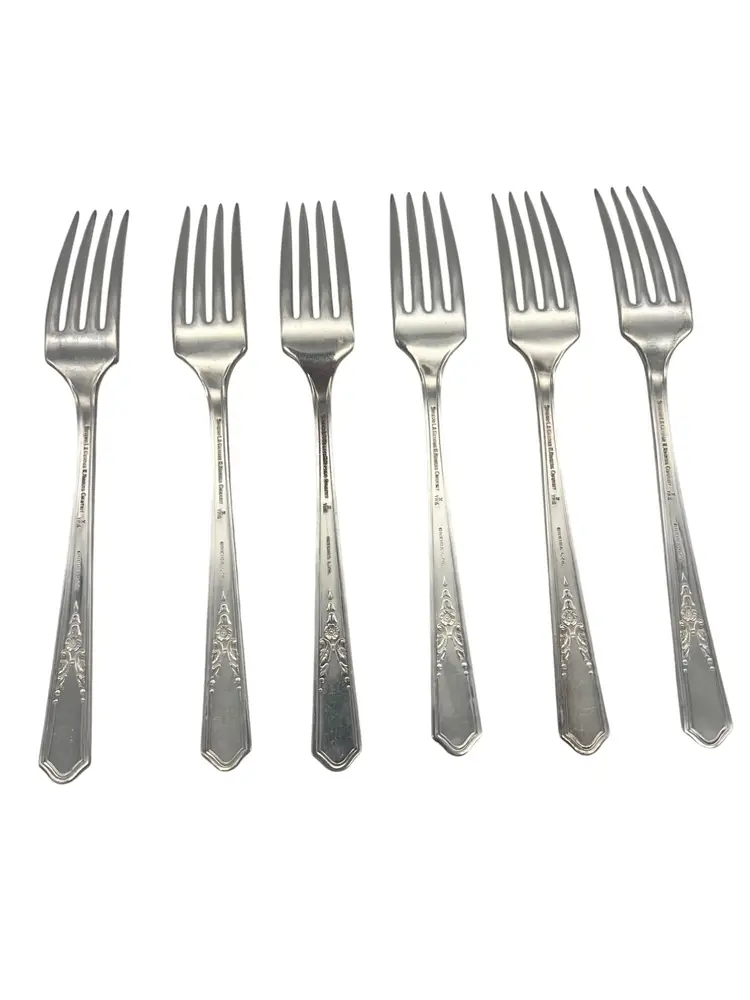 Set of 6 vintage Oneida / Simeon L & George H Rogers XTRA silverplate grille forks (Viande) in the Jasmine pattern. Jasmine was made starting in 1939 and is now discontinued. Each fork measures approximately 7.5" long.