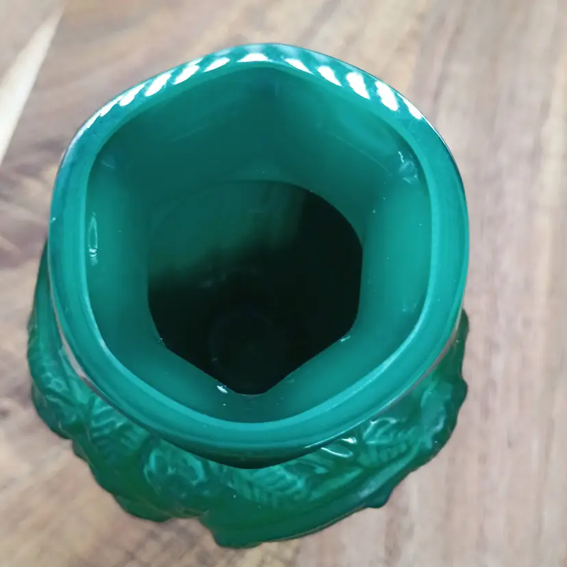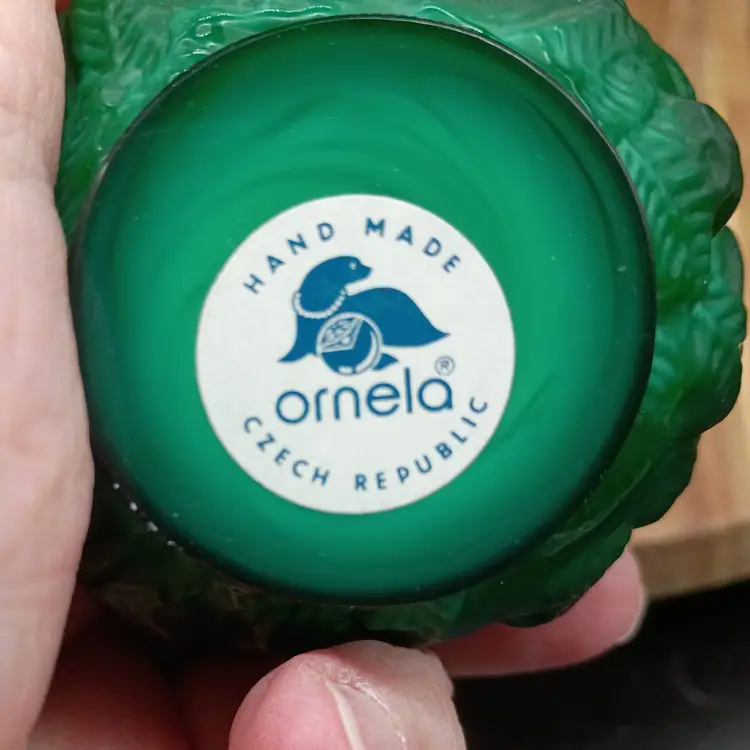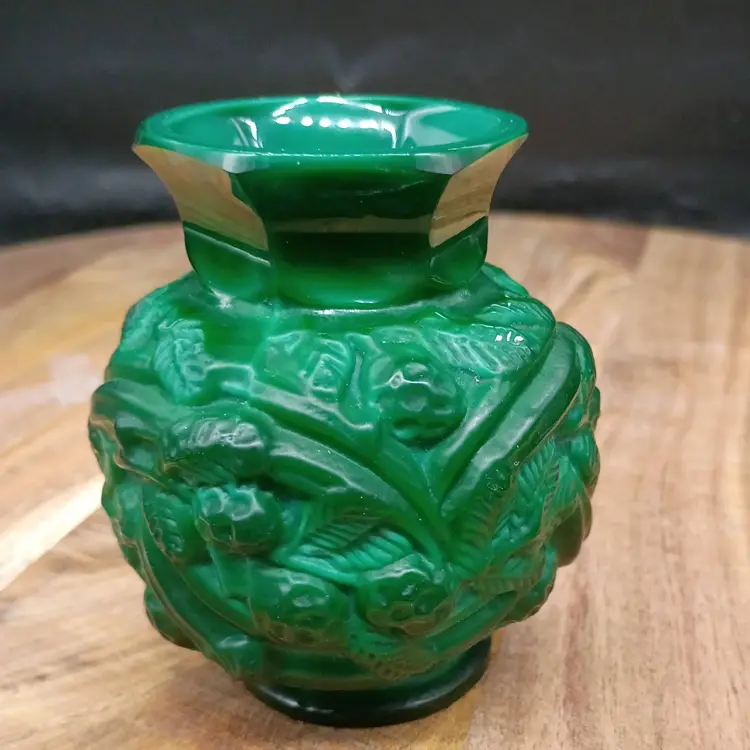Onela Malachite Glass Bud Vase Art Deco Revival 1990's 3" Czech Republic. This has a raised relief pattern of berries and vines. It is 3 inches tall and 2.5 inches in diameter. It has its original sticker on bottom There is no visible signature but might be under sticker. This is preowned, No chips cracks or flea bites. This is a reissue made from original molds from 1930's during the Art Deco revival period of the late 1990's. It is still a vintage item but it is not from the 1930's. Excellent condition. Ships USPS