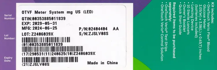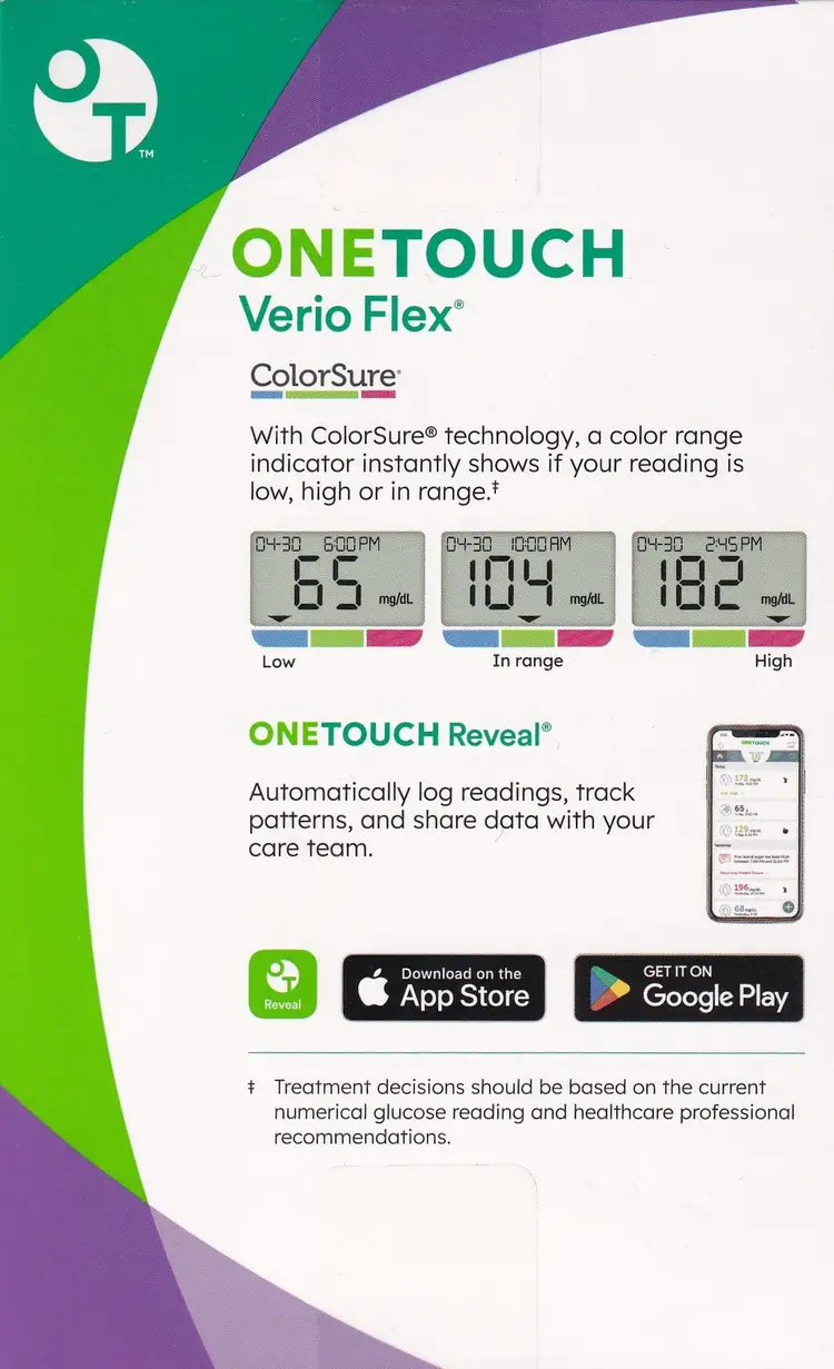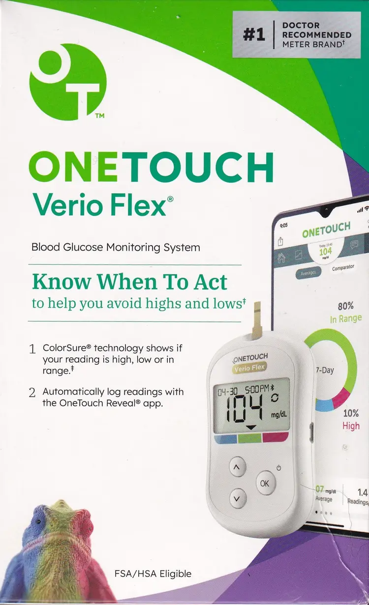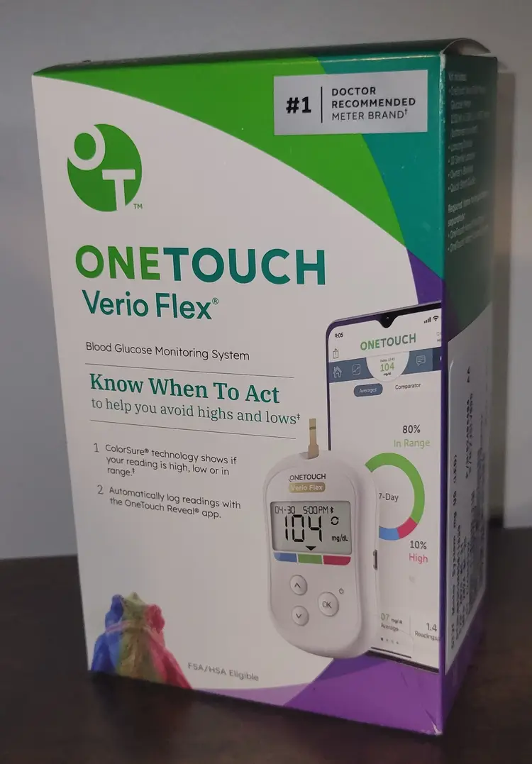 OneTouch Verio Flex Blood Glucose Monitoring System Kit Includes: OneTouch Verio Flex Blood Glucose Meter (Batteries Included) Lancing Device 10 Sterile Lancets Owners Booklet Quick Start Guide EXP: May 31, 2029