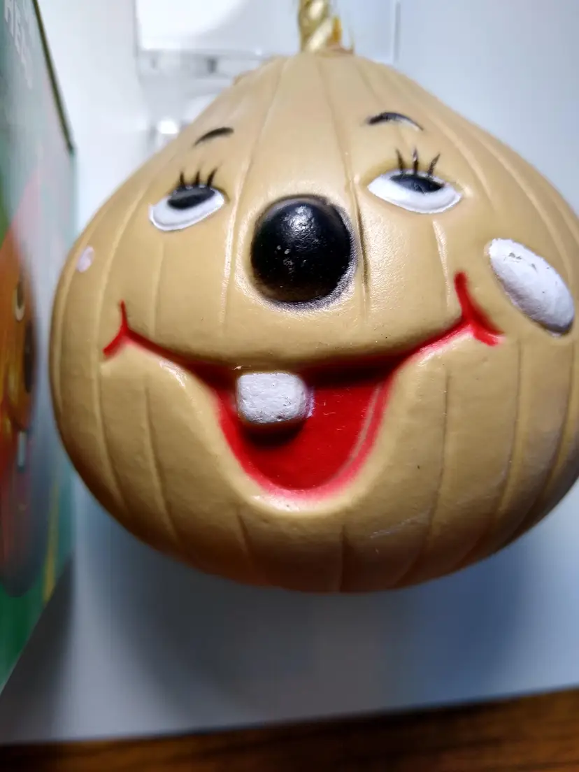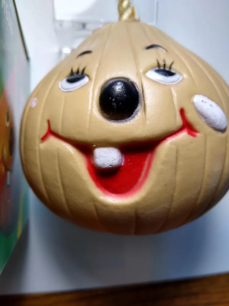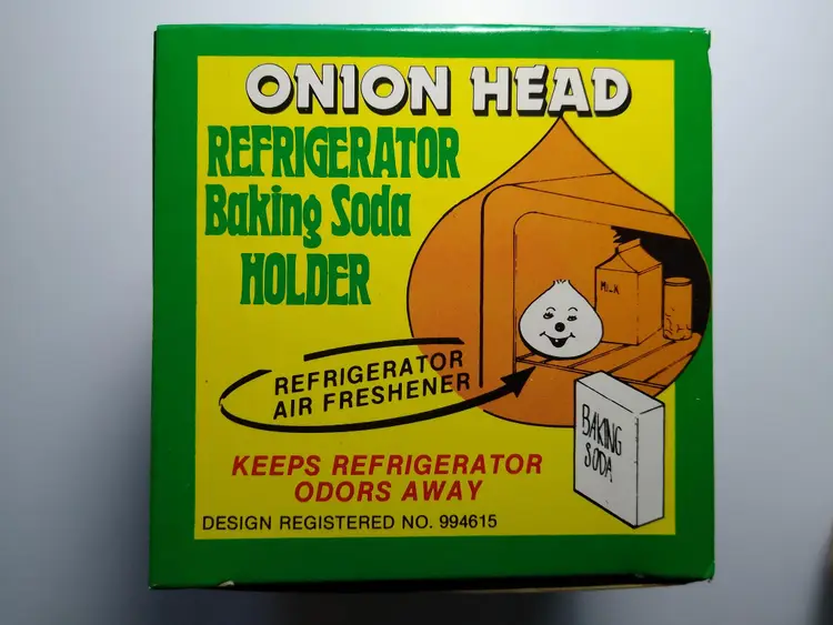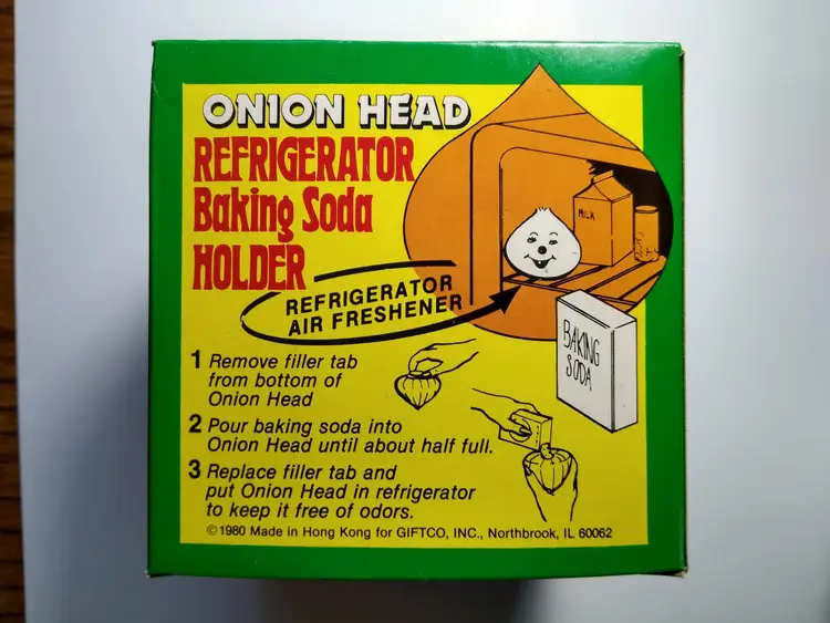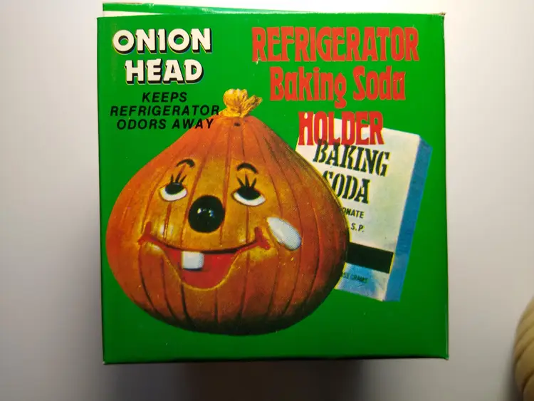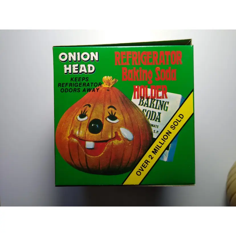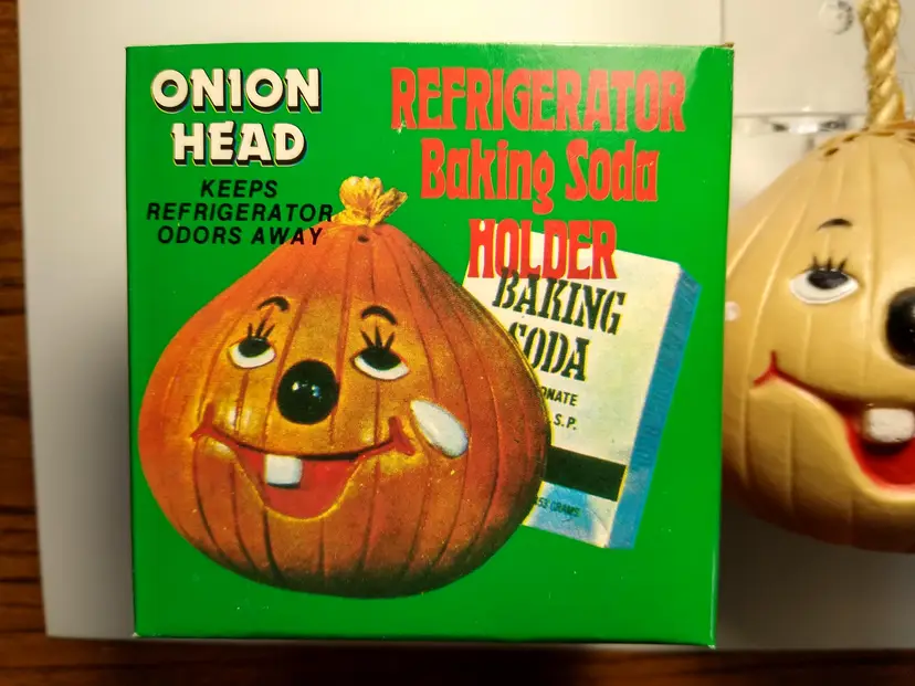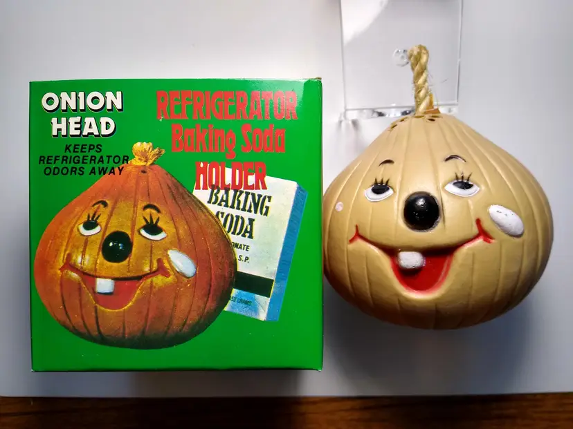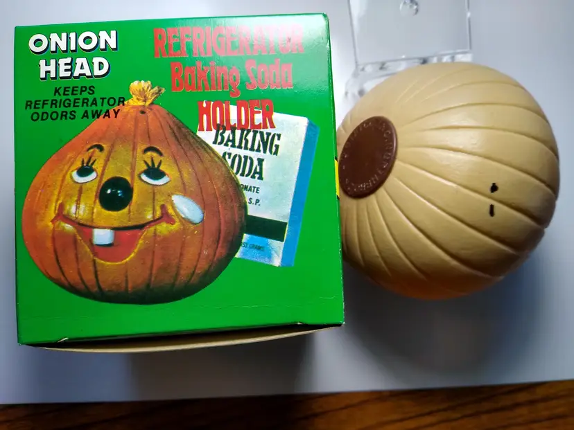 The vintage Onion Head baking soda holder from the 1980s is a kitschy retro collectible from Hong Kong. It is unused and designed to be placed in the refrigerator. This item is a unique piece of nostalgia that adds a touch of whimsy to any kitchen decor. Made of plastic with fabric stem. Has a tab on bottom so you can add baking soda. Clean unused old stock. Some paint scuffs to onion. Box in nice shape. About 4" size.