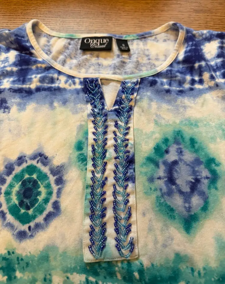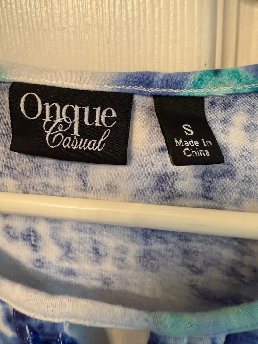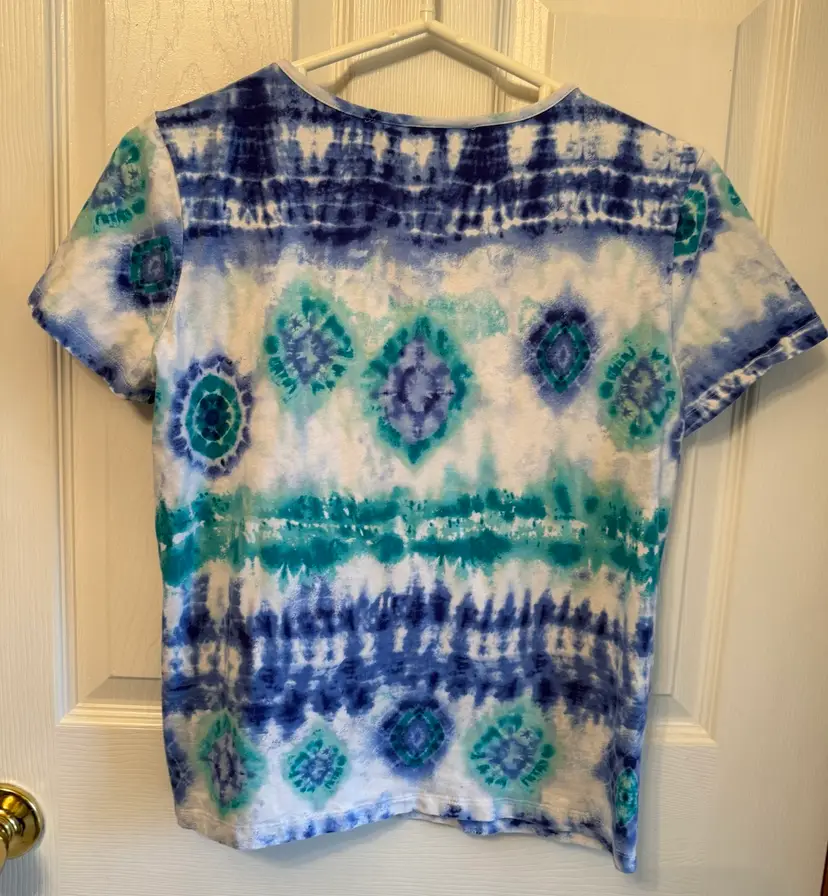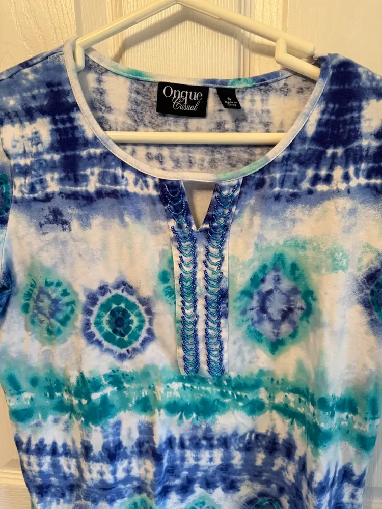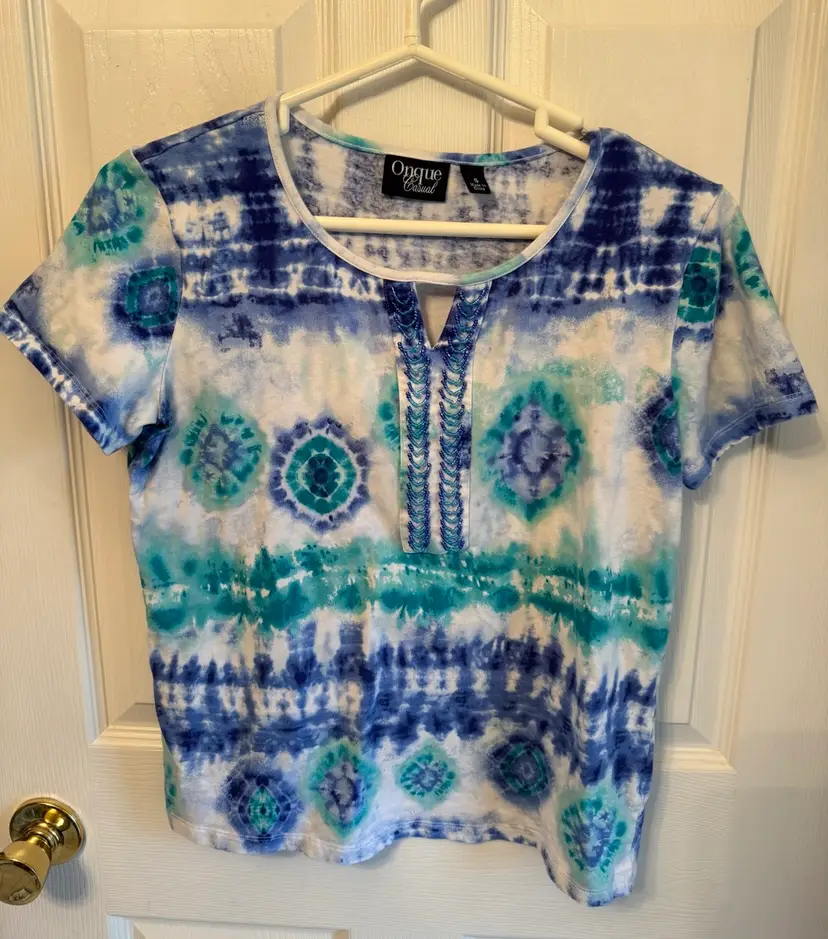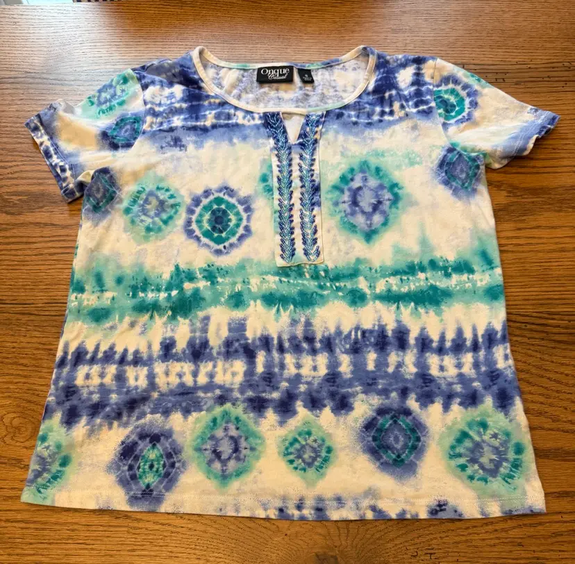 Embrace a vibrant style with this Onque Casuals tee, showcasing a captivating tie-dye pattern in blue and green hues. Measurements: pit to pit 17", from the top of the shoulder to the bottom of the shirt is 20", from the shoulder to the end of the sleeve is 6 1/4 " in great condition no stains, no tears no signs being worn at all.