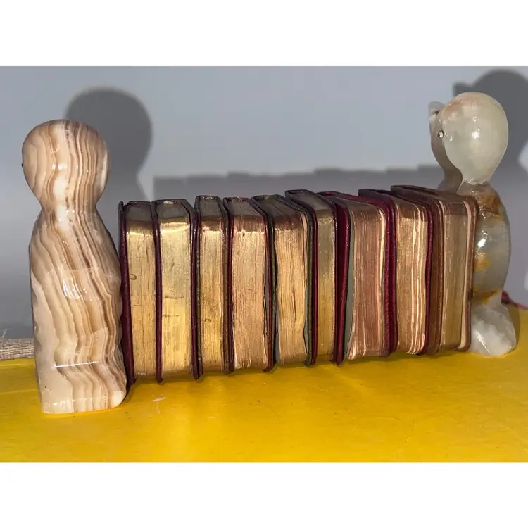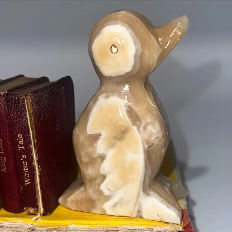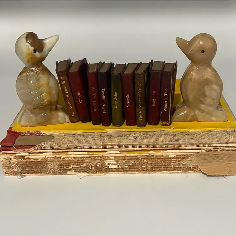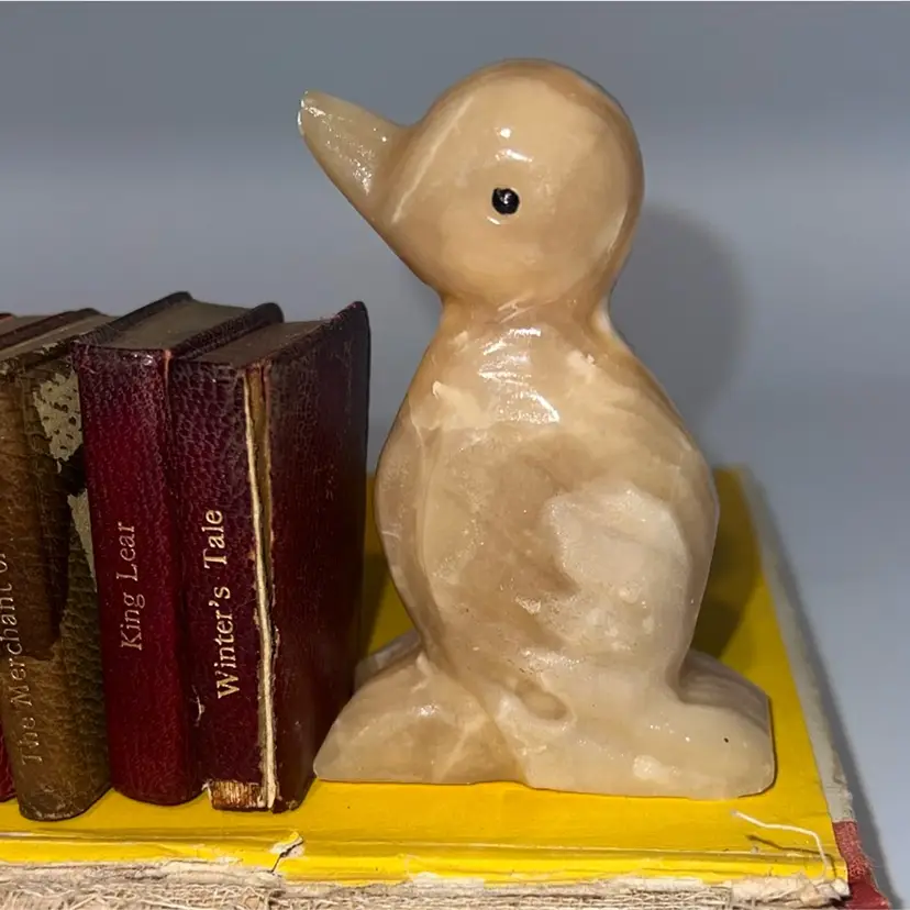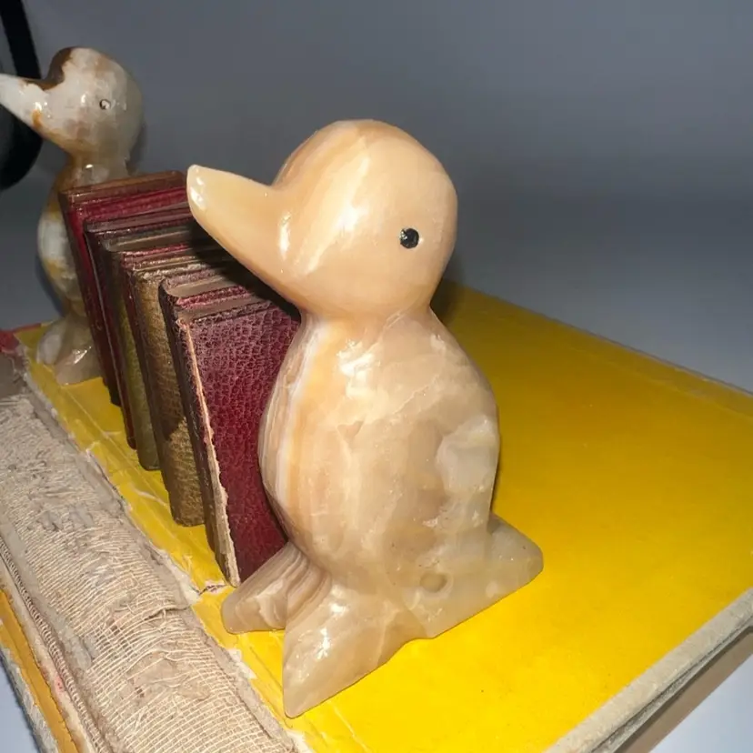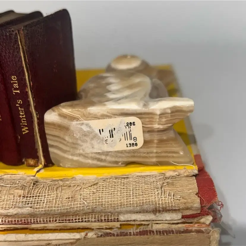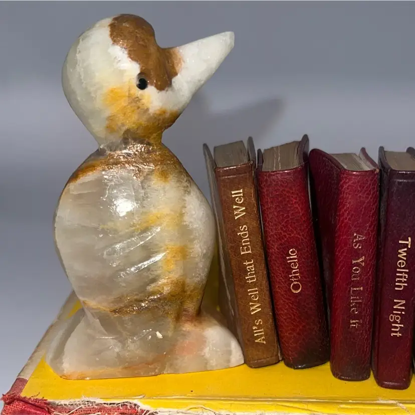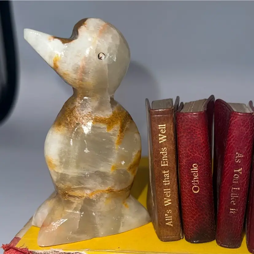 Two onyx hand carved birds used as bookends. Approximate measurements 3 1/4” long and 2” wide bottom of birds 2”x1 1/2” miniature books All for only $40.00 Lovely set for your home library Conversation pieces for sure! Please feel free to ask any questions Blessings, Bonnie & Darren :-)