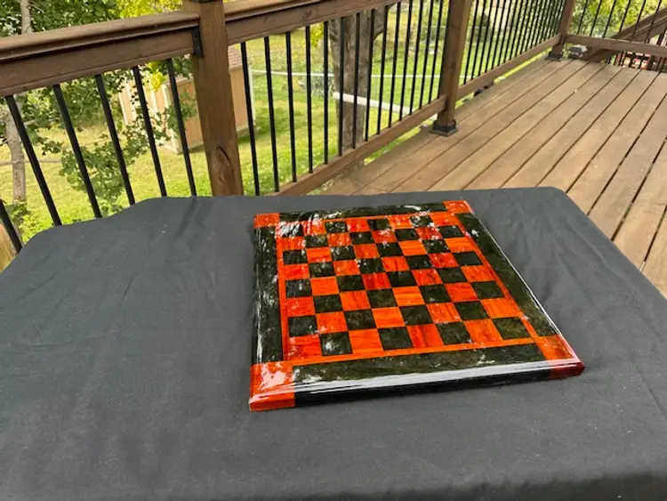 This beautiful exotic padauk lumber with black onyx epoxy will be a definite conversation starter and great heirloom piece in yohr home. Pieces made with same epoxy as in the board. Coated in tabletop epoxy for durability and protection.