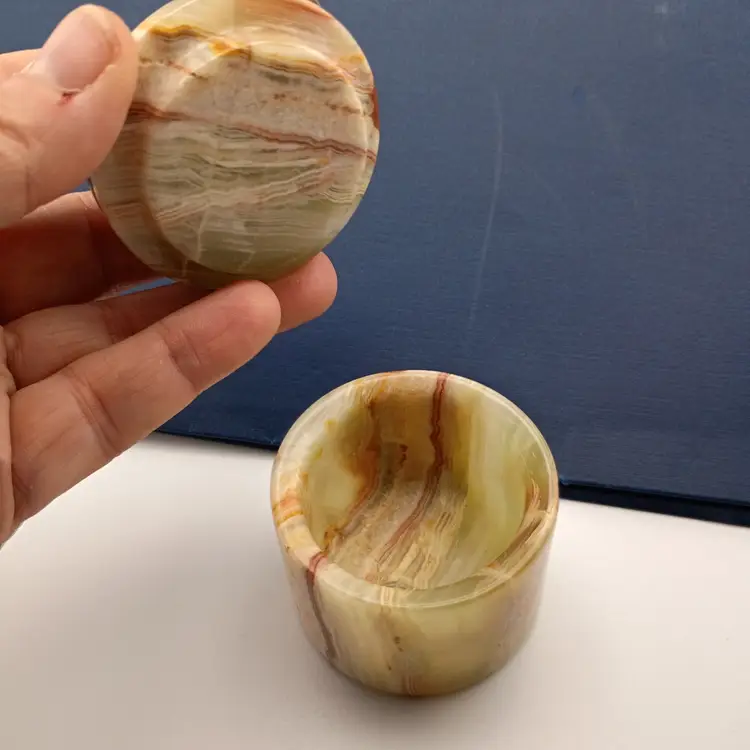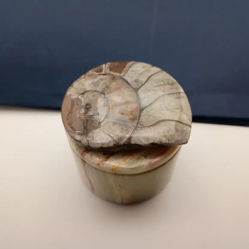 It's a beatiful little onyx trinket box with a polished ammonite fossil on the lid. It's in excellent condition with no chips or cracks--contemporary, made by a local couple.