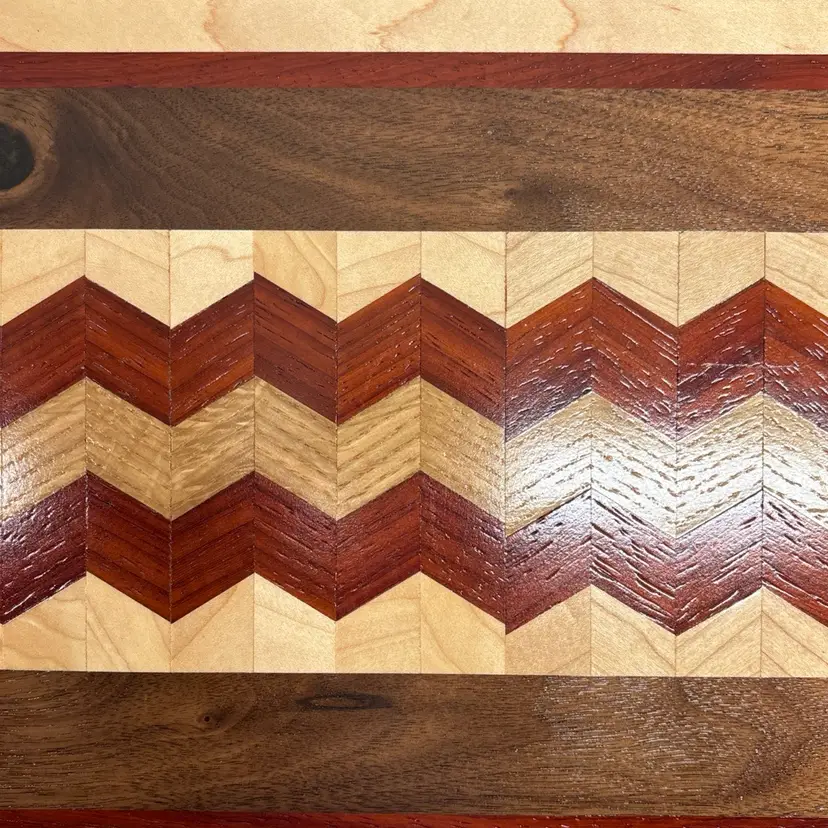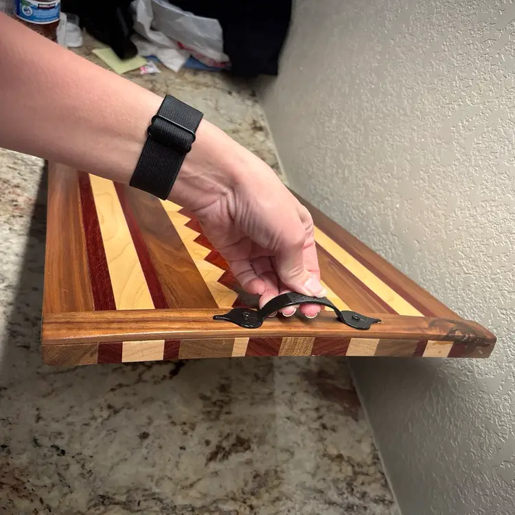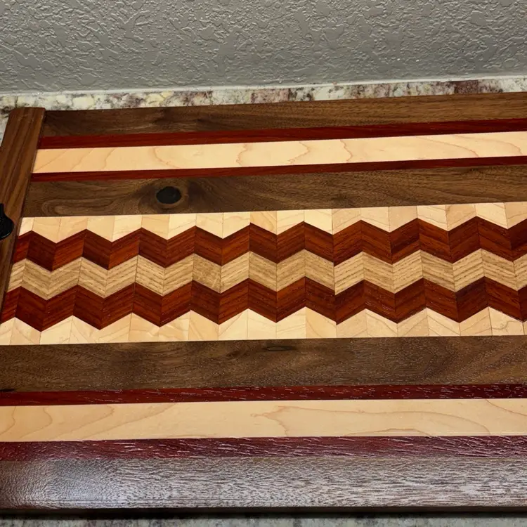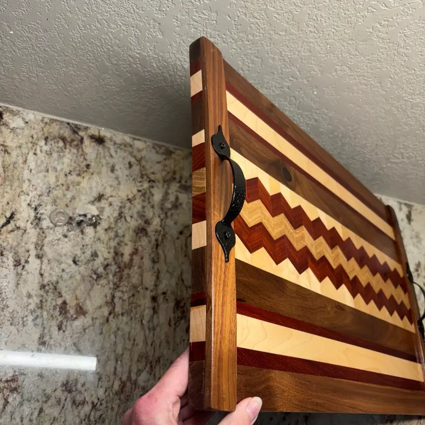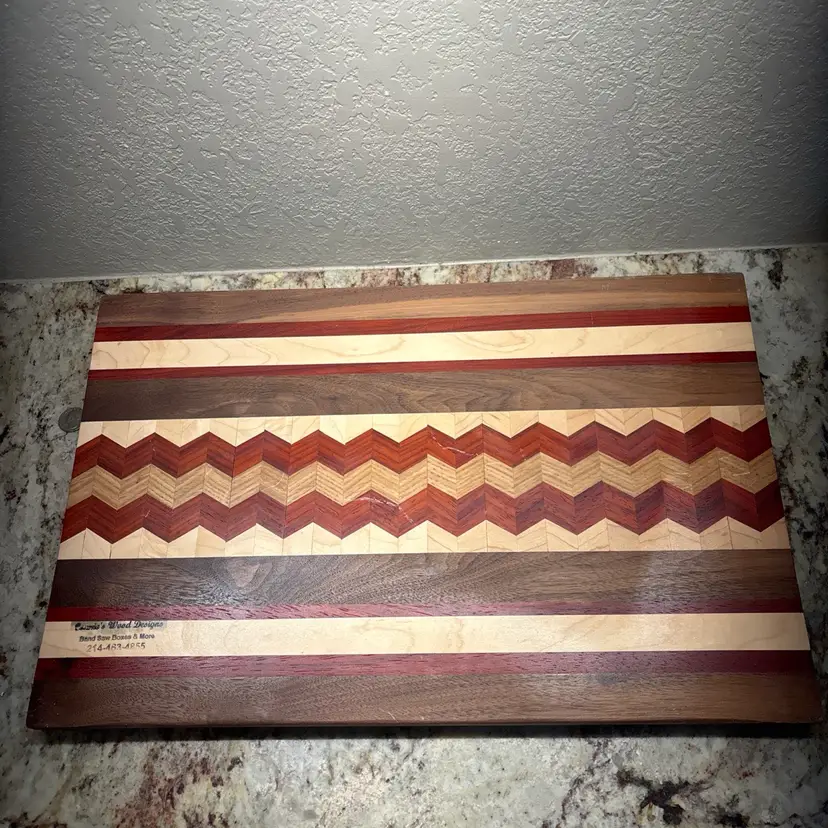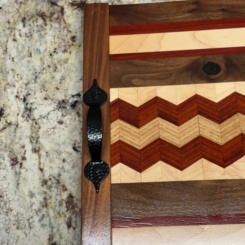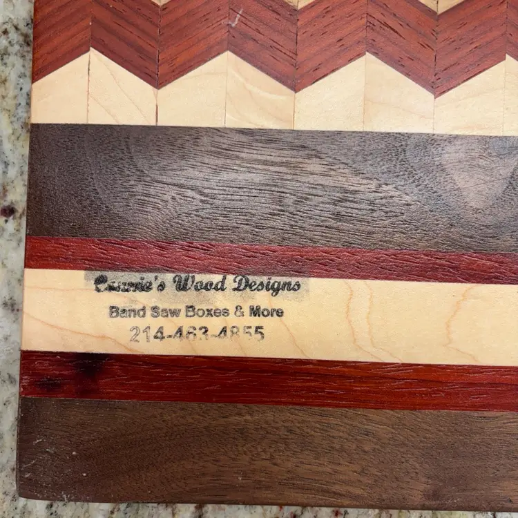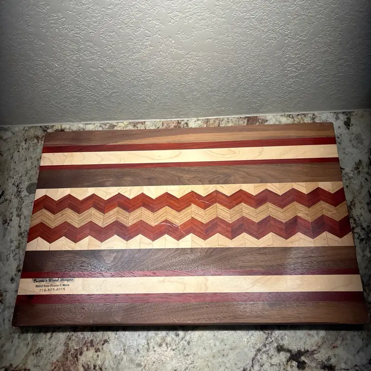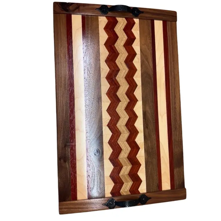 This OOAK custom hardwood 3D charcuterie cutting board is a large, rectangular serving board artisan crafted with a multicolor design. Handmade in the United States, this unique piece is a display-only board made of wood, measuring 21-25 inches in length and 10-15 inches in width, weighing 5.25 lbs. Perfect for showcasing your favorite cheeses, meats, and breads in an artistic and visually appealing manner. Used as display only, some wear on bottom see pics.