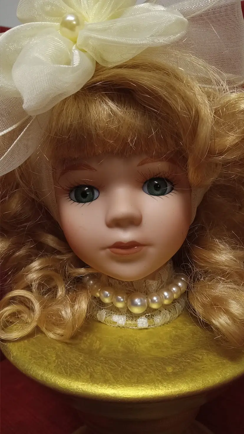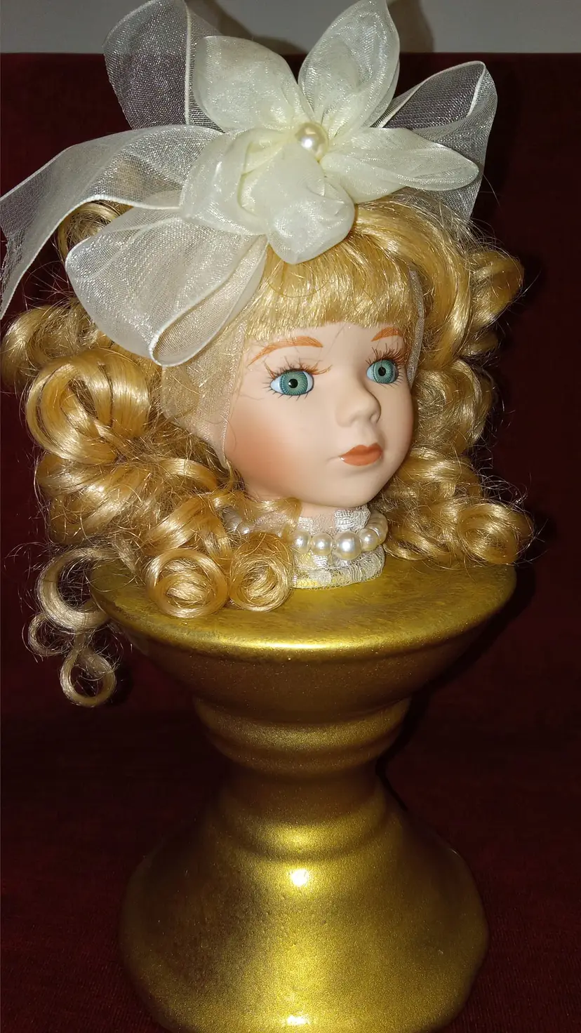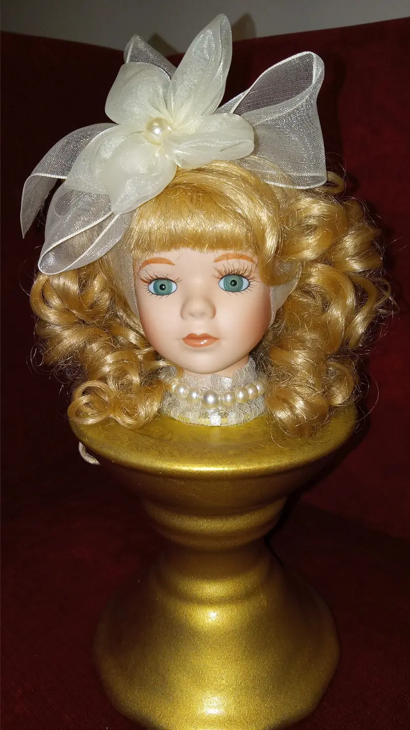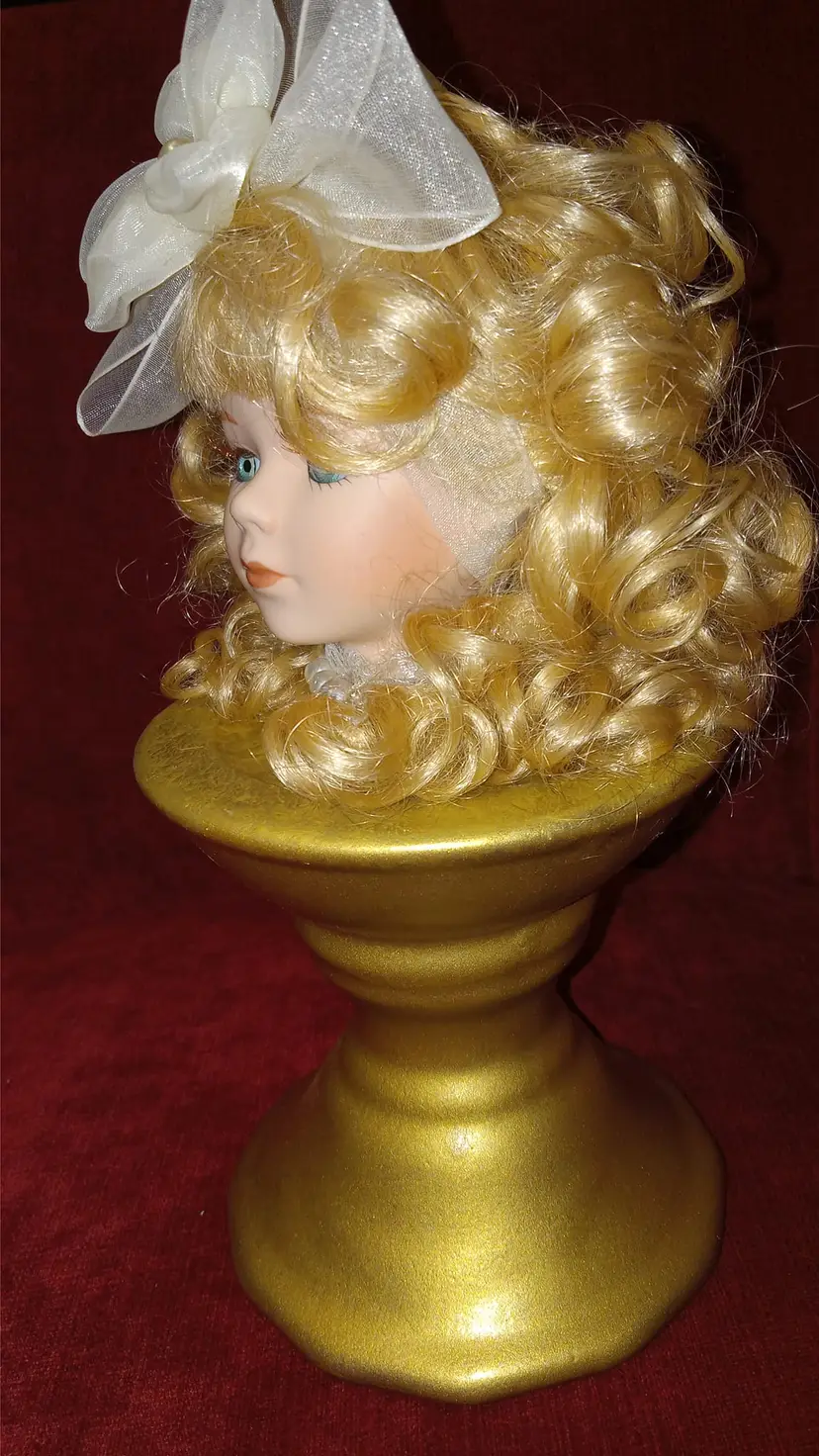 Upcycled from a vintage porcelain doll, she has original and all new materials. Tumbling blonde curls with an off-white/champagne colored bow and off-white pearls. Gold painted ceramic base. For those of us who enjoy Halloween all year round, she can be displayed all year. About 10 inches tall.