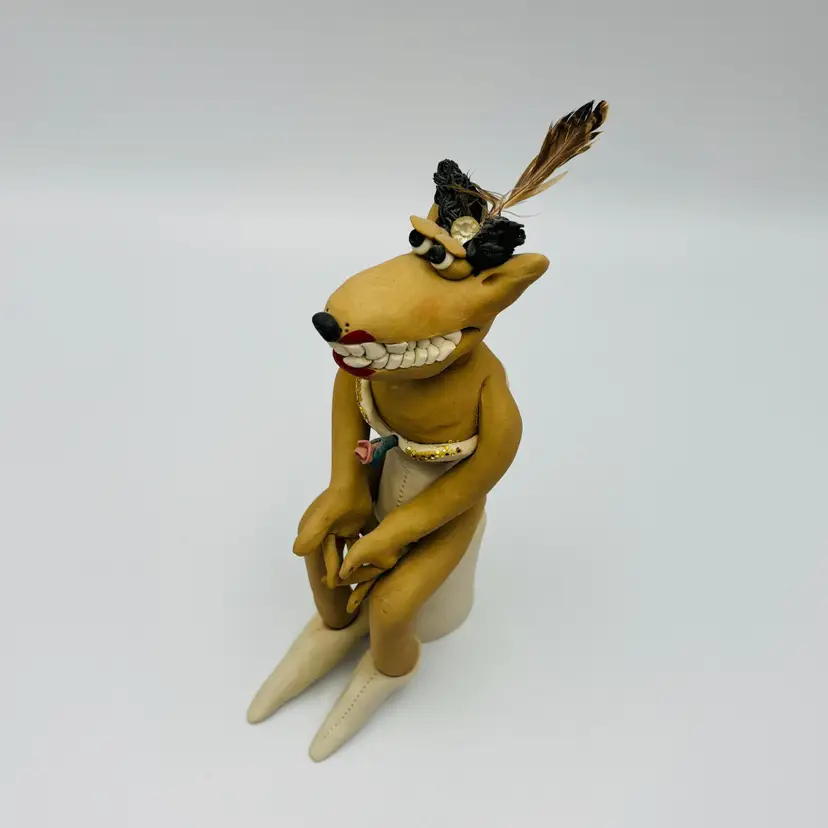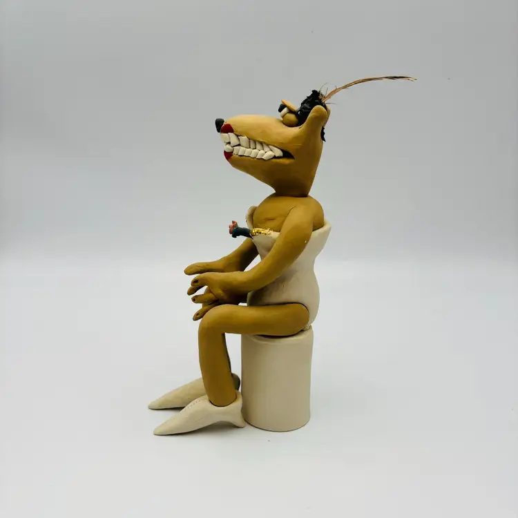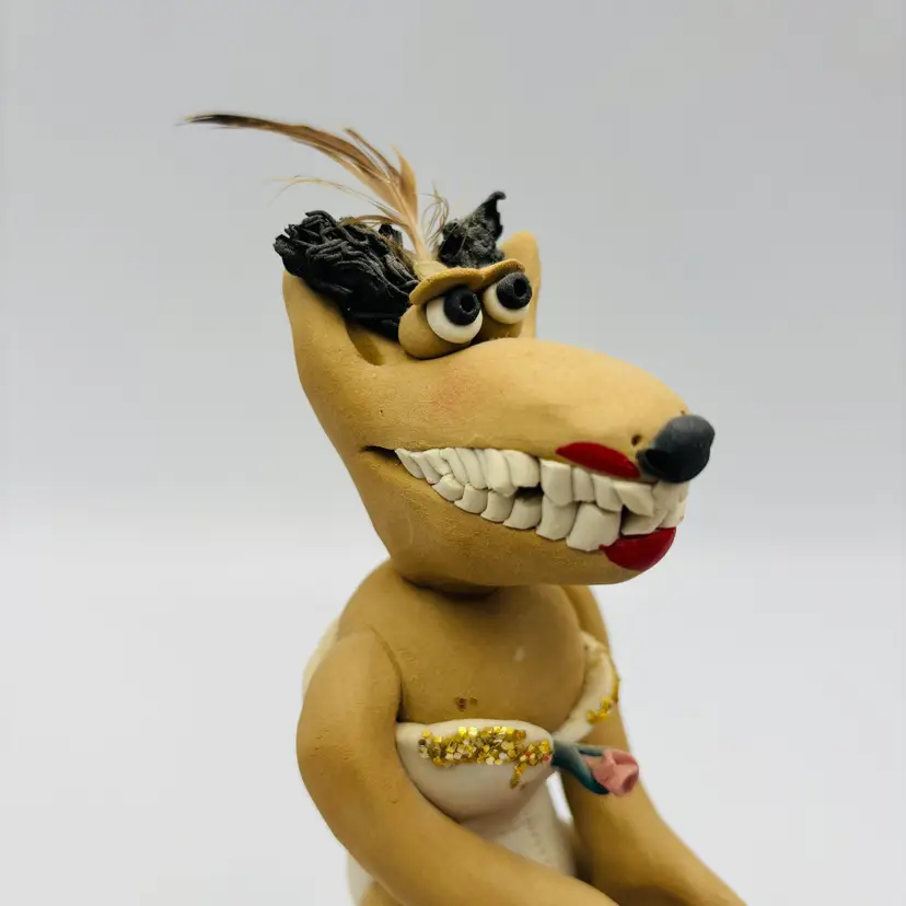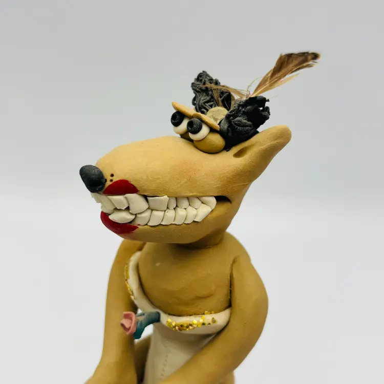 Features: it is unsigned, it features a clay sculpture resembling a dog head with a human body. It dons red lipstick, teeth showing as if grinning with big eyes and thick eyelashes. She is wearing a feather "headdress" and a body suit with glitter and a flower. She is sitting on a round, hollow stool.
