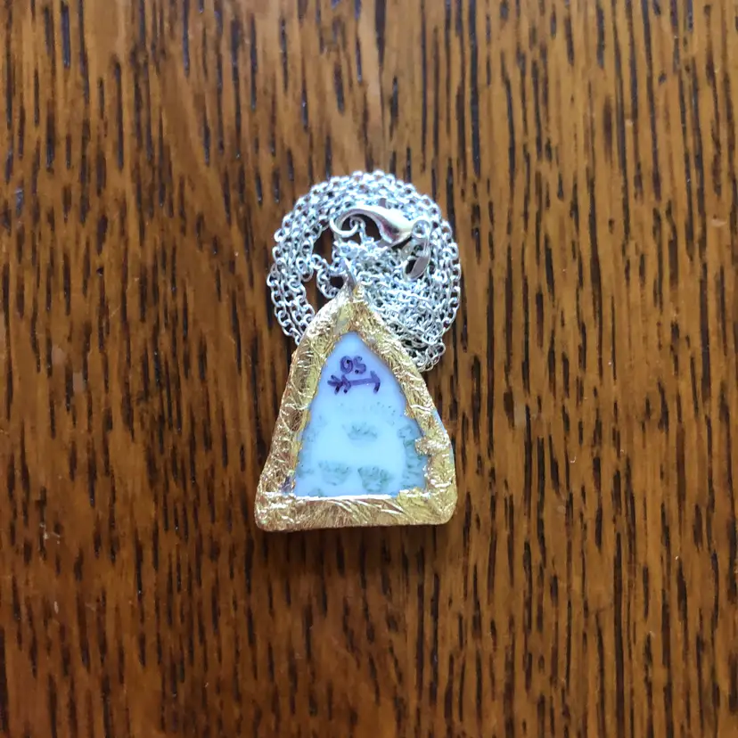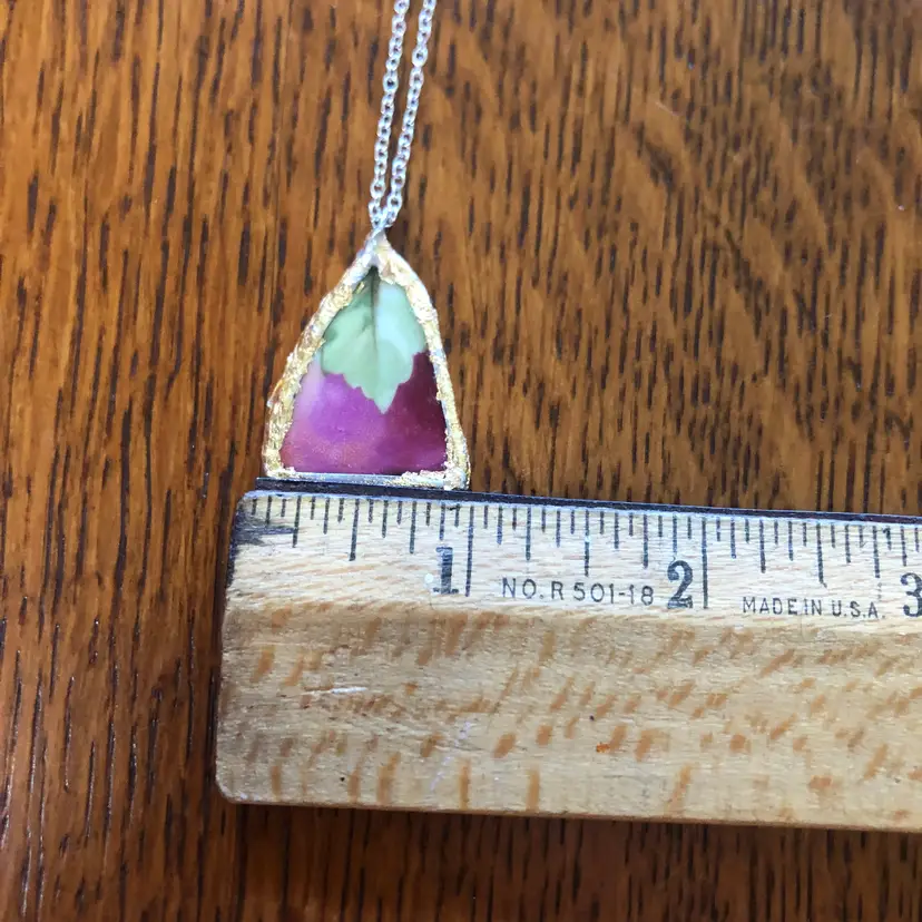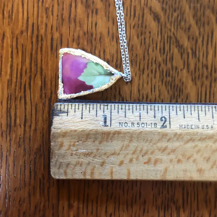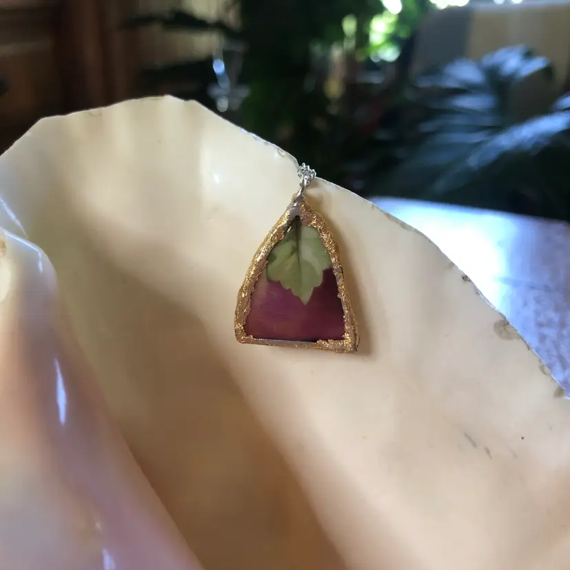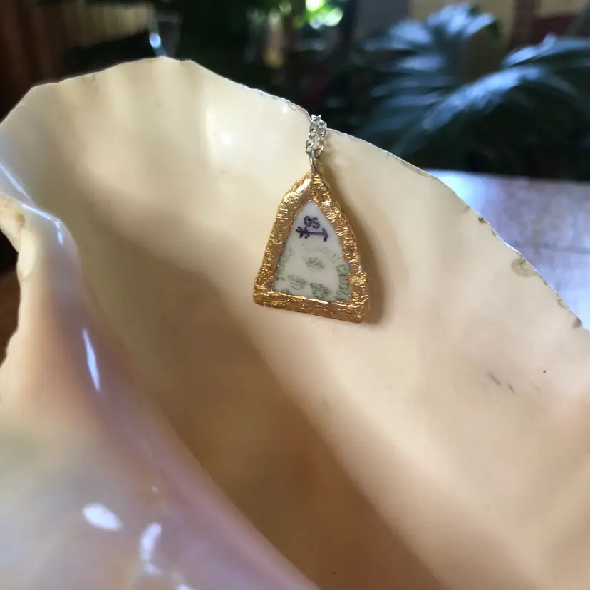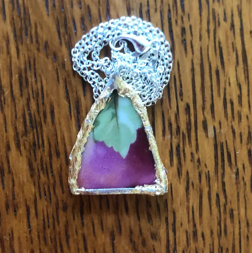 Stand out with this artisan necklace, featuring a striking apple pendant crafted from broken Three Crown China plate. Measuring 7/8 inch by 1 inch, this handcrafted piece transforms shattered pottery into bold, wearable art that challenges convention and showcases fearless originality. Perfect for those who dare to be different.