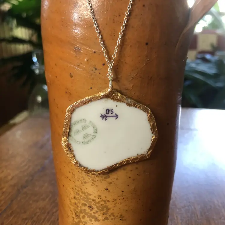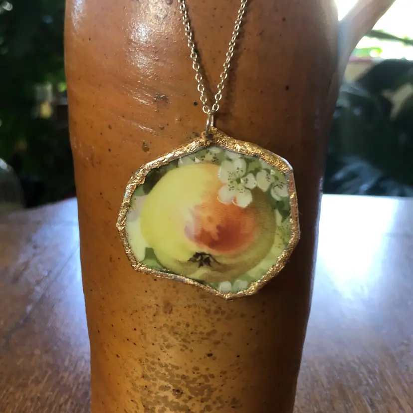 Celebrate the cozy charm of fall with this artisan-crafted apple pendant necklace. Made from a piece of a Three Crown China plate, the 2" x 1.75" pendant captures the warm, nostalgic spirit of the season. Handcrafted with care, it’s a unique accessory that brings a touch of autumn’s beauty to your everyday look.