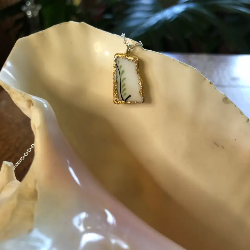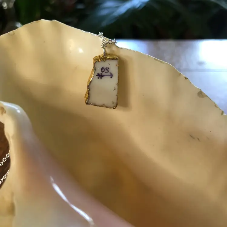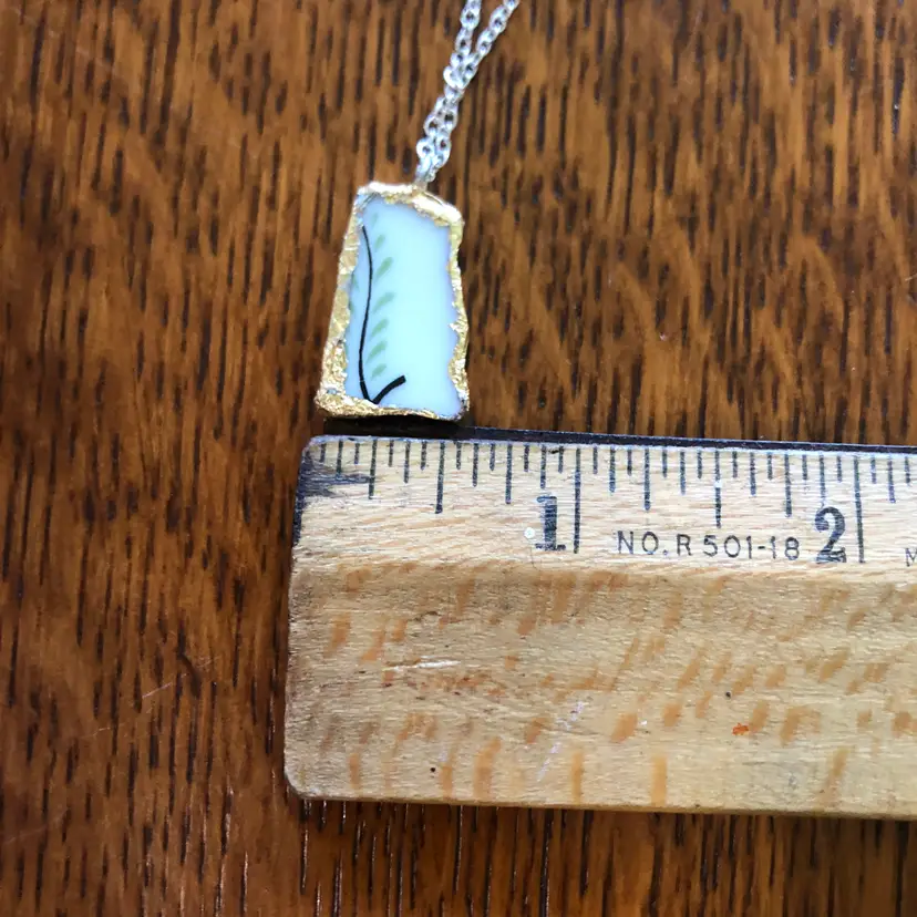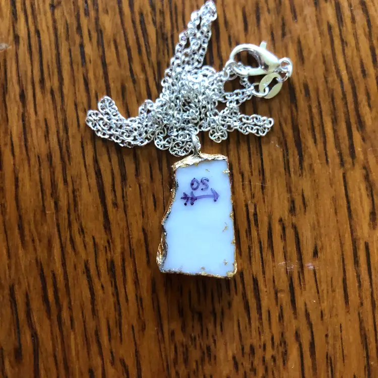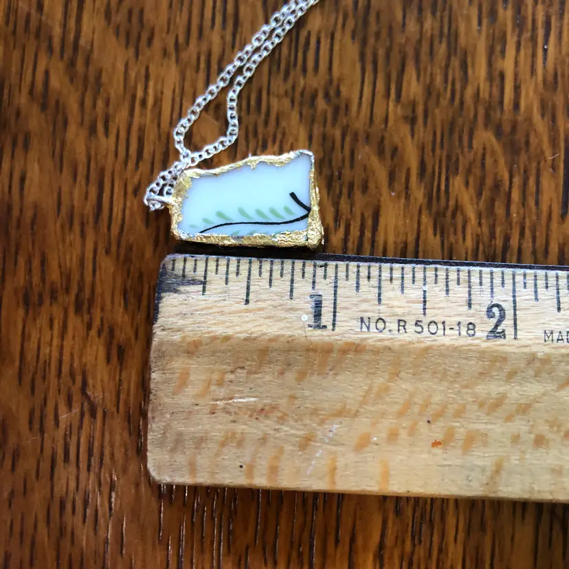 Brighten up your look with this playful necklace featuring a tiny, handcrafted pendant made from broken pottery adorned with whimsical rosemaling art. Measuring just 1/2 inch by 3/4 inch, this unique piece turns a little piece of history into wearable fun—perfect for adding a splash of charm to any outfit!