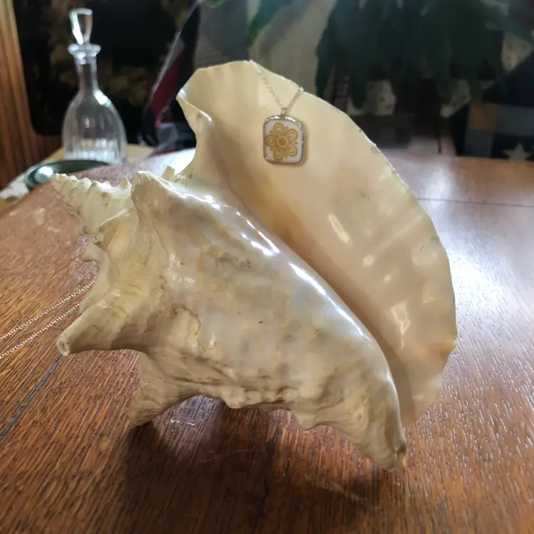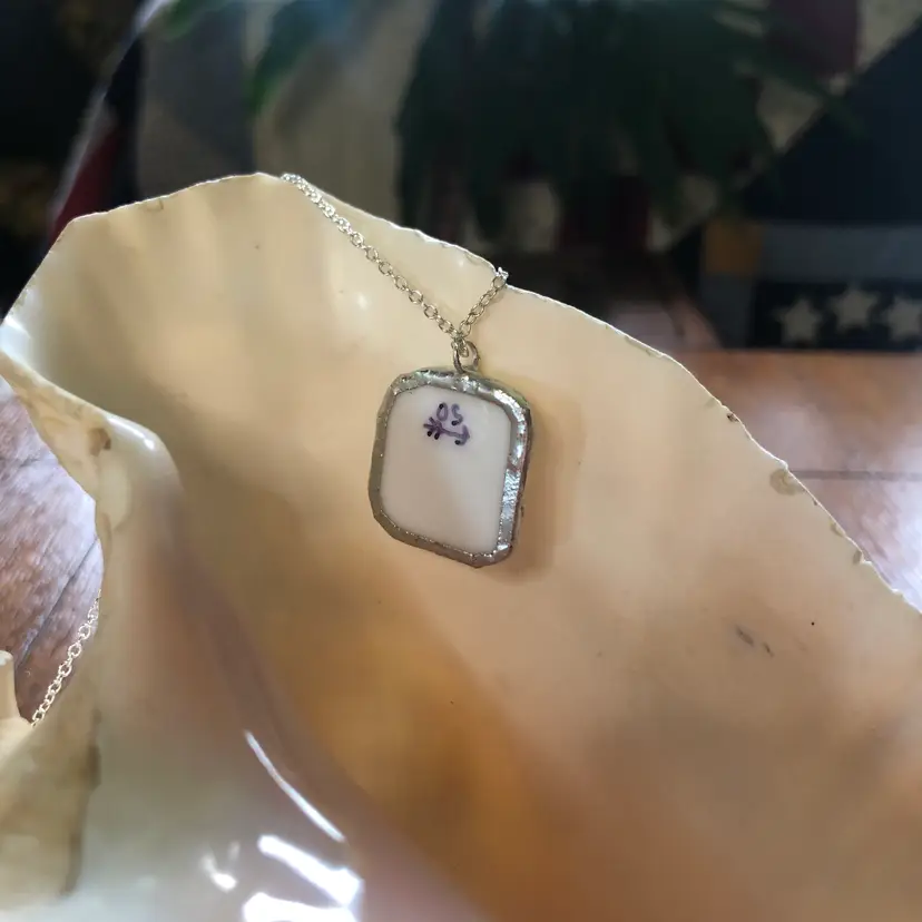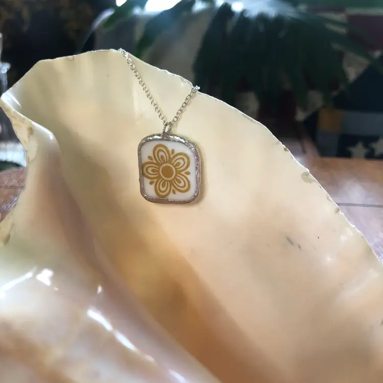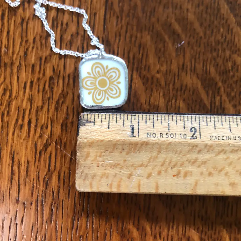 This charming necklace features a handcrafted pendant made from a broken Corelle plate, showcasing a delicate design. Measuring 7/8 inch by 7/8 inch, each piece is unique, turning vintage elegance into wearable art that sparks joy and conversation wherever you go. Add a playful touch of history and whimsy to your jewelry collection with this one-of-a-kind accessory.
