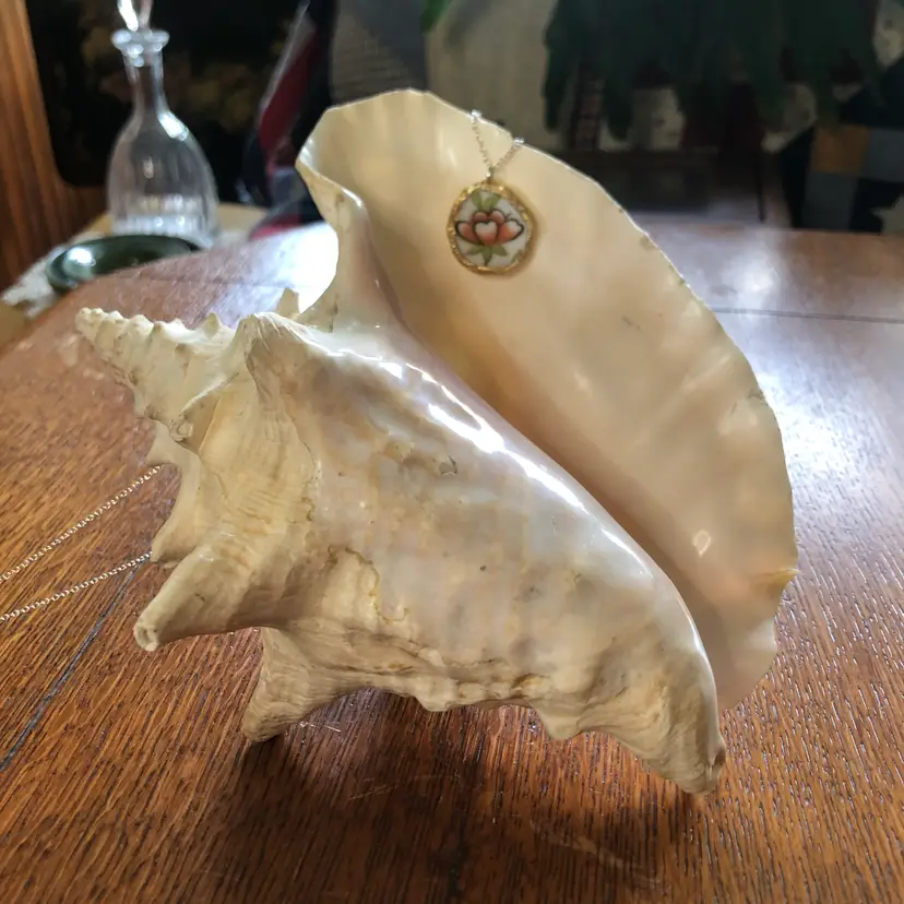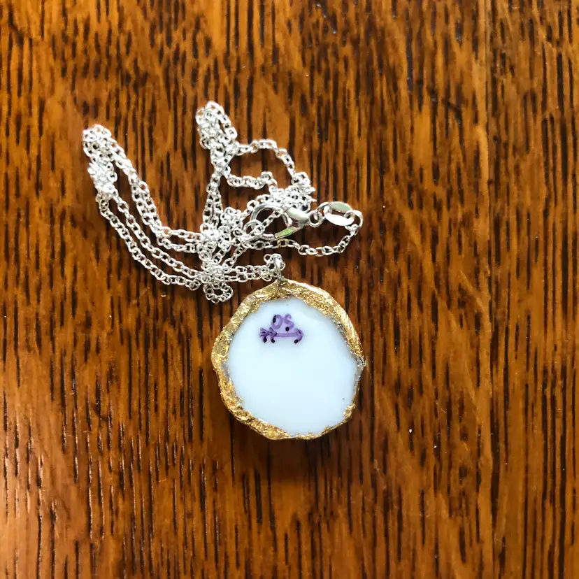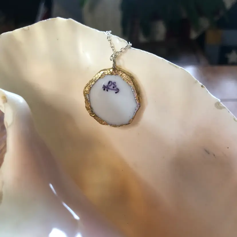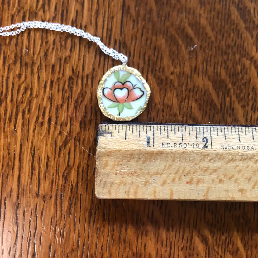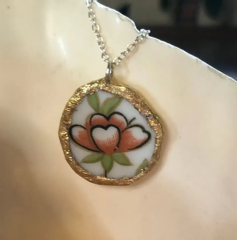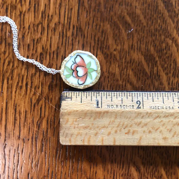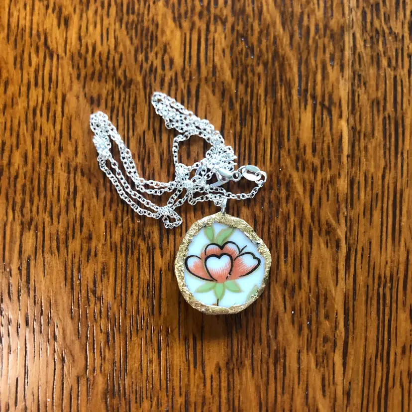 Add a touch of whimsy to your look with this playful, artisan-made pendant crafted from a tiny 1in x 1in piece of Aladdin Fine China Fantasia plate. Handcrafted from broken pottery, this necklace is a unique treasure that tells a story. Perfect for those who love charming, one-of-a-kind accessories with a dash of history and a sprinkle of magic.