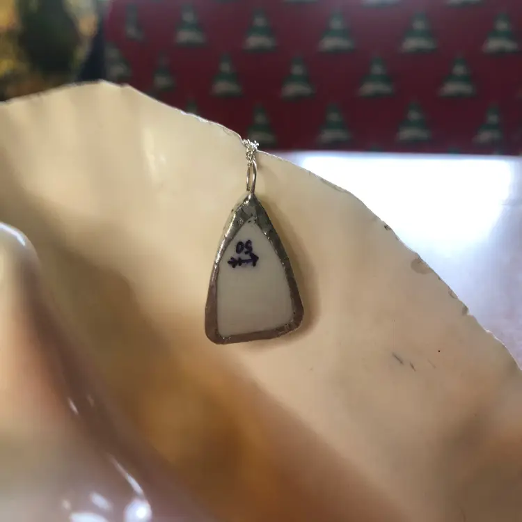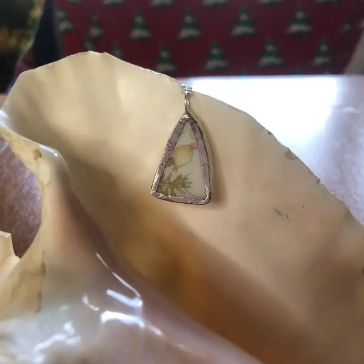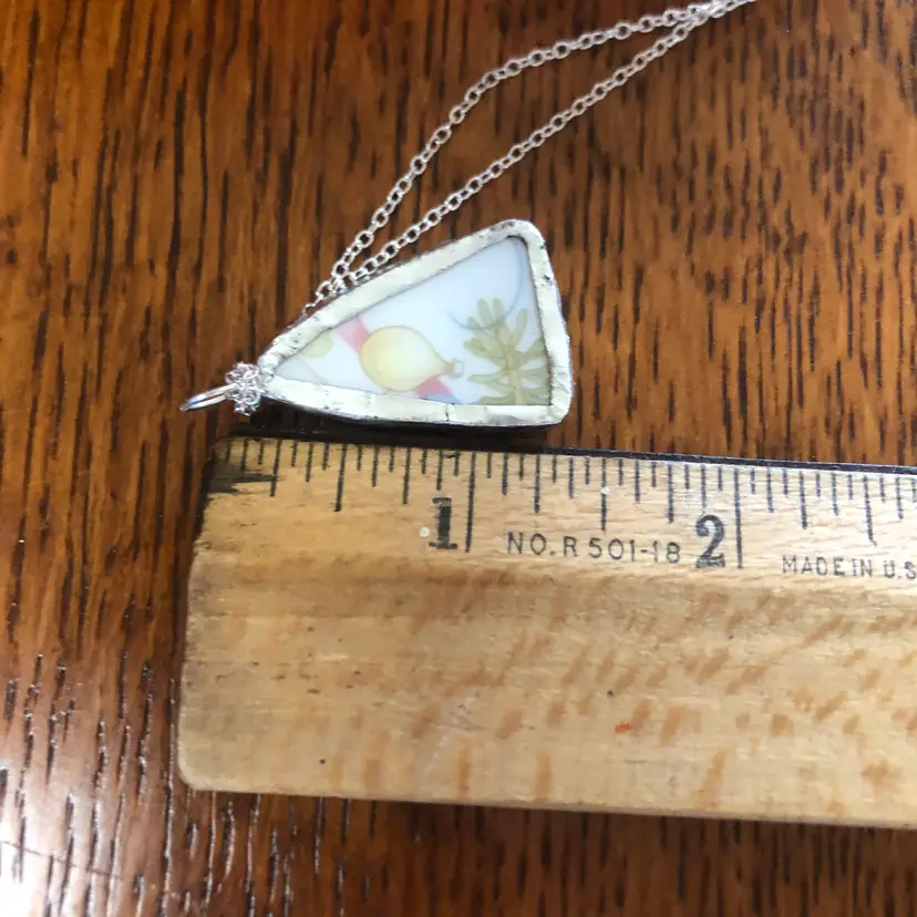 This playful handcrafted necklace features a charming broken pottery pendant crafted from a Wedgwood Peter Rabbit collector plate. Measuring 7/8 inch by 1.25 inch, this balloon pendant brings a unique touch of whimsy to your style. Perfect for lovers of vintage art and one-of-a-kind accessories.