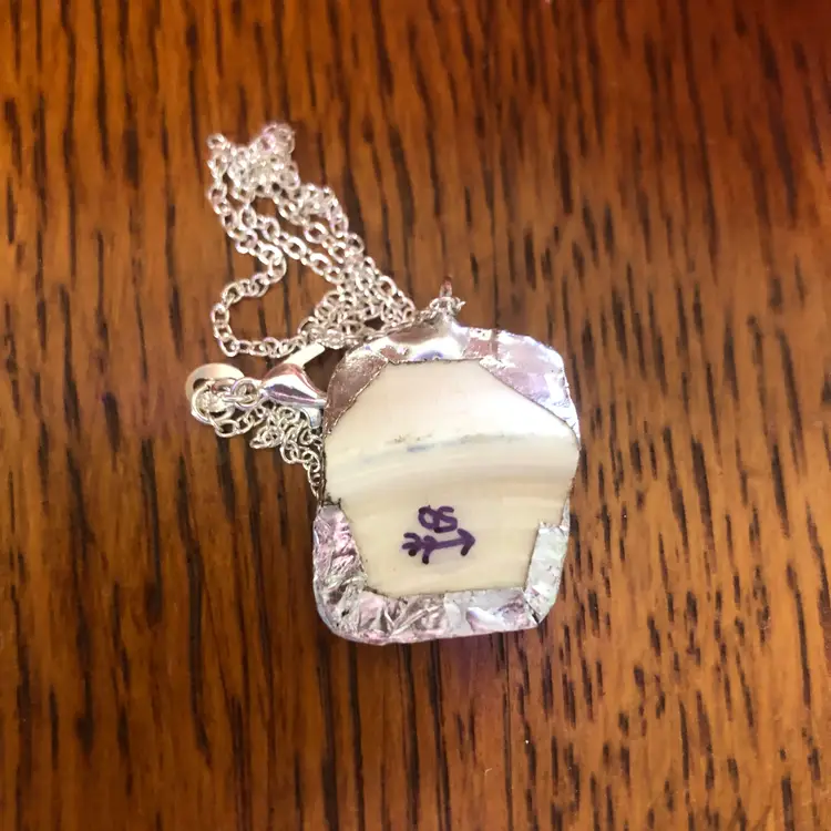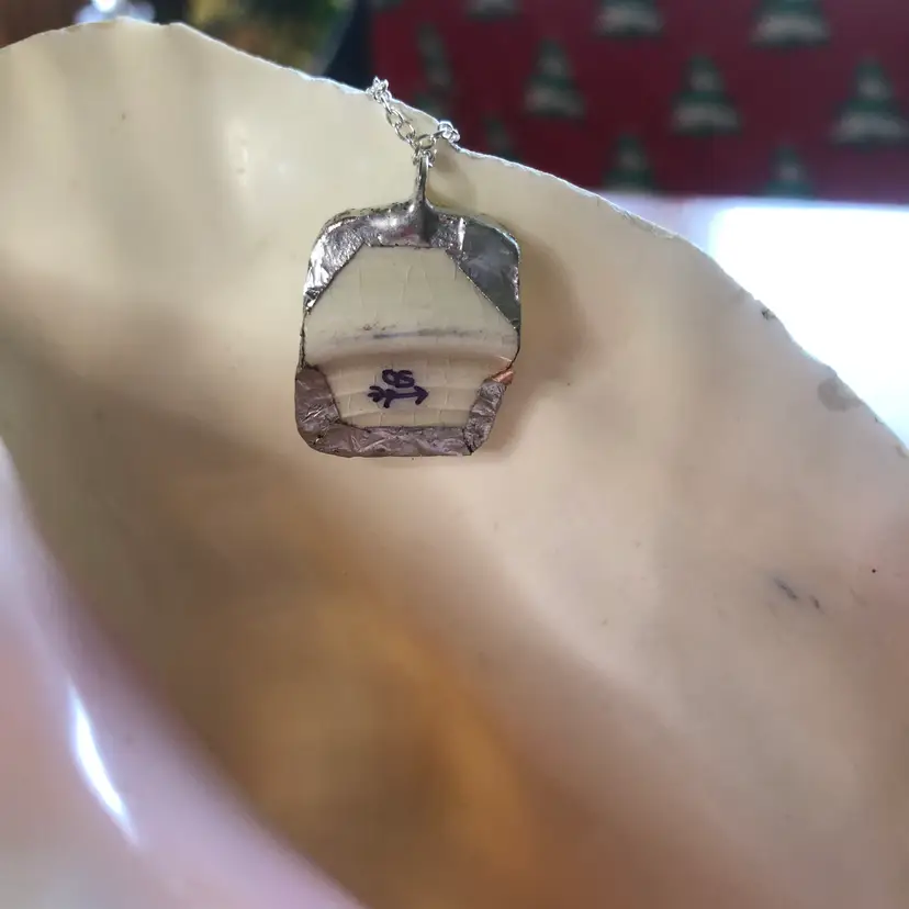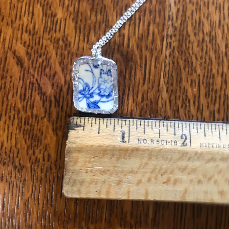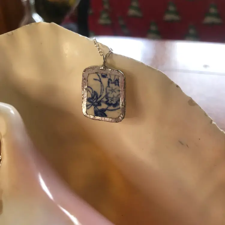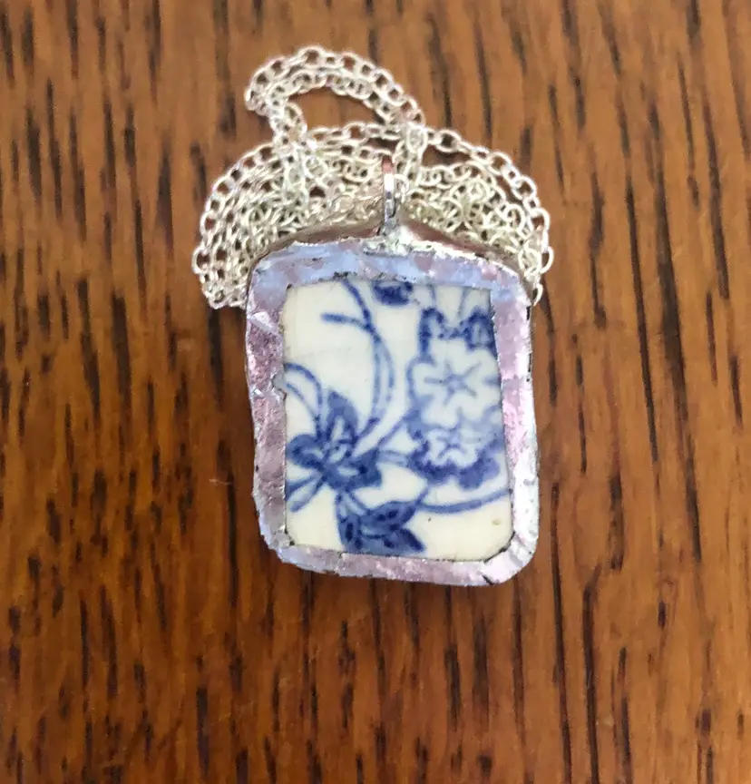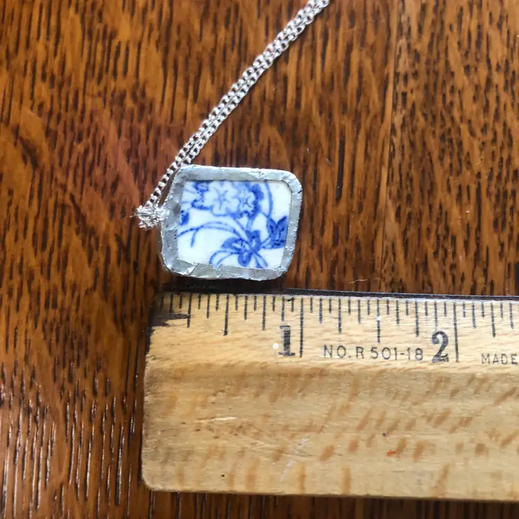 Add a splash of charm with this whimsical pendant crafted from a broken blue floral plate! This handcrafted necklace is a tiny treasure, measuring just 3/4 by 1 inch, turning pottery shards into playful wearable art. Perfect for anyone who loves a touch of vintage magic and unique style. Embrace your quirky side and wear a story around your neck!