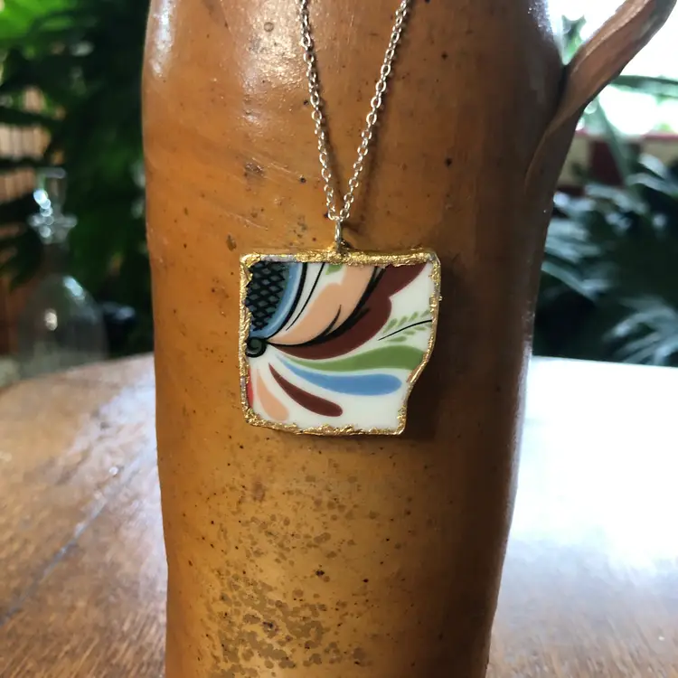 Wear a piece of pottery history! This one-of-a-kind pendant transforms a broken rosemaling plate into wearable art. Each handcrafted necklace celebrates beauty, featuring authentic artisan details and traditional folk-painted patterns. Perfect for pottery lovers, bohemian souls, and anyone who believes broken things tell the best stories. A tiny treasure that sparks conversations.