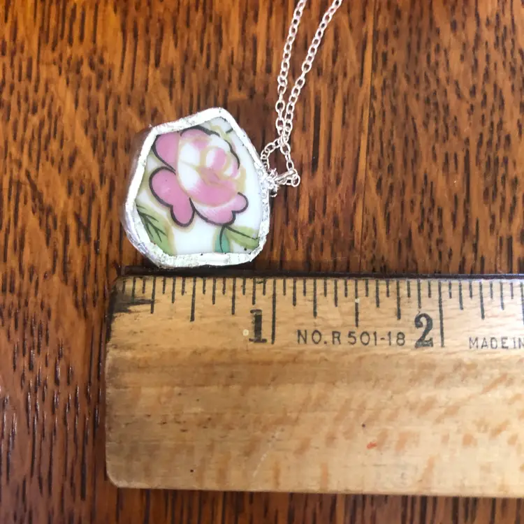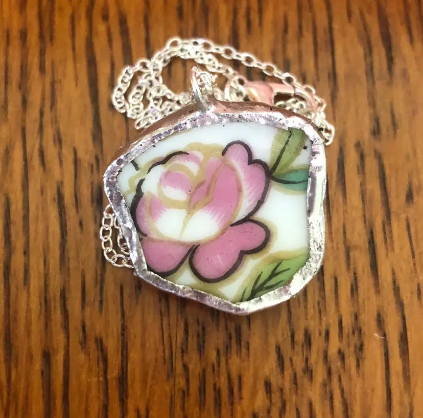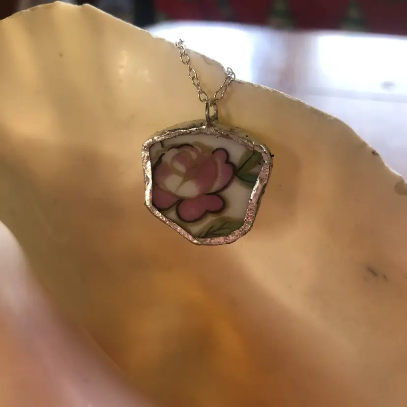 Add a whimsical touch to your look with this artisan-crafted pendant made from a charming piece of an Aladdin Fine China Fantasia plate. Measuring a delicate 1 inch by 1 inch, this handcrafted necklace turns a broken treasure into a playful accessory that’s as unique as your story. Perfect for those who love a little magic and history!
